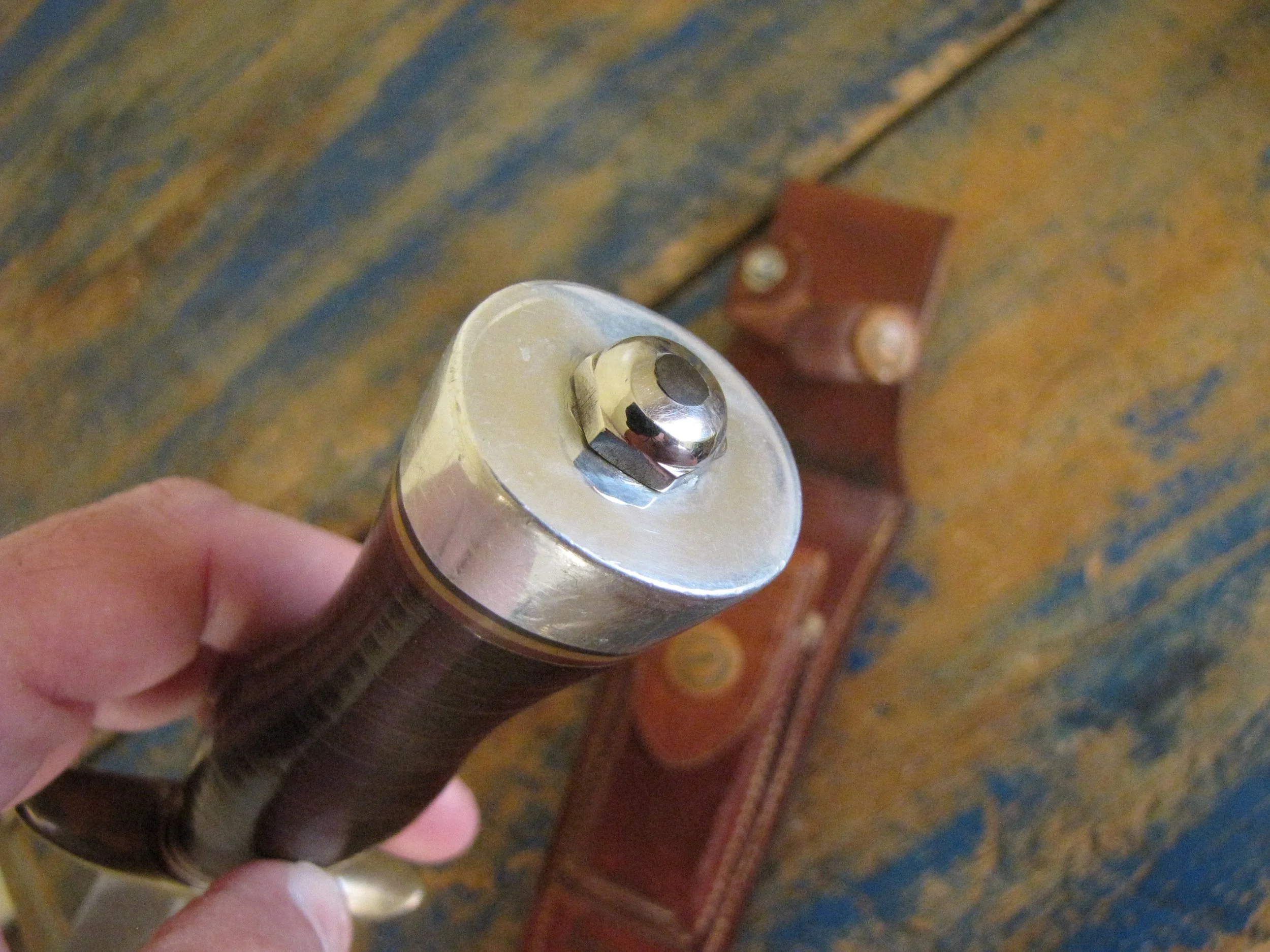 A fabulous early example in near pristine unused condition. Compete with correct Heiser Brown Button Sheath and Norton two part stone. Some personal details on the front and back of sheath which are difficult to make out.
