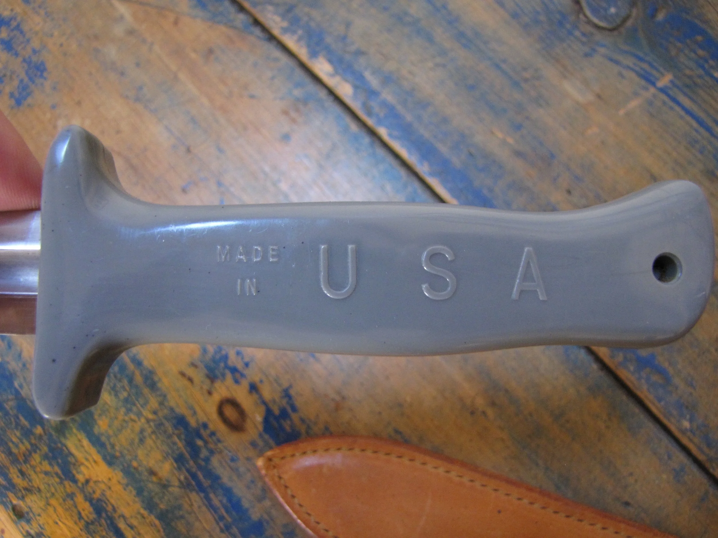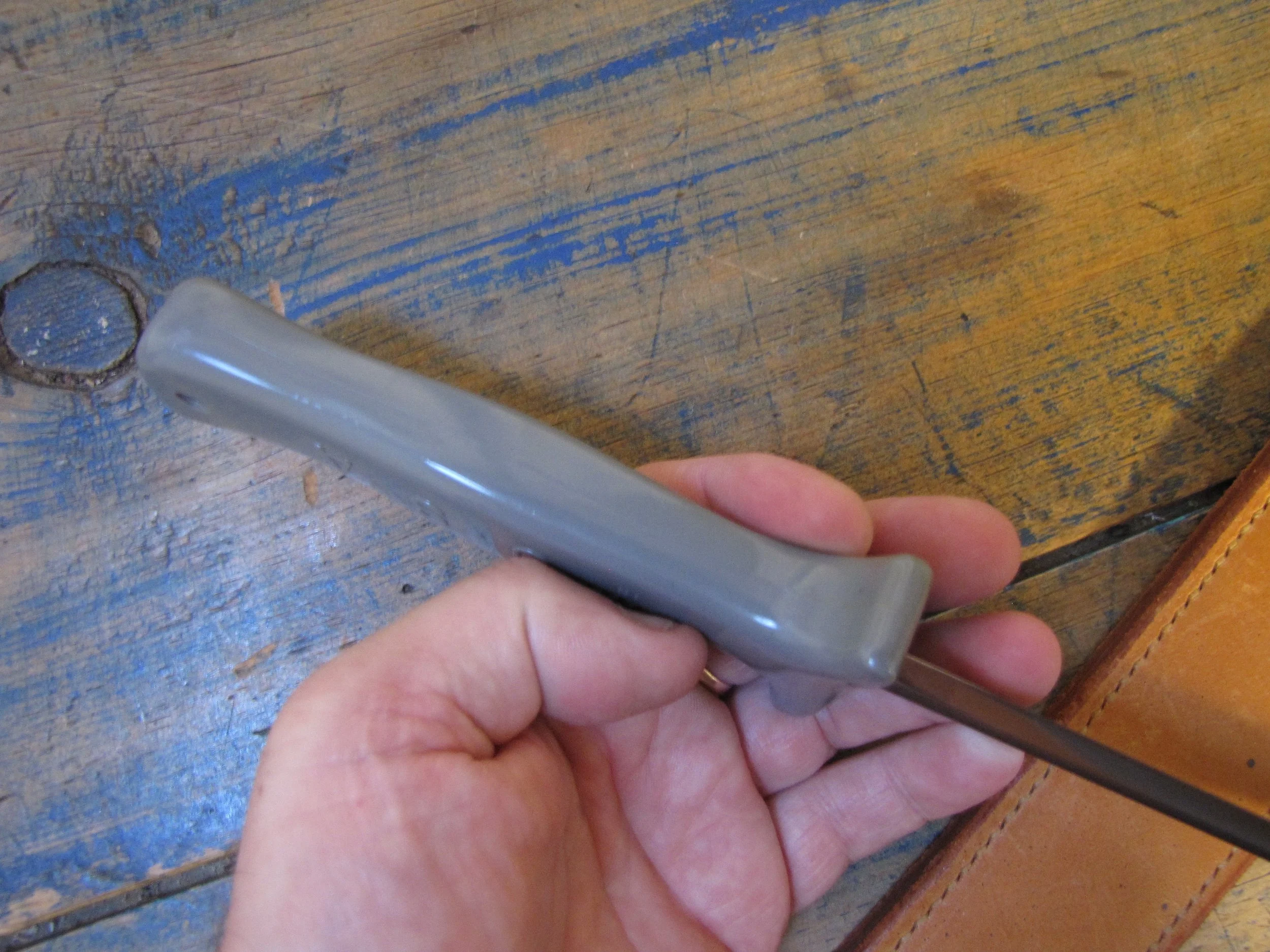 A superb totally unused and completely pristine ‘as-new’ Anderson Stiletto. Made from the mid section of a Patton sword blade. Blade is full length at 8 3/8” and has absolutley no signs of use or sharpening. Correct makers marks on both sides of the grey grip. A stunning example with correct leather sheath.