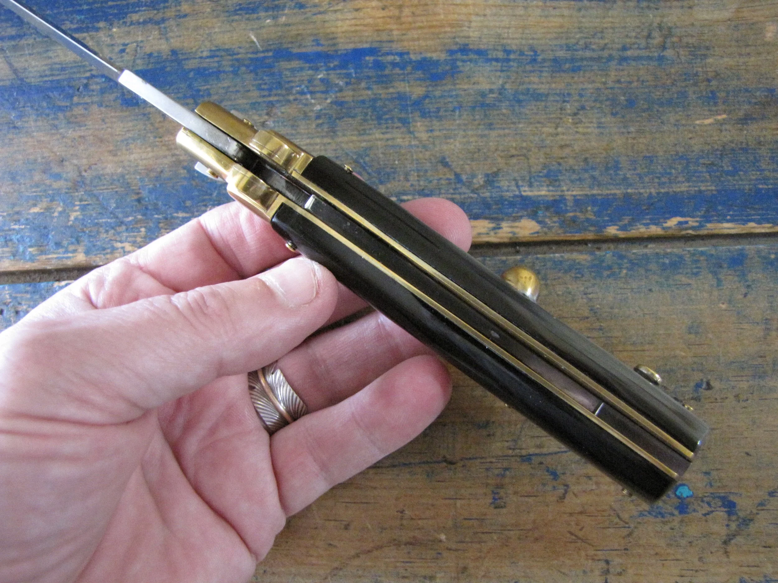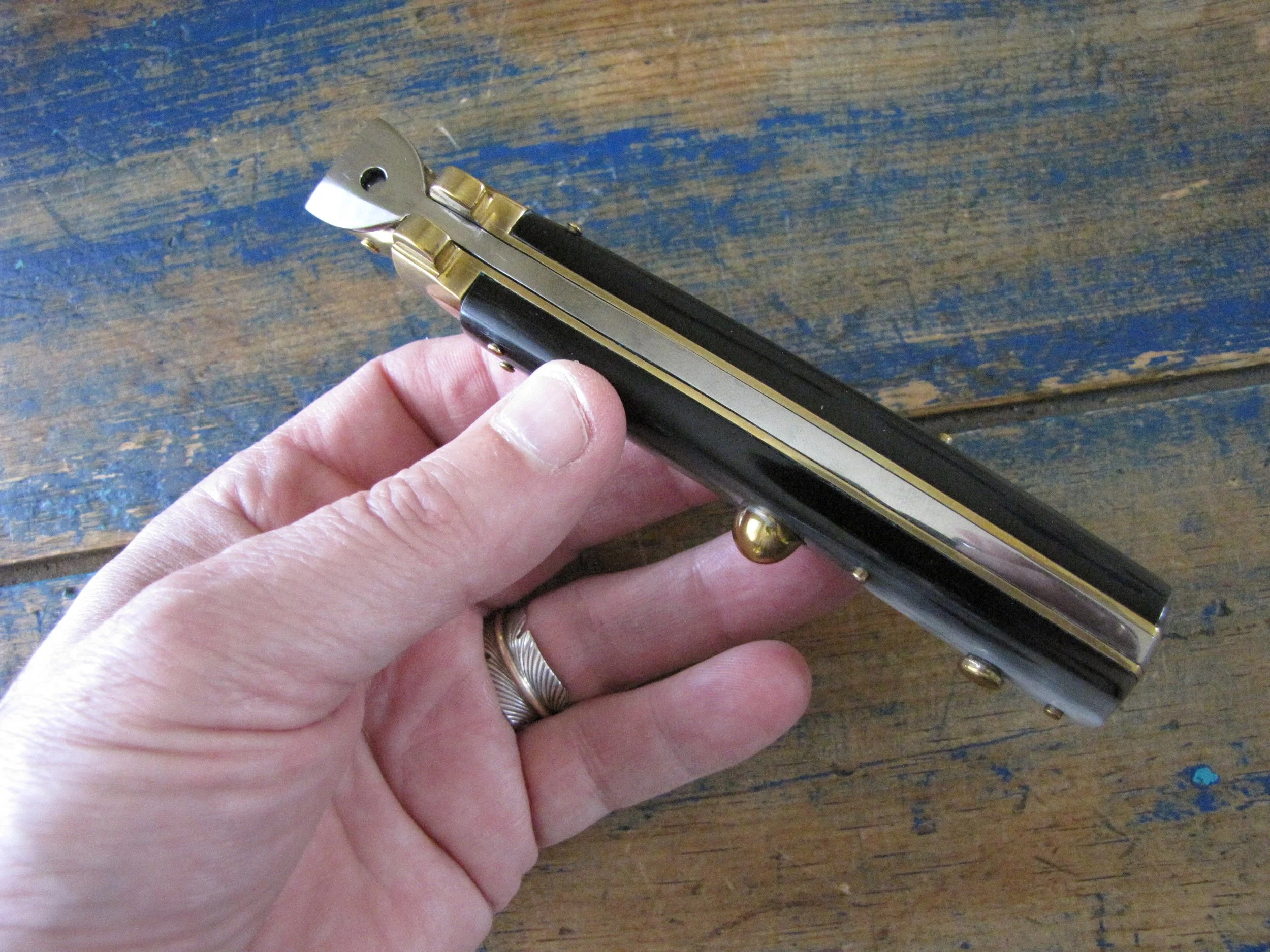 In as new condition, this exquisite Italian picklock switchblade by Renzo Pascotto is in the early Frosolone style. The tuned and polished action works flawlessly. Stunning black and white horn scales. Overall length is 9 7/8” with a 4 1/2” blade. A truly beautiful example by one of the finest contemporary Italian switchblade makers. Stunning in every respect.