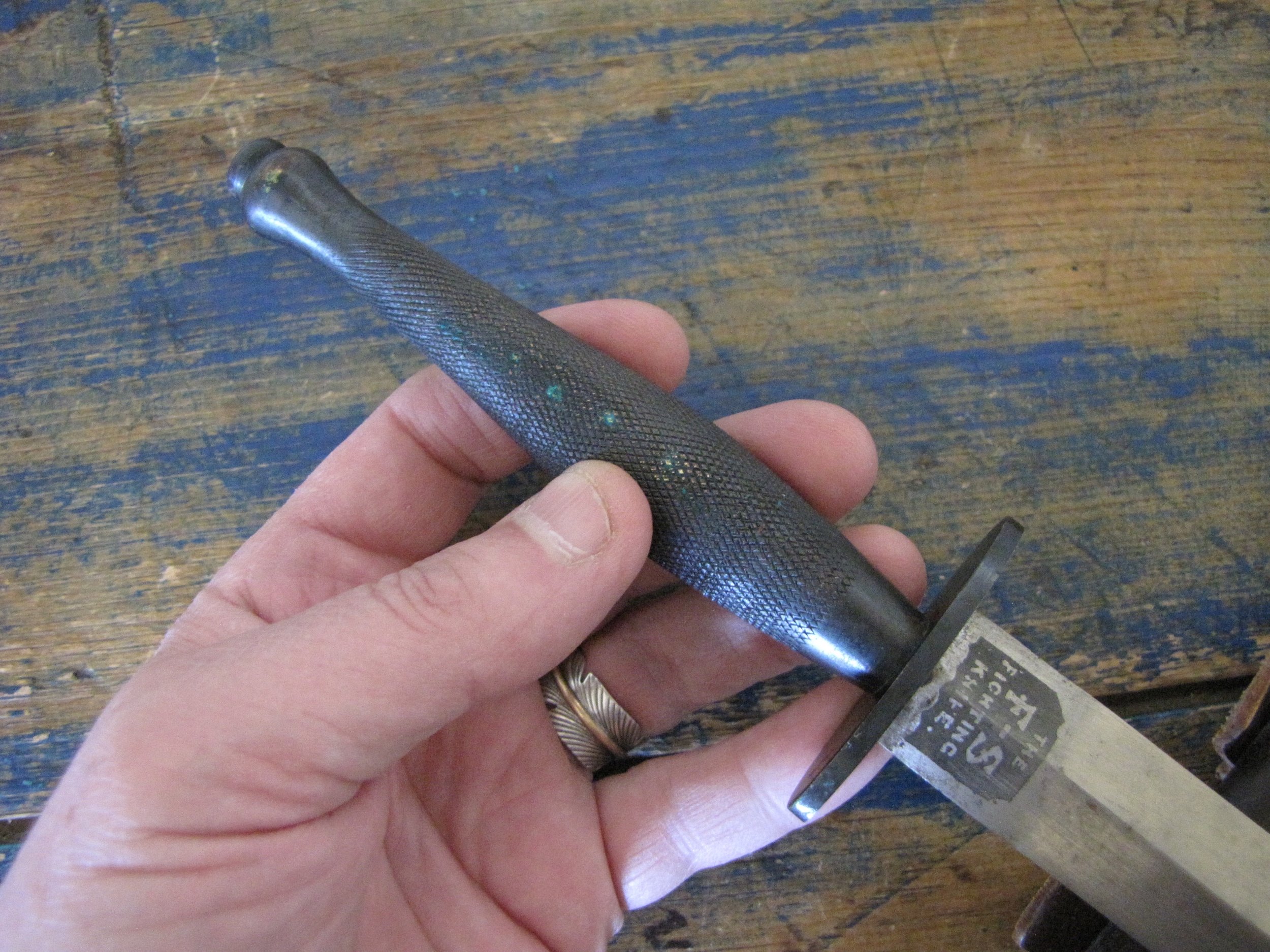 I have to confess, finding knives like this really gets me excited; a totally unused, untouched & uncleaned Wilkinson private purchase, scroll etched Second Pattern F-S Fighting Knife, a real ‘time capsule’. The original and correct scabbard is just about perfect, complete with both wings still attached and the original elastic retaining strap (a little stretched), it looks to have never been used and has the Wilkinson ‘W’ stamp to the rear, indicating waxed/waterproofed - a fabulous original Wilkinson scabbard by any standards. The knife appears totally unused and uncleaned. All three etchings are as strong and as clear as the day they were applied. The privately ordered scroll etching panel to the original owner reads ‘ROBERT G FRADY’. Full length, fabulous blade is at 6 5/8” and retains it’s factory edge, tip and polish, showing just a few very minor age spots. The hilt retains 100% or its original dark finish, showing just a few minor spots of verdigris. Overall, a truly fabulous ‘untouched’ find. When this came in, I just gave it a wipe with some wax to remove the dust and dirt. This is hands-down my favorite way to find a period correct Wilkie.