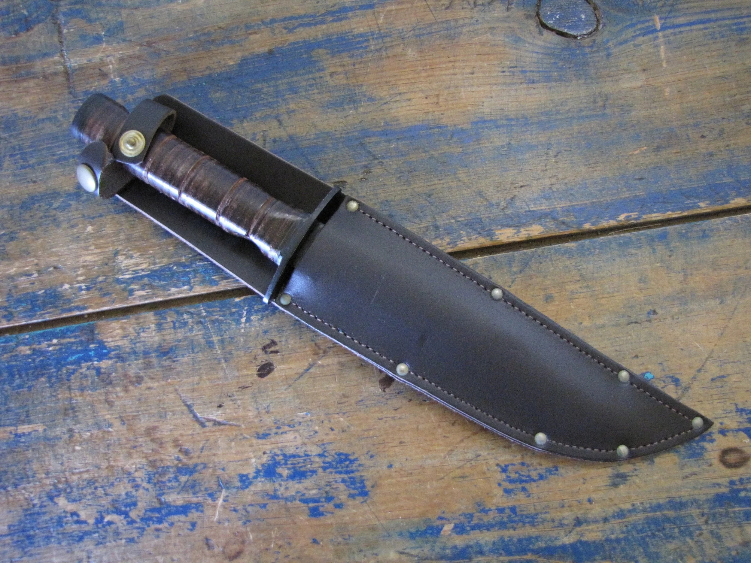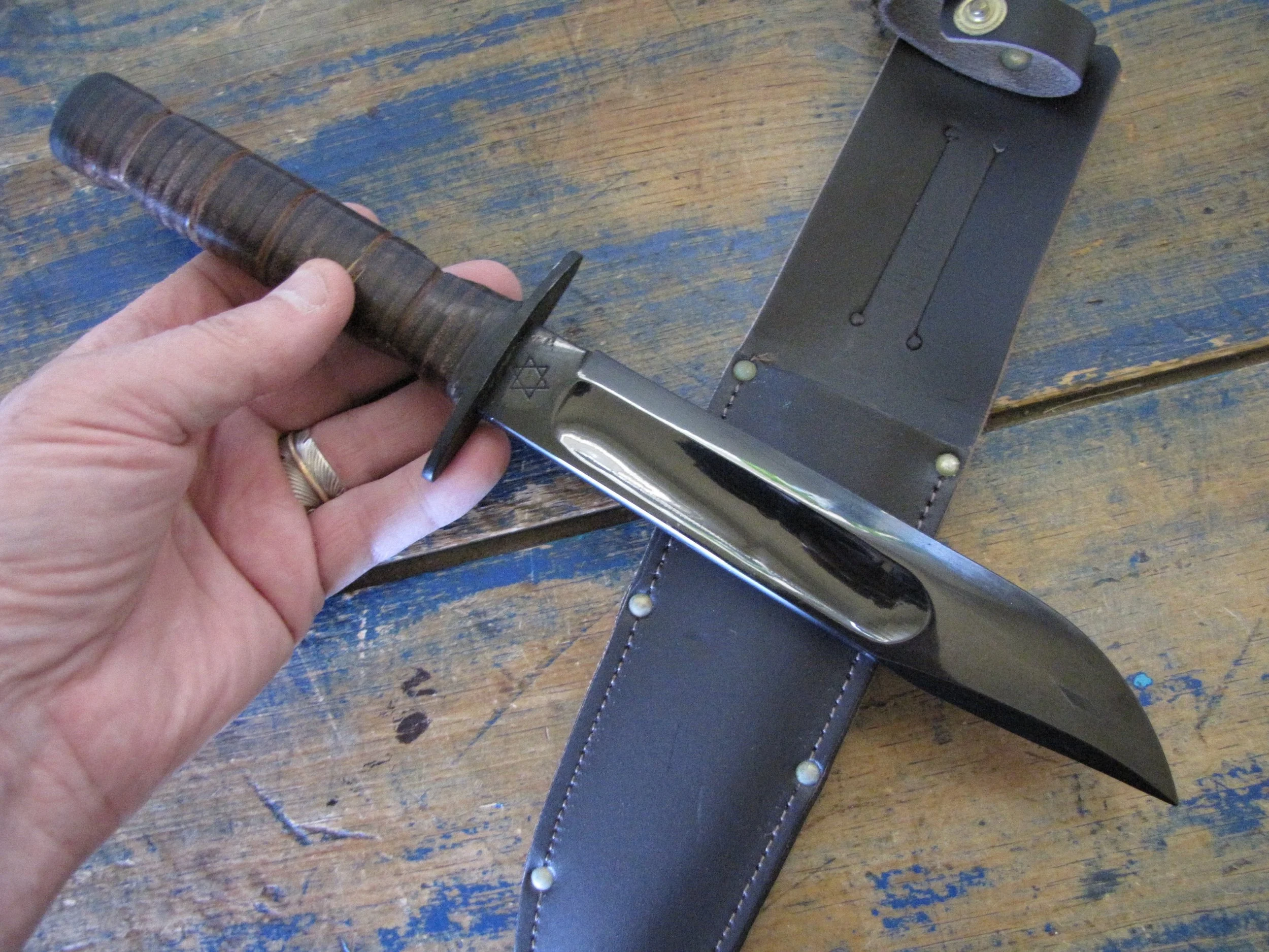 These knives are somewhat of a mystery, often purported to be Israeli Commando knives but I have as yet been unable to confirm this. Made by J. Nowill & Sons of Sheffield England, they are of extremely high quality, heavy, robust and with a beautiful finish to the blade. One side of the ricasso stamped with the maker log, the other carrying the Star of David. Overall length is around 12” with a 6 7/8” blade. Complete with its original leather sheath and in as-new and unused condition.