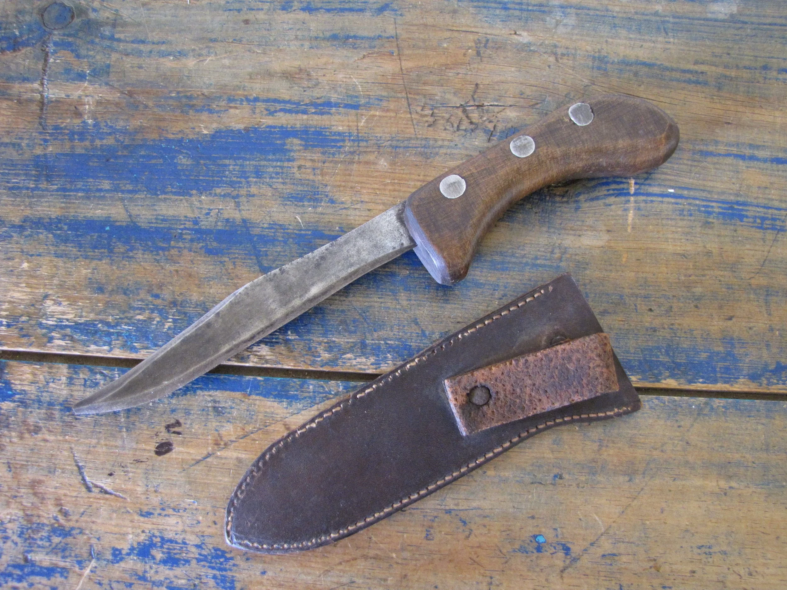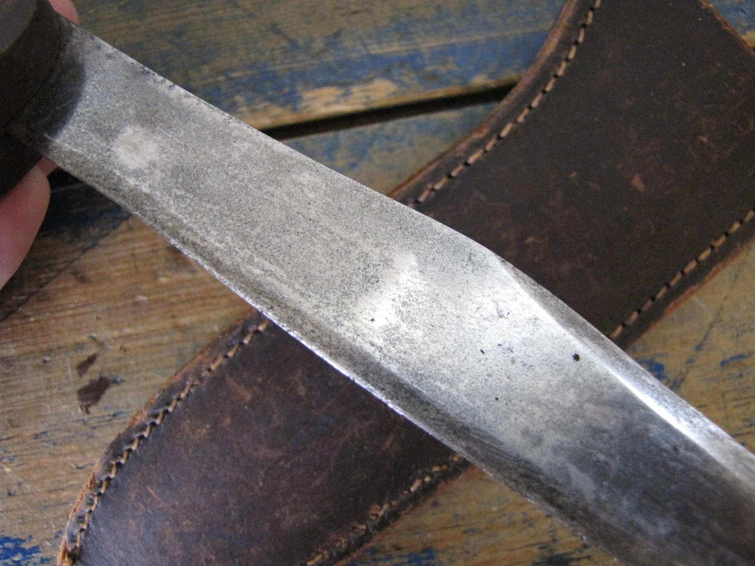 A very early example of a WWII John Ek No5 Navy knife. A well used example but remaining complete with its original and correct leather sheath. These very early knives were hand engraved and this one is no exception, on one side of the blade showing ‘John Ek Knife’ the other side 5329. An old repair to the grip (see pic) and a tiny bit of movement to the wooden scales due to shrinkage, normal on these knives. Overall length is around 12 1/2” with a blade showing a length of around 7”. A well used example but a very scarce early and complete knife.