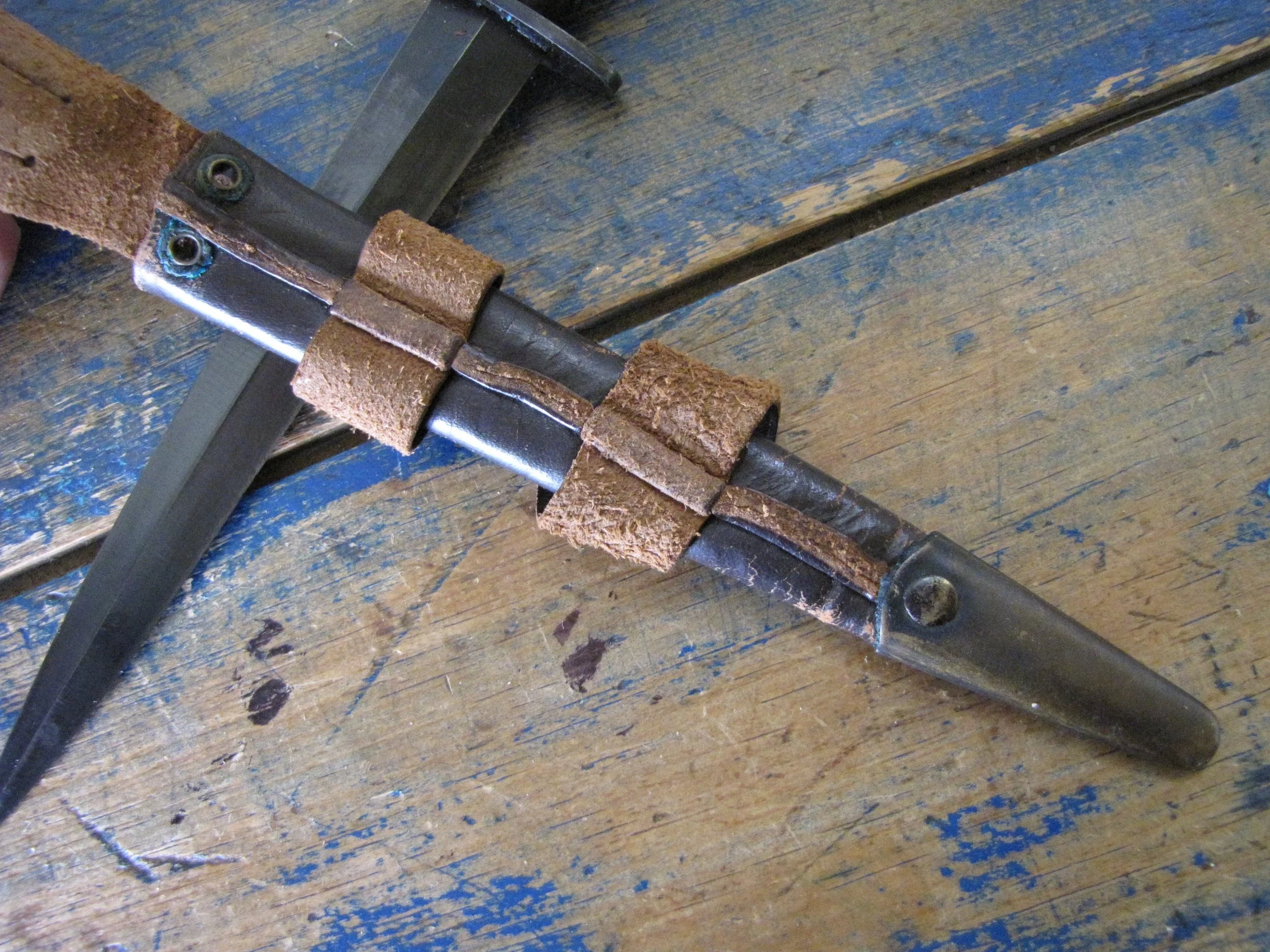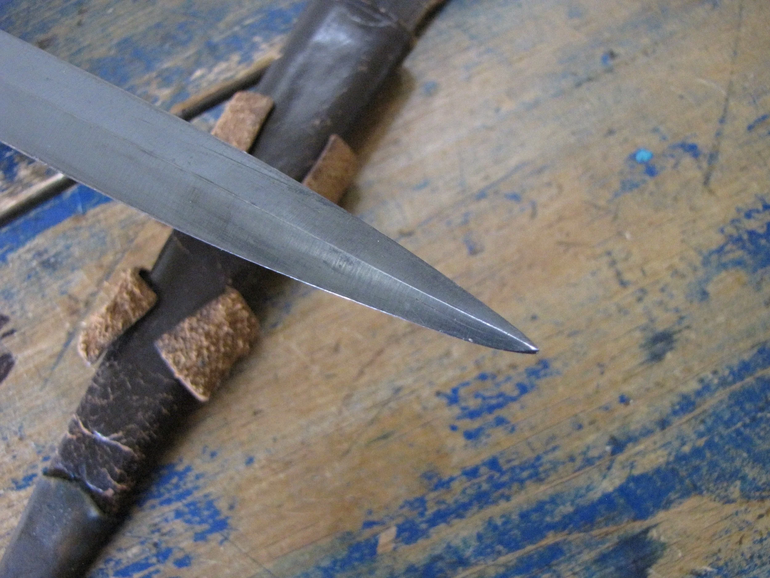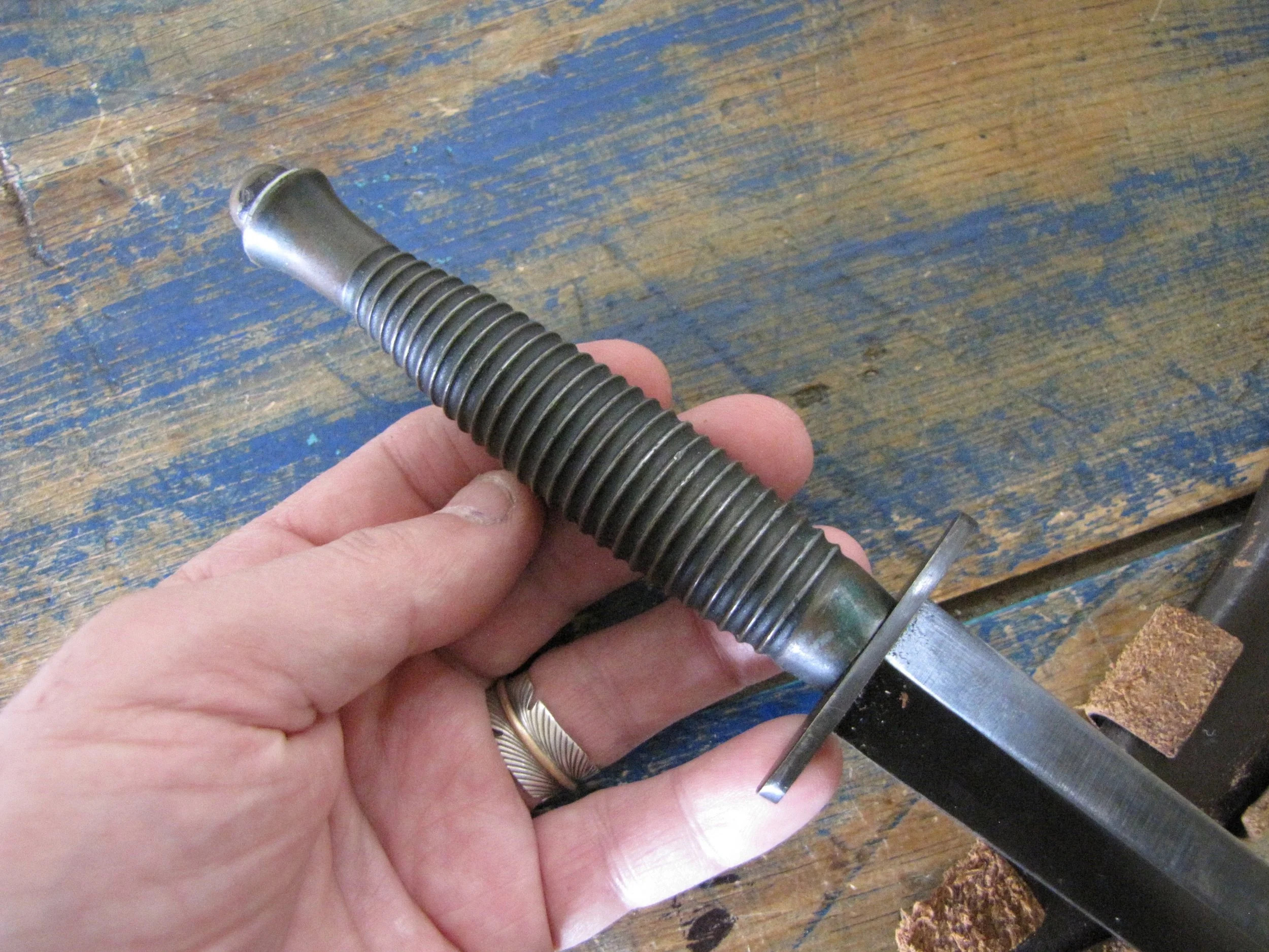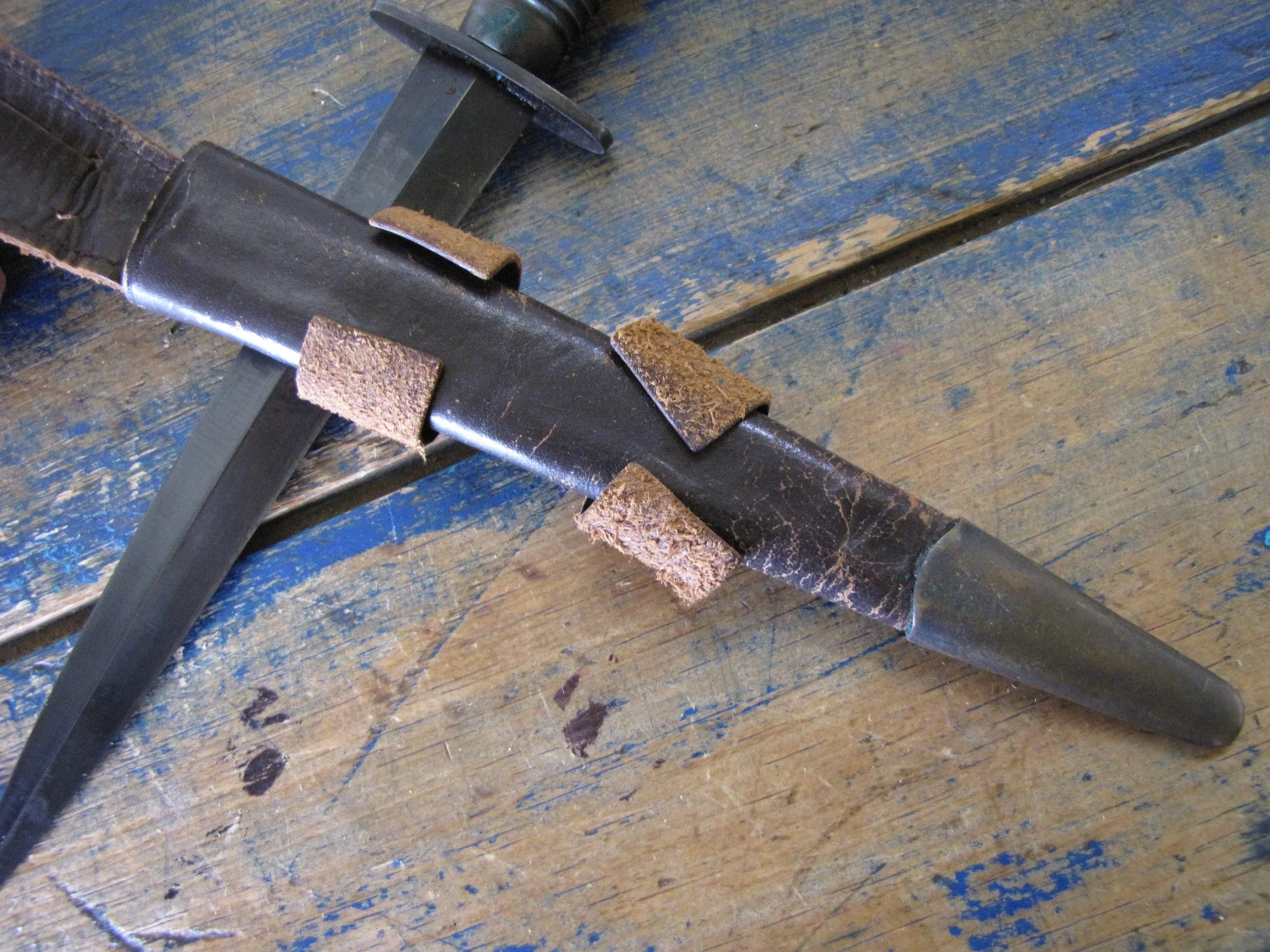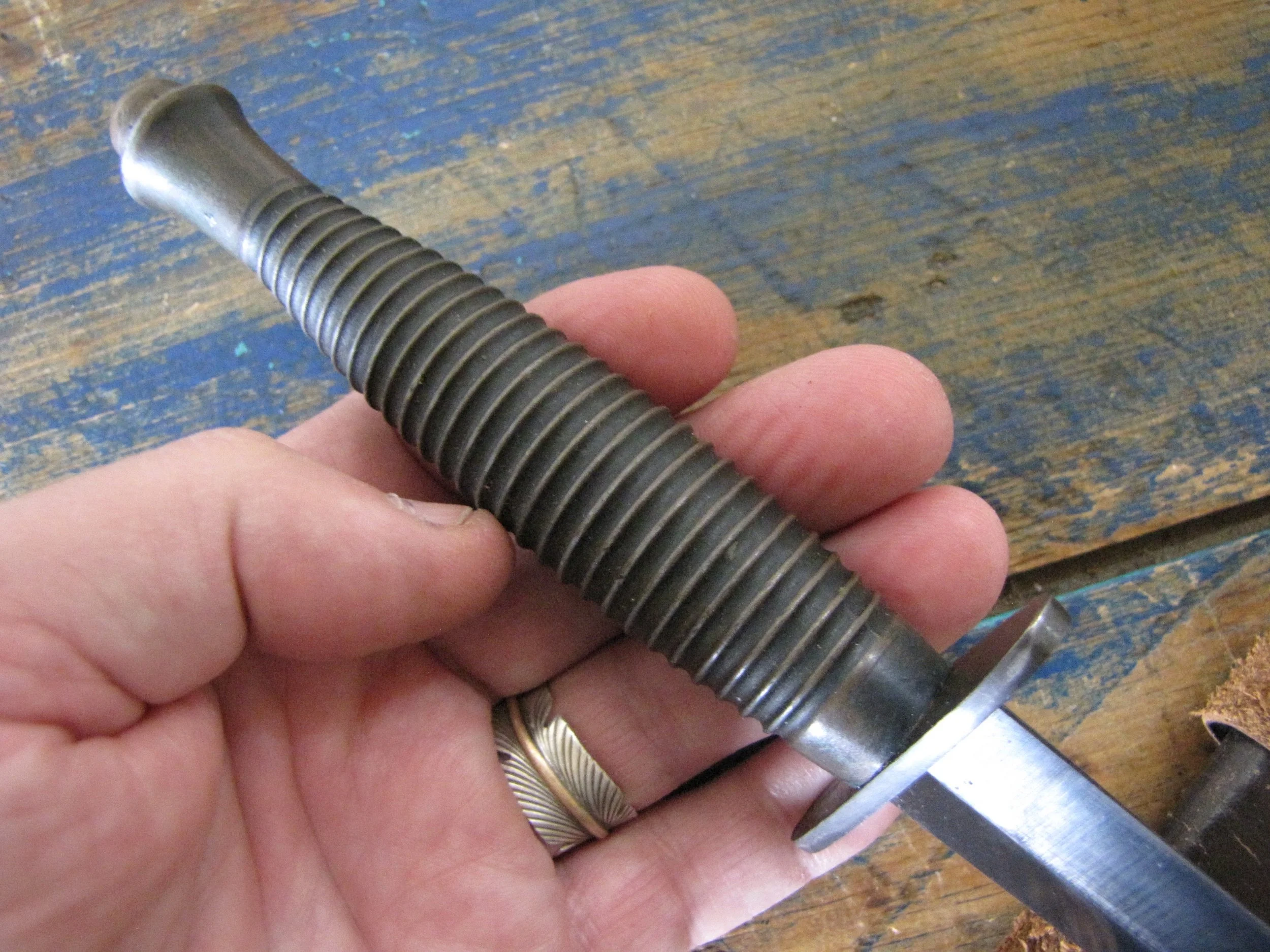 A really lovely example, showing no signs of use or sharpening. Retaining most of its original dark finish. A full length blade of 6 7/8” in near perfect condition, retaining all of it’s original dark finish, no signs of use or sharpening. The hilt is nice and tight with the original pommel nut untouched and intact. The wartime cast mould number is ‘4’. The crossguard is stamped with the import mark of England. The knife comes with a correct pattern scabbard in super nice condition, the only issue being the elastic is now perished. A fabulous example of an original WWII Third Pattern F-S complete with scabbard.