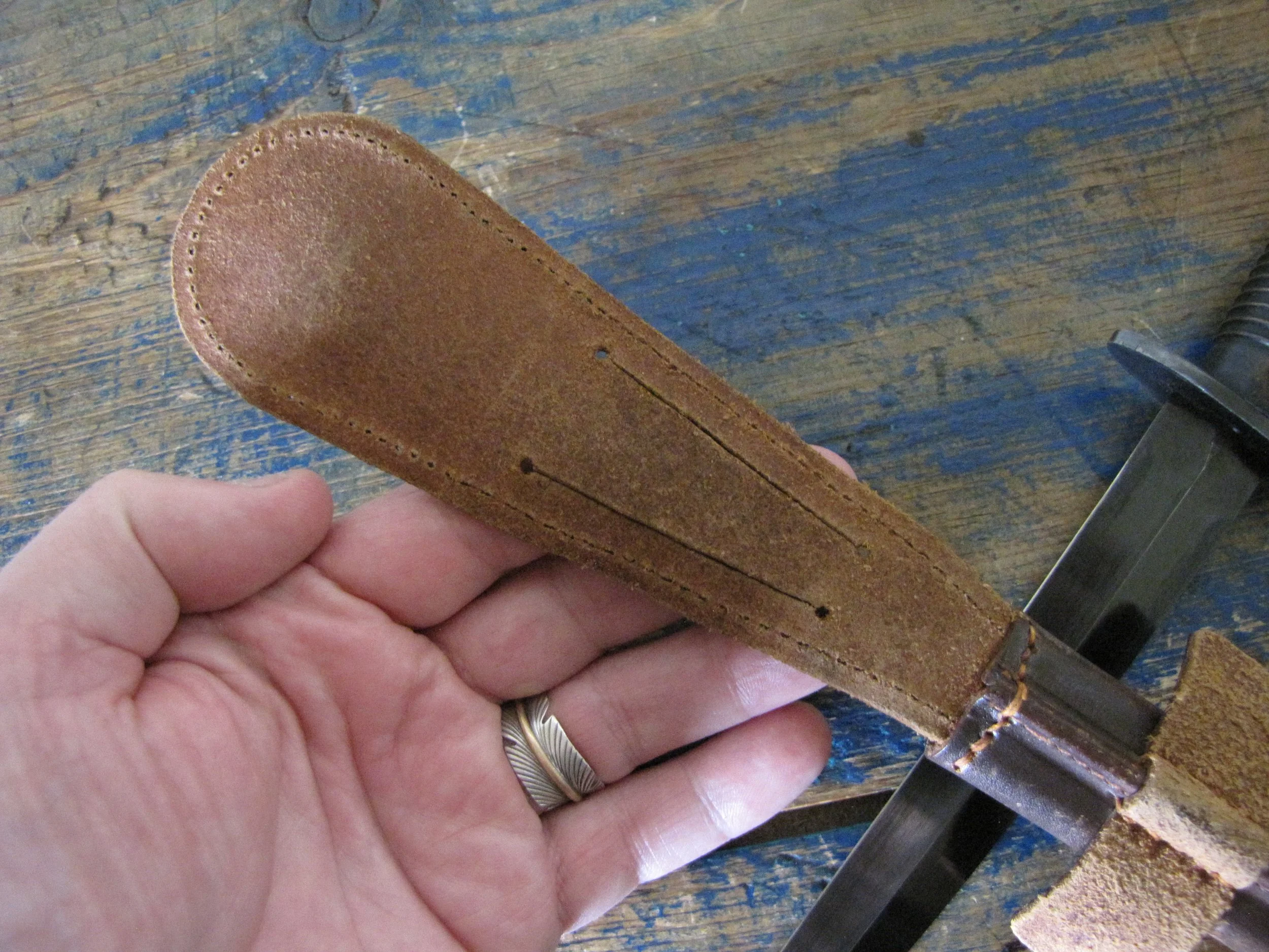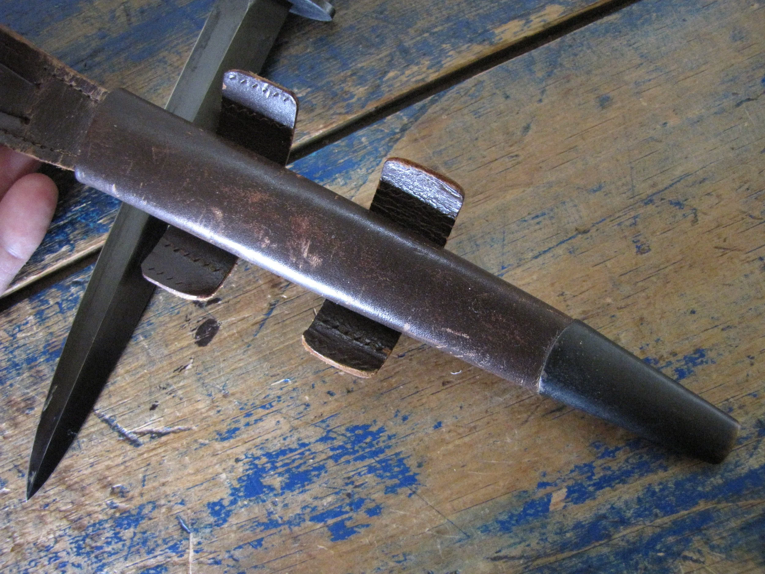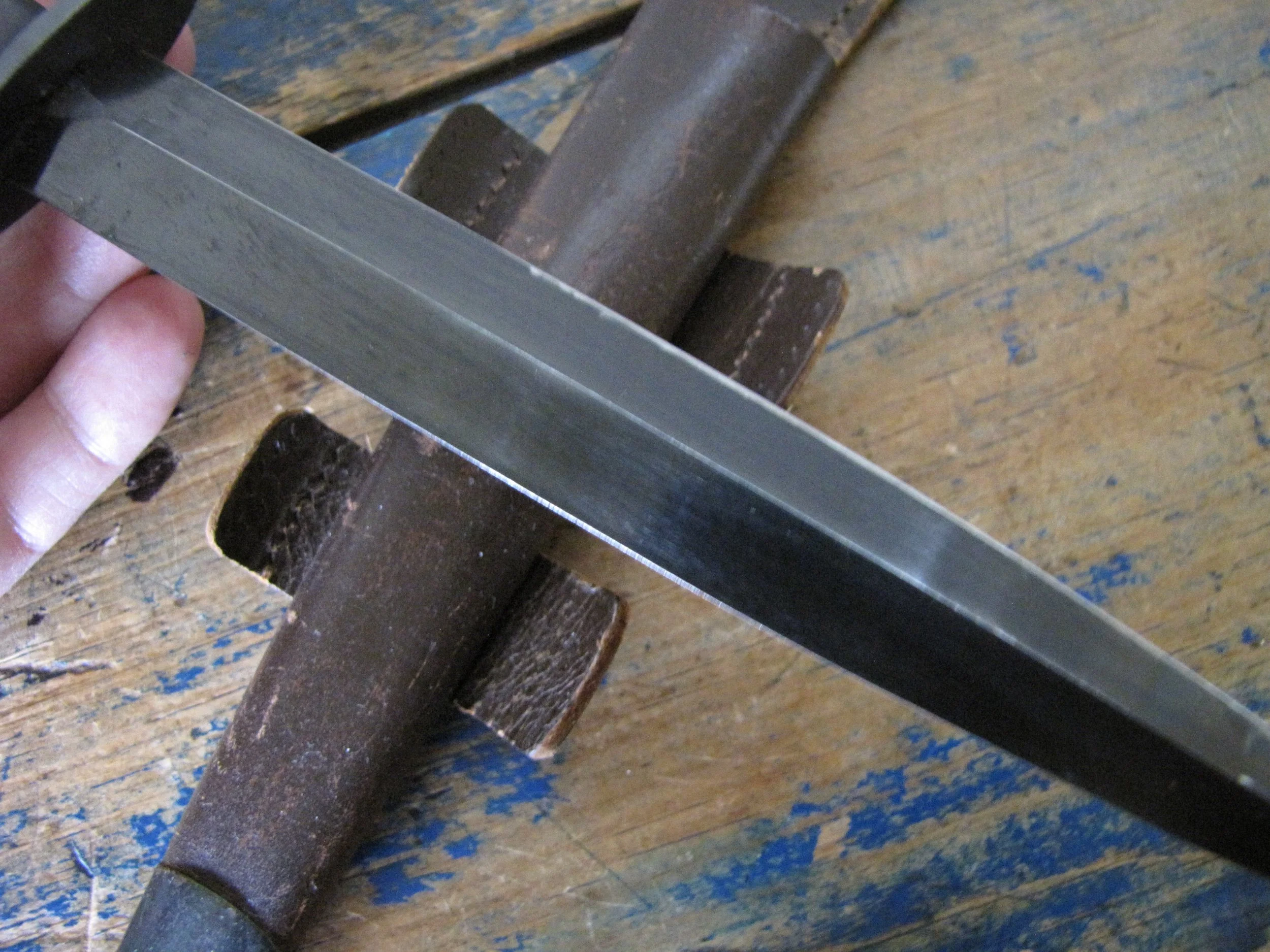 A fine example of this very well made and robust mid-war Third Pattern. Produced (but I believe not delivered) for the 1943 Indian contract by Wilkinson. This mid-war Third Pattern has the thick hand-ground, full length blade at 6 3/4” showing some very light sharping but retaining most of its high polish finish. The hilt is solid with most of it’s original finish remaining. The crossguard has the correct ‘⩚I MoS inspection stamp with the other side stamped with the US import mark of England, so never issues (as almost all of these are). The grip as the wartime cast grip mould number of ‘2’. The pommel nut is intact and original but has been tightened at some point. This knife comes with an excellent correct pattern Wilkinson scabbard, with both wings intact but the frog backing and elastic is now missing.