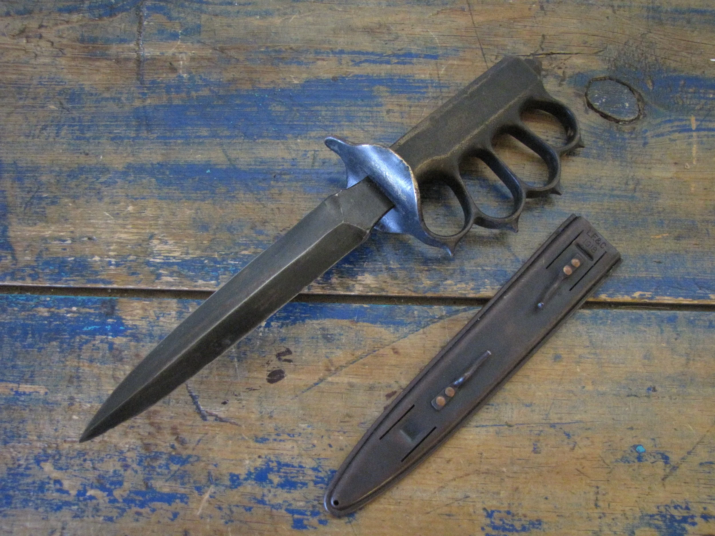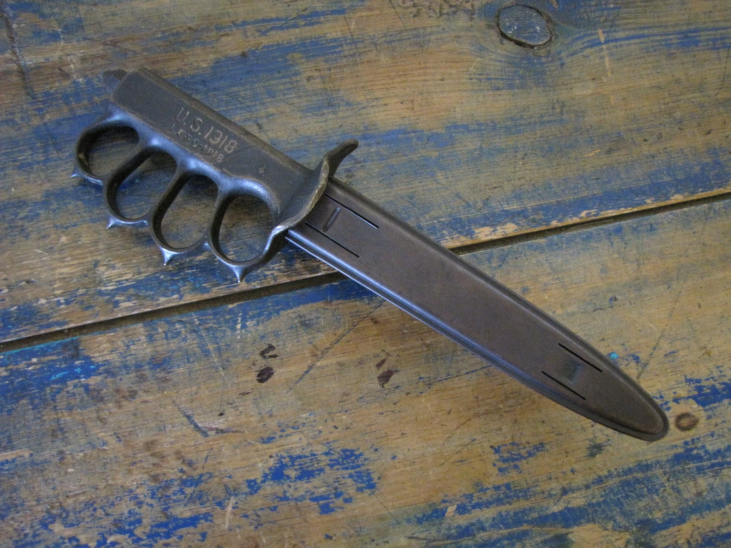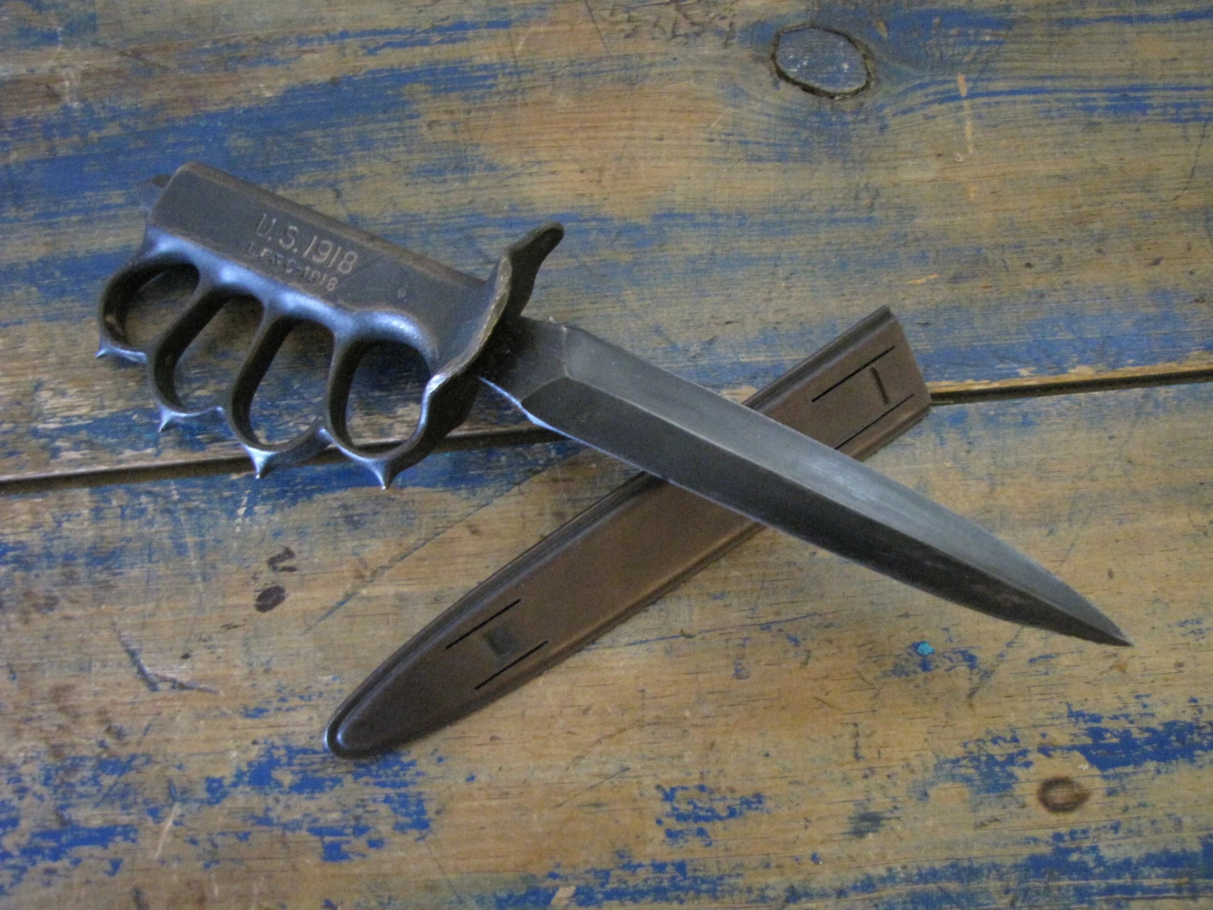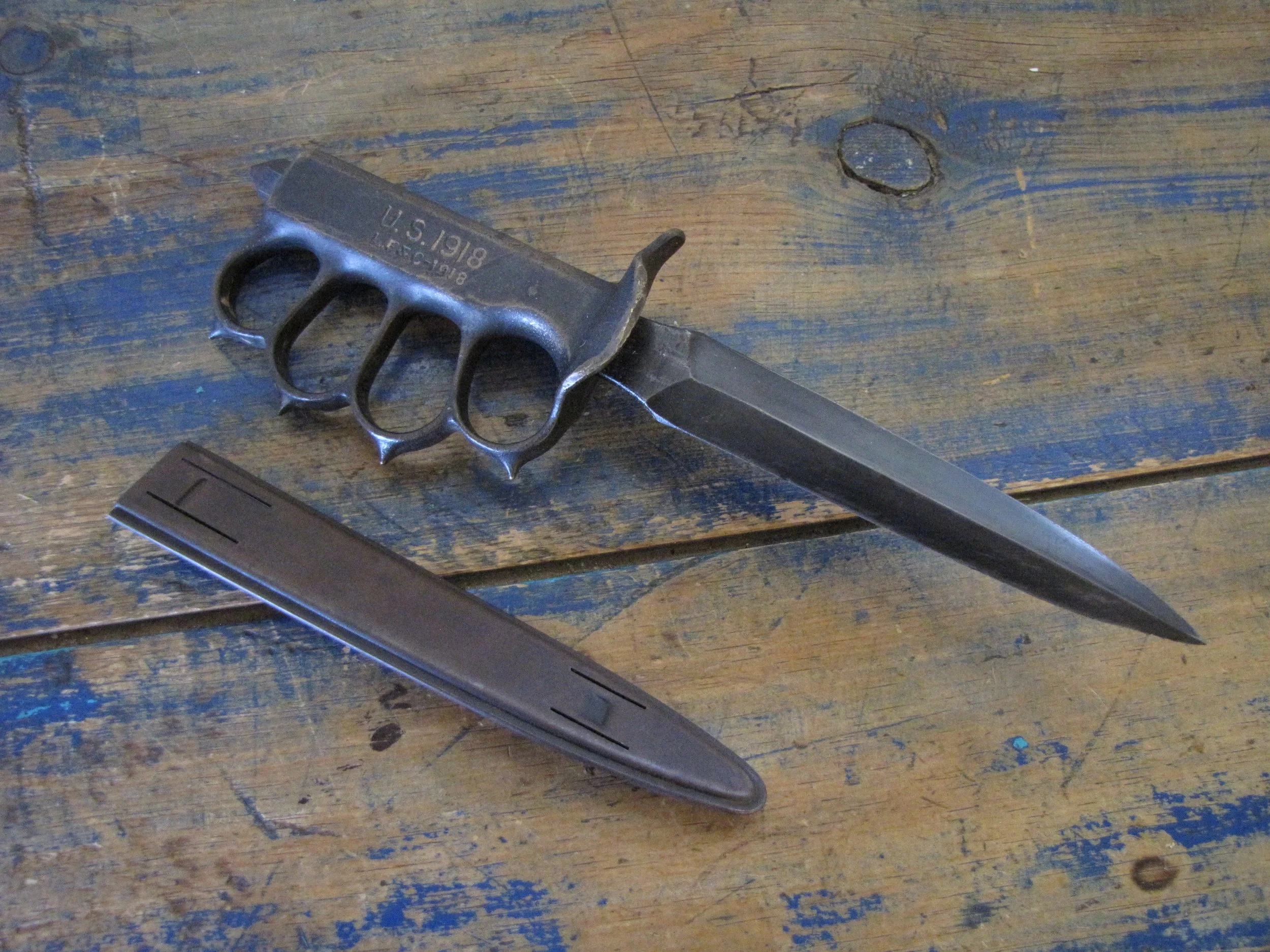 An excellent example of the classic M1918 fighting knife. In wonderful condition and complete with scabbard. The blade retaining most of its original finish. Overall length 11 1/2” with a blade of 6 7/8”. The flared guards have been slightly modified by bending them a little, this was a popular modification during WWII especially amongst Airborne troops in order to wear the knife closer to the body.