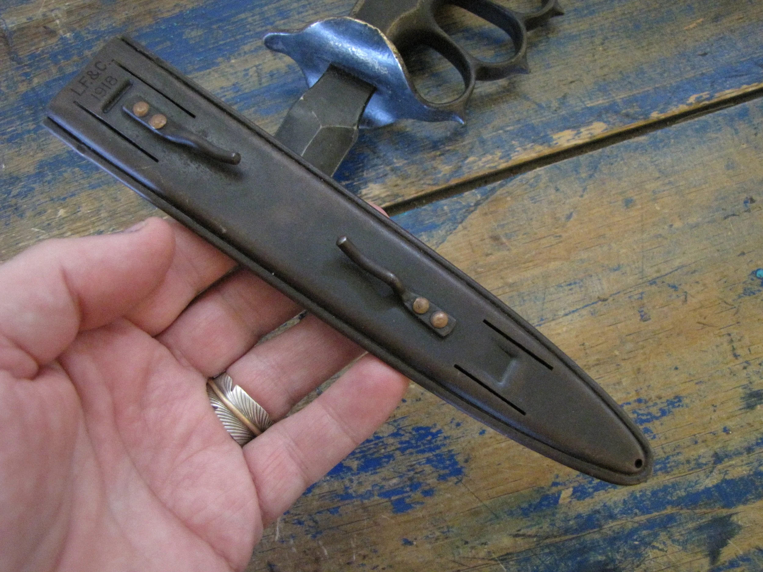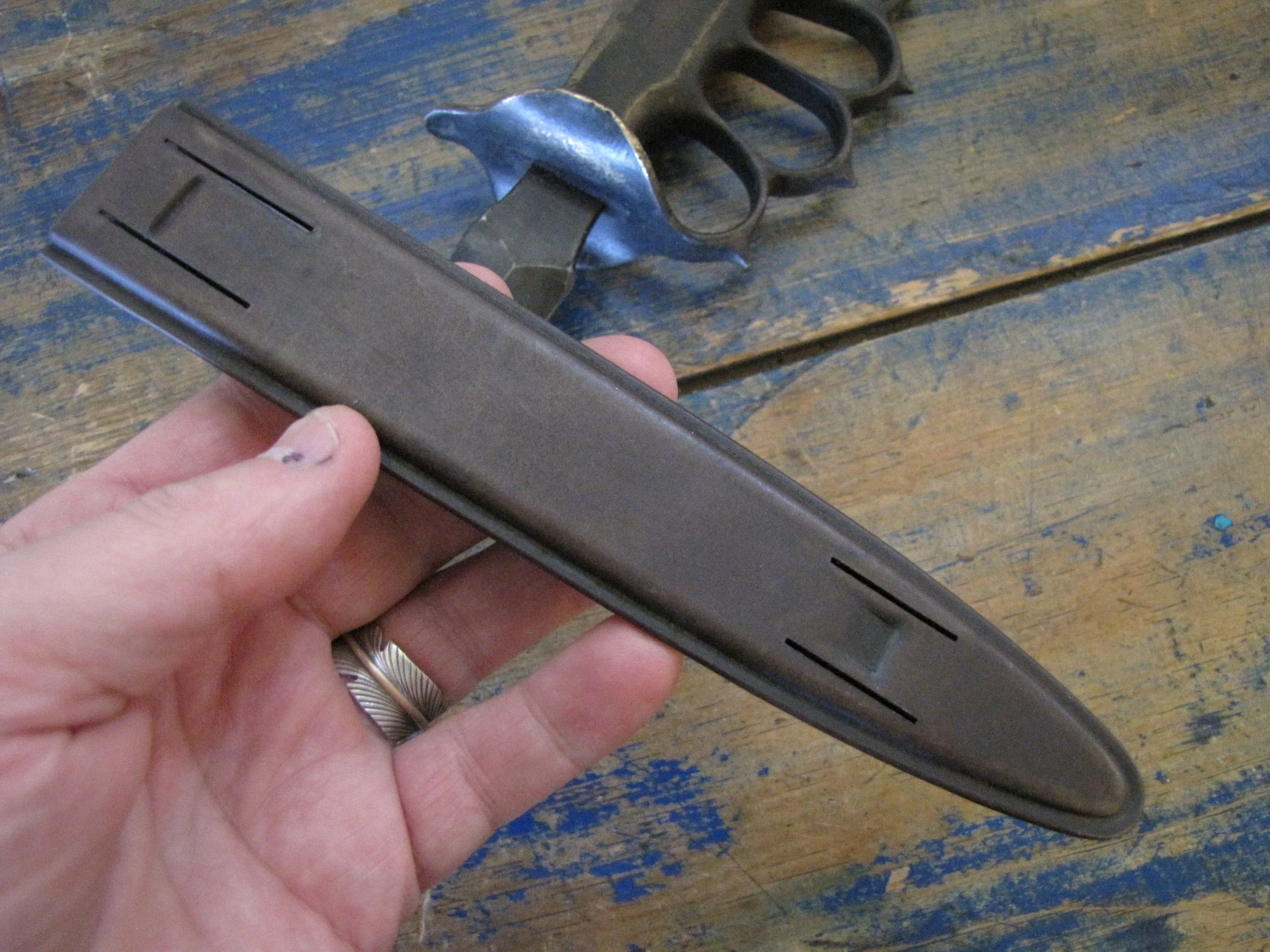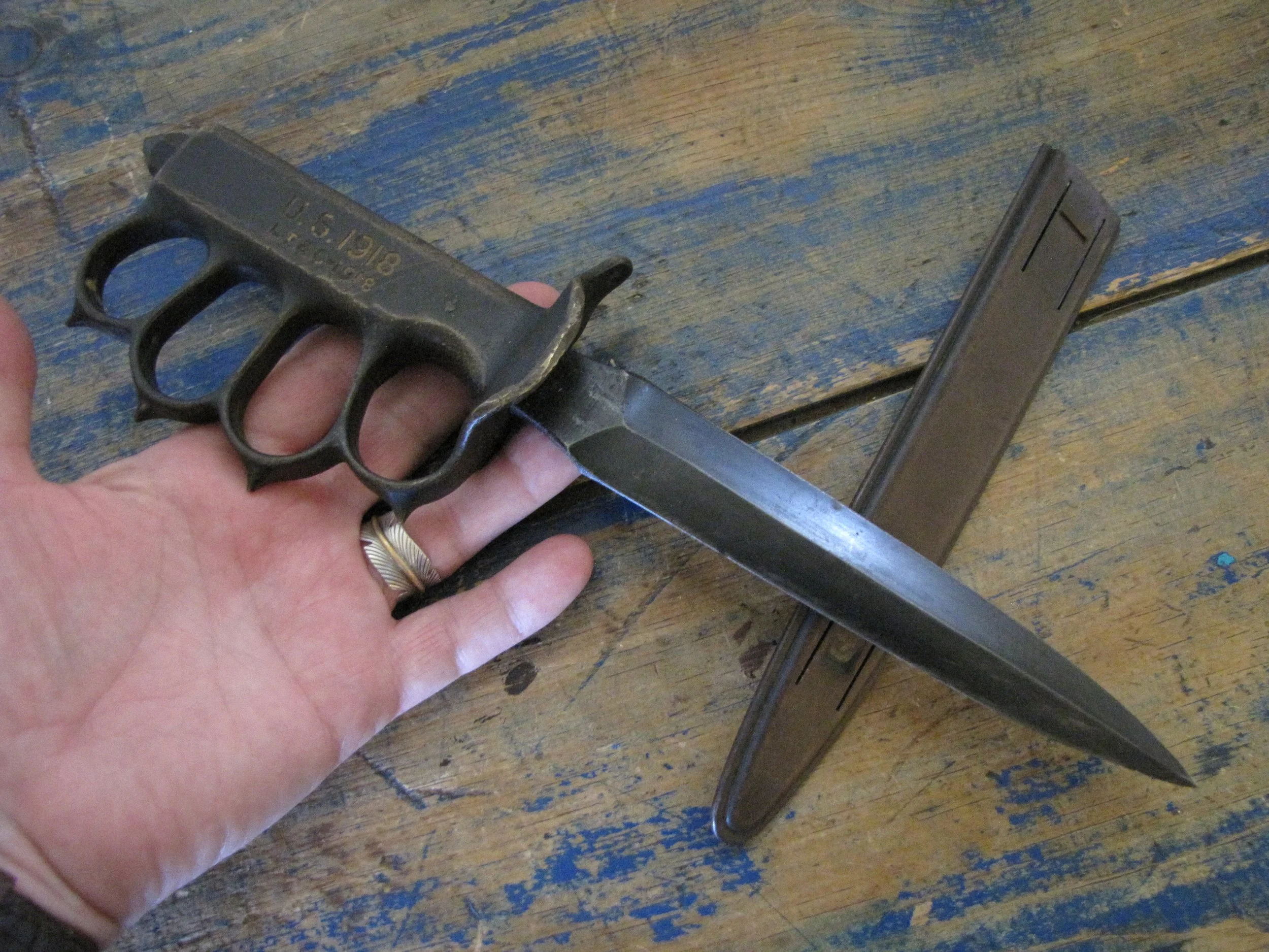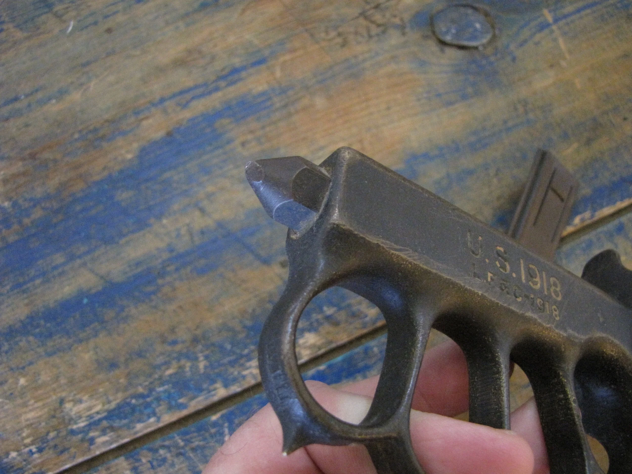 An excellent example of the classic M1918 fighting knife. In wonderful condition and complete with scabbard. The blade retaining most of its original finish. Overall length 11 1/2” with a blade of 6 7/8”. The flared guards have been slightly modified by bending them a little, this was a popular modification during WWII especially amongst Airborne troops in order to wear the knife closer to the body.