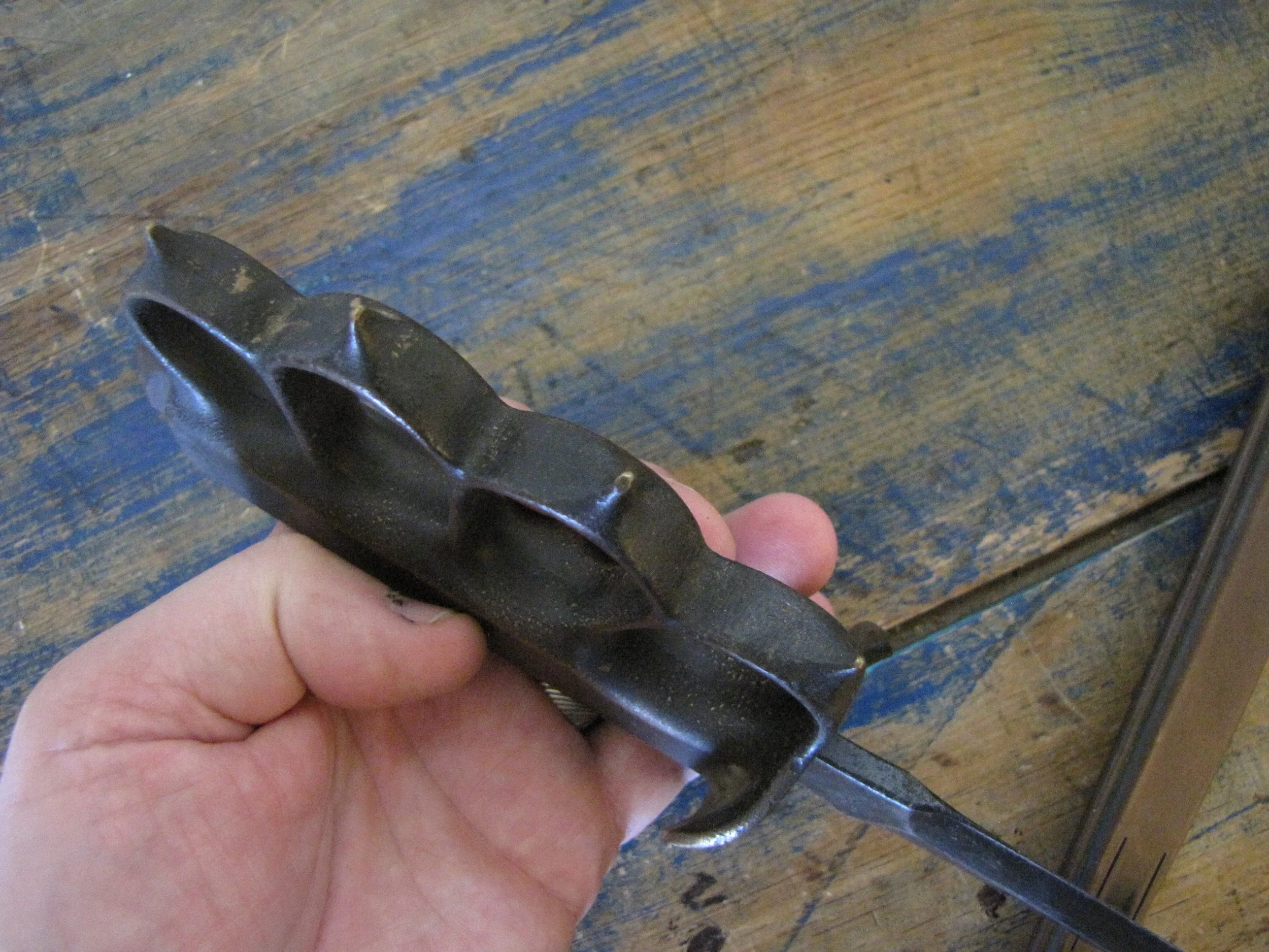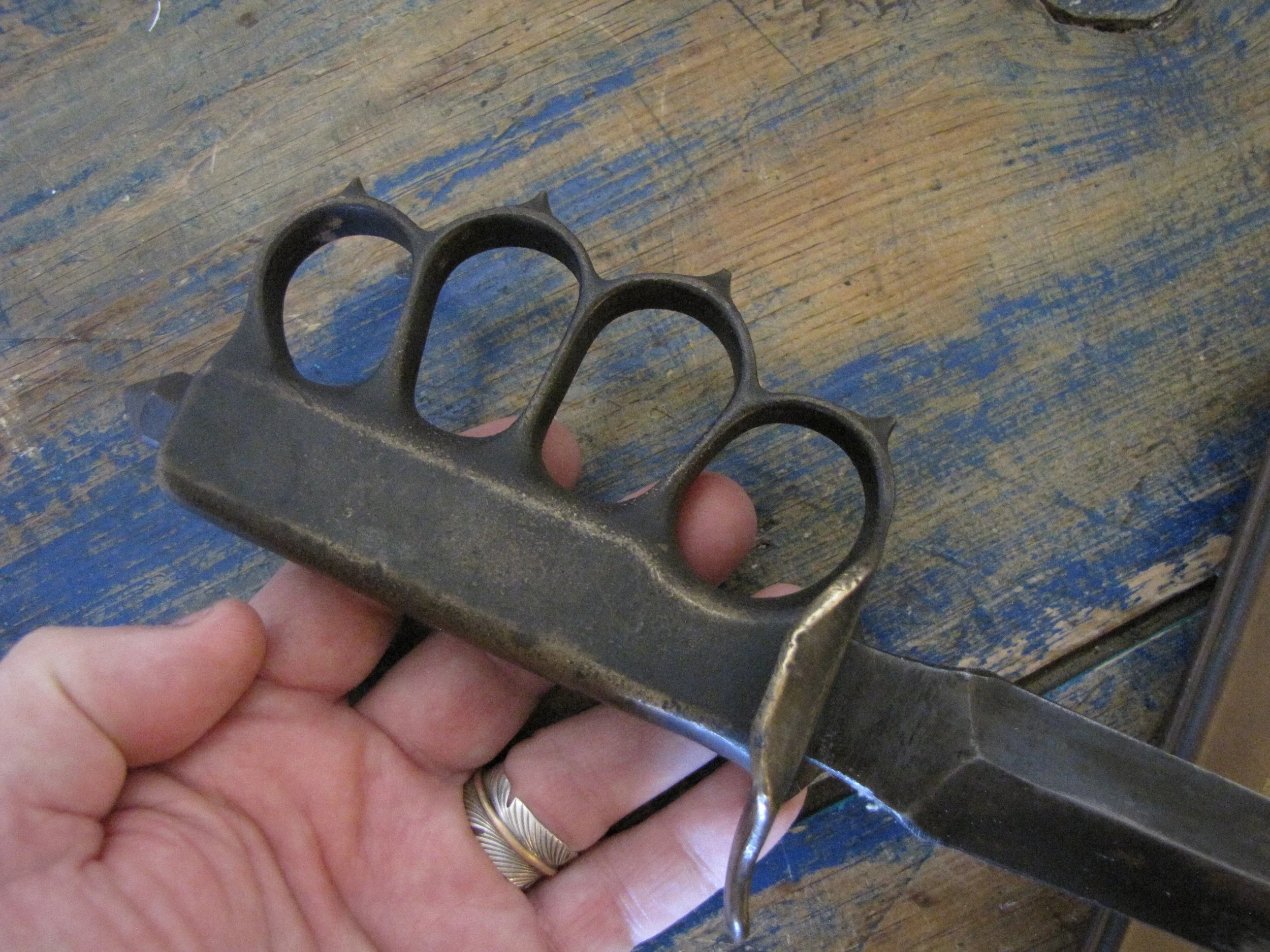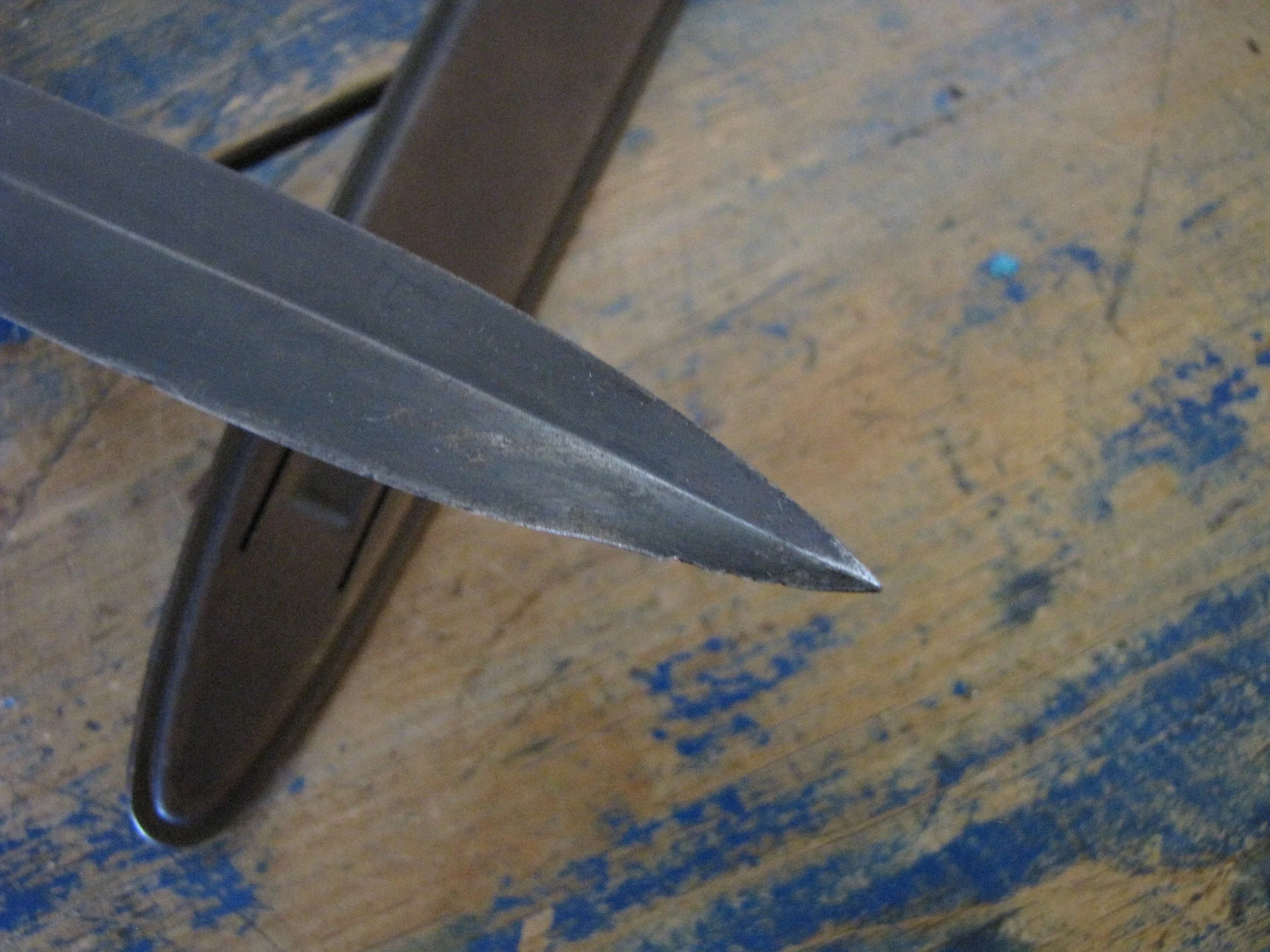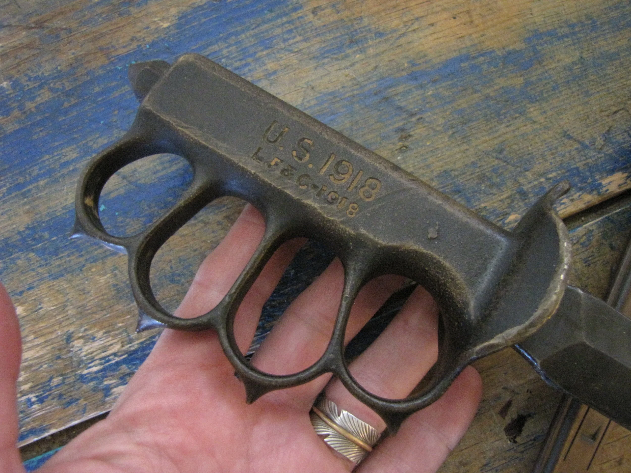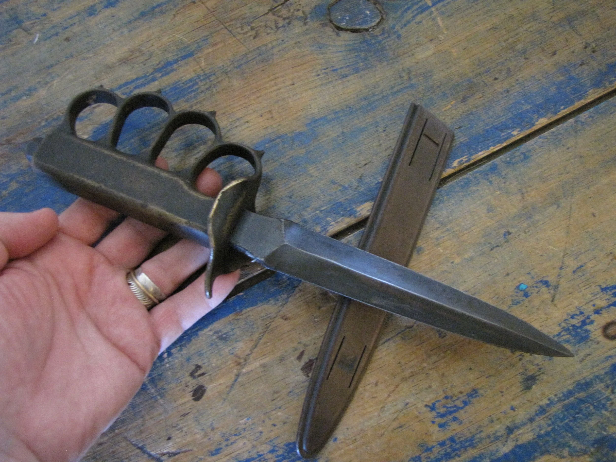 An excellent example of the classic M1918 fighting knife. In wonderful condition and complete with scabbard. The blade retaining most of its original finish. Overall length 11 1/2” with a blade of 6 7/8”. The flared guards have been slightly modified by bending them a little, this was a popular modification during WWII especially amongst Airborne troops in order to wear the knife closer to the body.