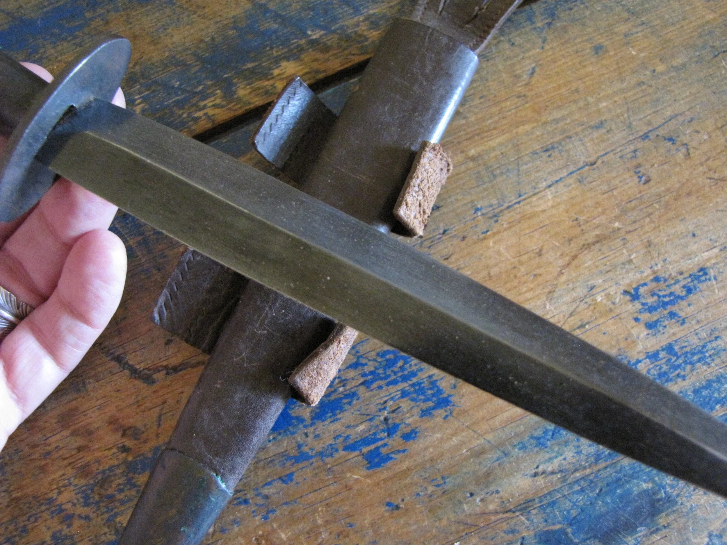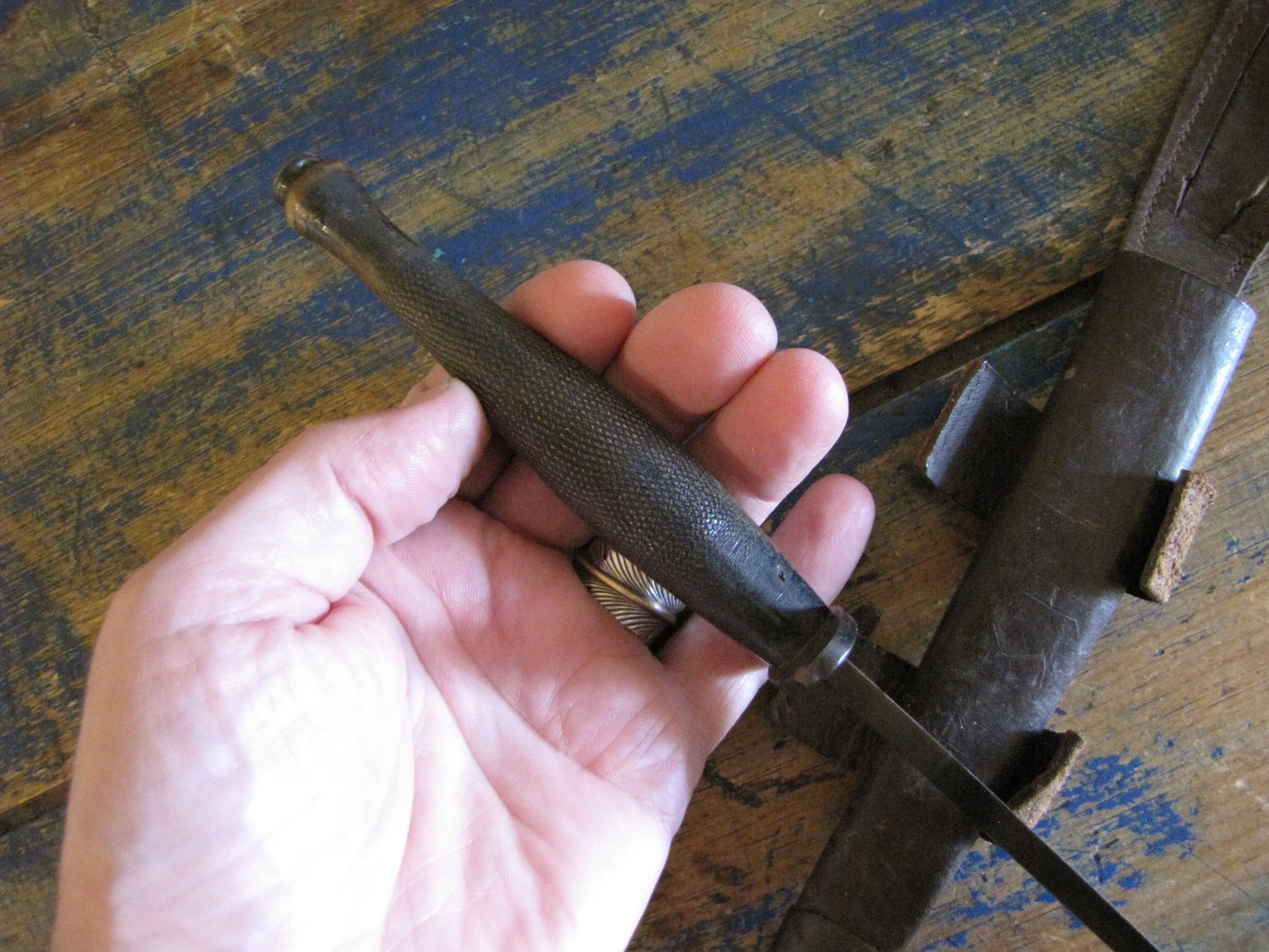 An excellent honest & correct, issued & carried Wilkinson Second Pattern F-S Fighting Knife complete with it’s original and correct scabbard. This Ministry of Supply contract knife has no import stamp, so an actually Commando dagger that was issues, carried and used. Remaining in very solid condition with no issues, showing light use. The blade is very near full length at 6 3/4” retaining most of its dark finish and showing some light sharpening. The cross guard is stamped with the correct ⩚B2 inspection/ownership stamp, stamped close to the edge, so the 2 is not visible. The pommel nut is original and untouched. The hilt retaining a lot of original dark finish. The correct Wilkinson scabbard is in good condition, the elastic retaining strap is missing and the belt loops have been extended for wear on the 37 Pattern webbing belt, an often seen field modification. It appears to have some letters scratched into the sheath, most likely identifying the original owner, so a possible research project? Overall a really great example of an issues Wilkie.