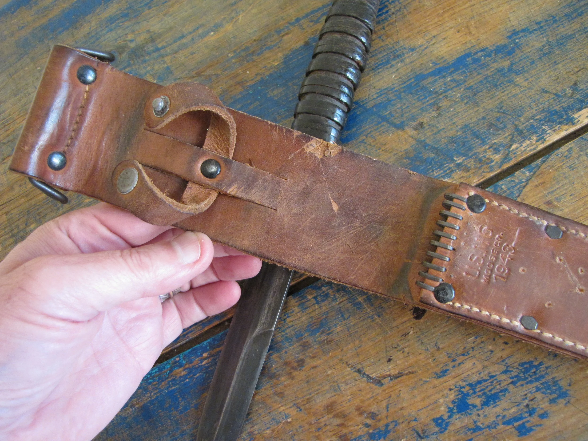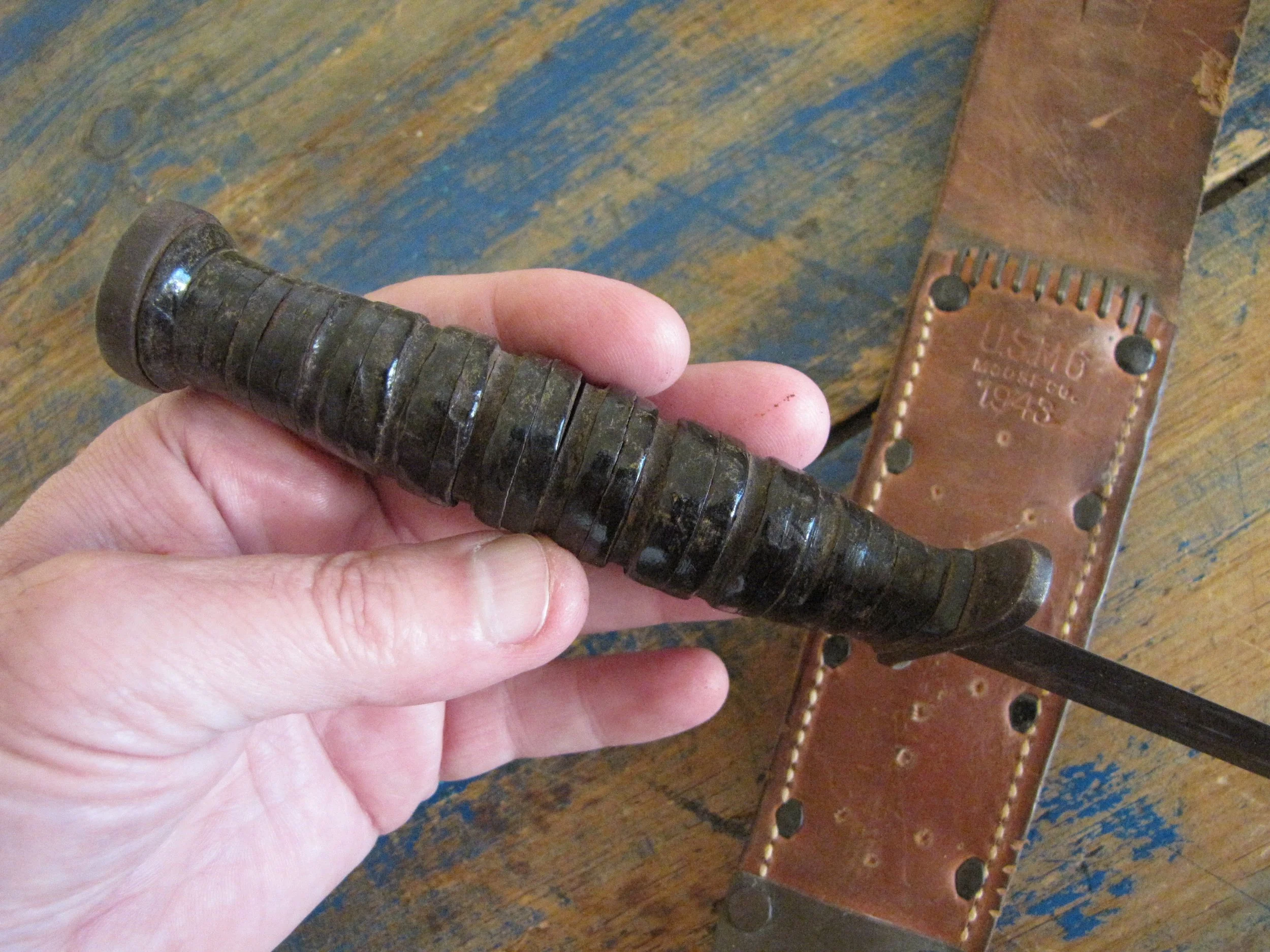 This example has that really great look of an issued, carried and used M-3. Blade marked by Case and with a Moose sheath. Overall length is 11 1/2” with a 6 3/4” blade. A lot of finish remaining and showing some light signs of use and sharpening. A few of the grip washers have some slight movement. A great sheath, correct marked. Overall a great example of a classic M-3 by Case.