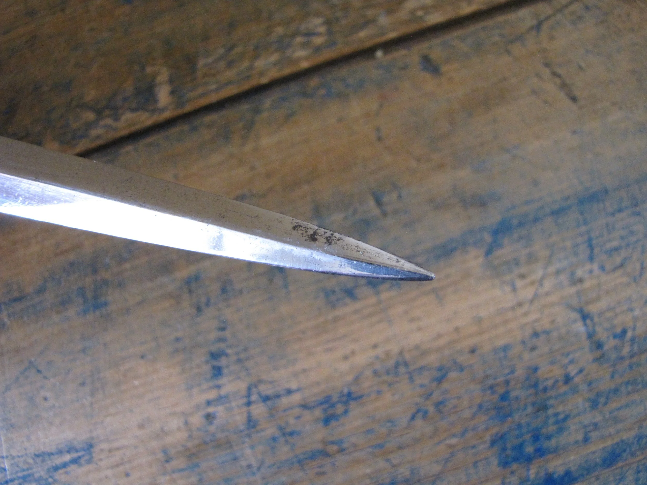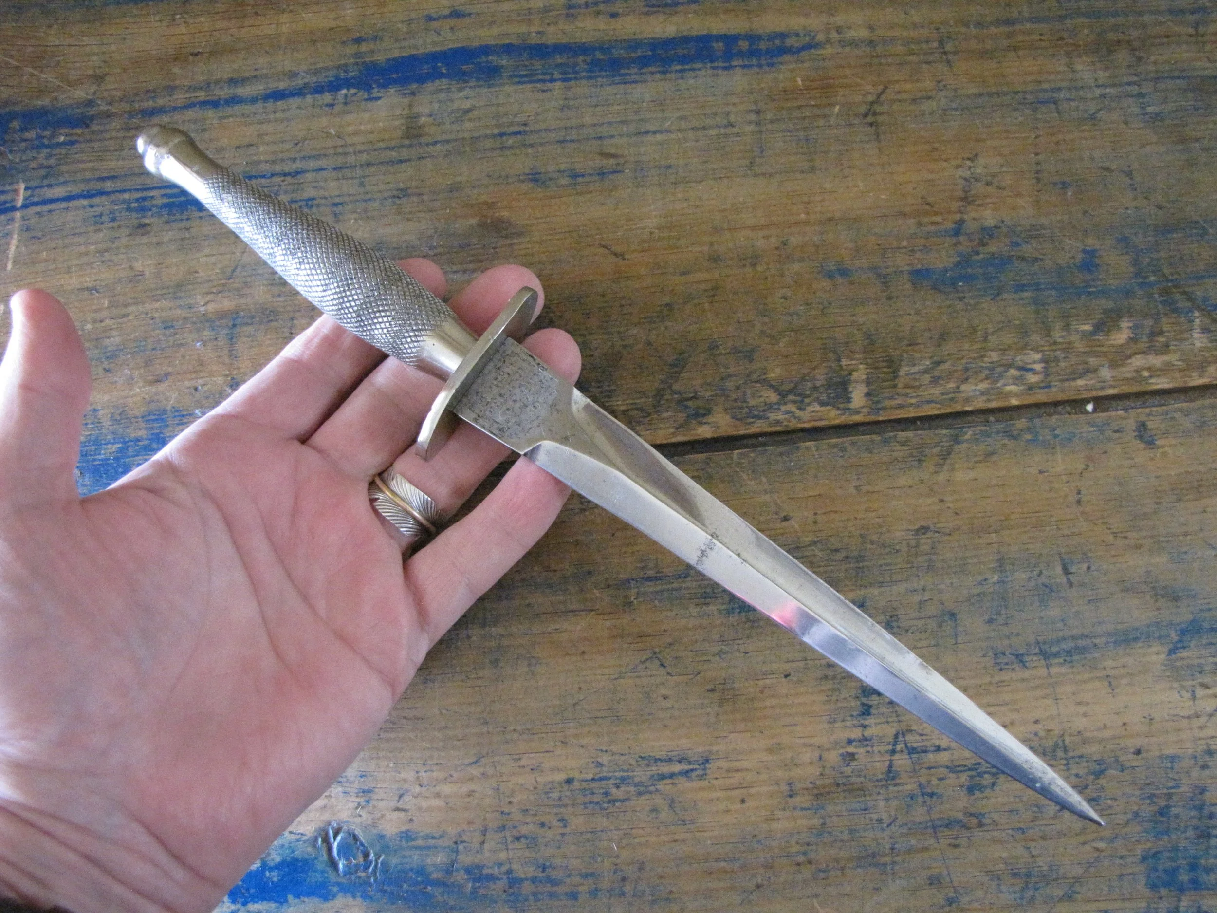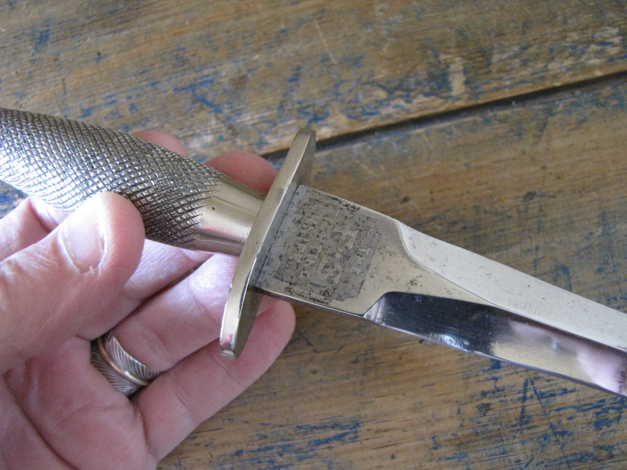 A splendid, original and honest circa 1941 Wilkinson First Pattern F-S Fighting Knife. This example shows some light use and wear but remains in really splendid original condition. The blade has a wonderful narrow taper to it and is full length at 6 7/8” with some signs of light sharpening and use. The tip appears to have a very slight (hardly noticeable) kink but barely visible but mentioned for full disclosure. Both etchings are clear and readable. The hilt, grip and guard are all solid and in great condition. The pommel nut original and shows the original clamp marks. No original scabbard with this example but overall a really fine, totally original and correct 1941 Wilkie First Pattern.