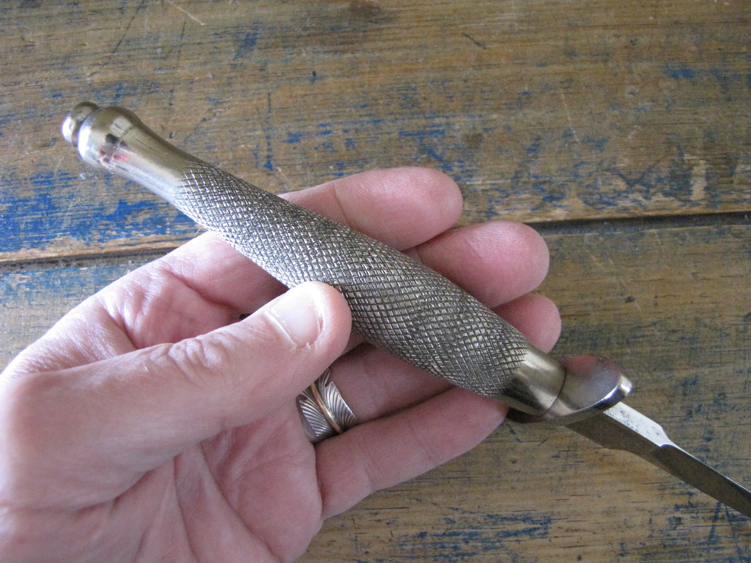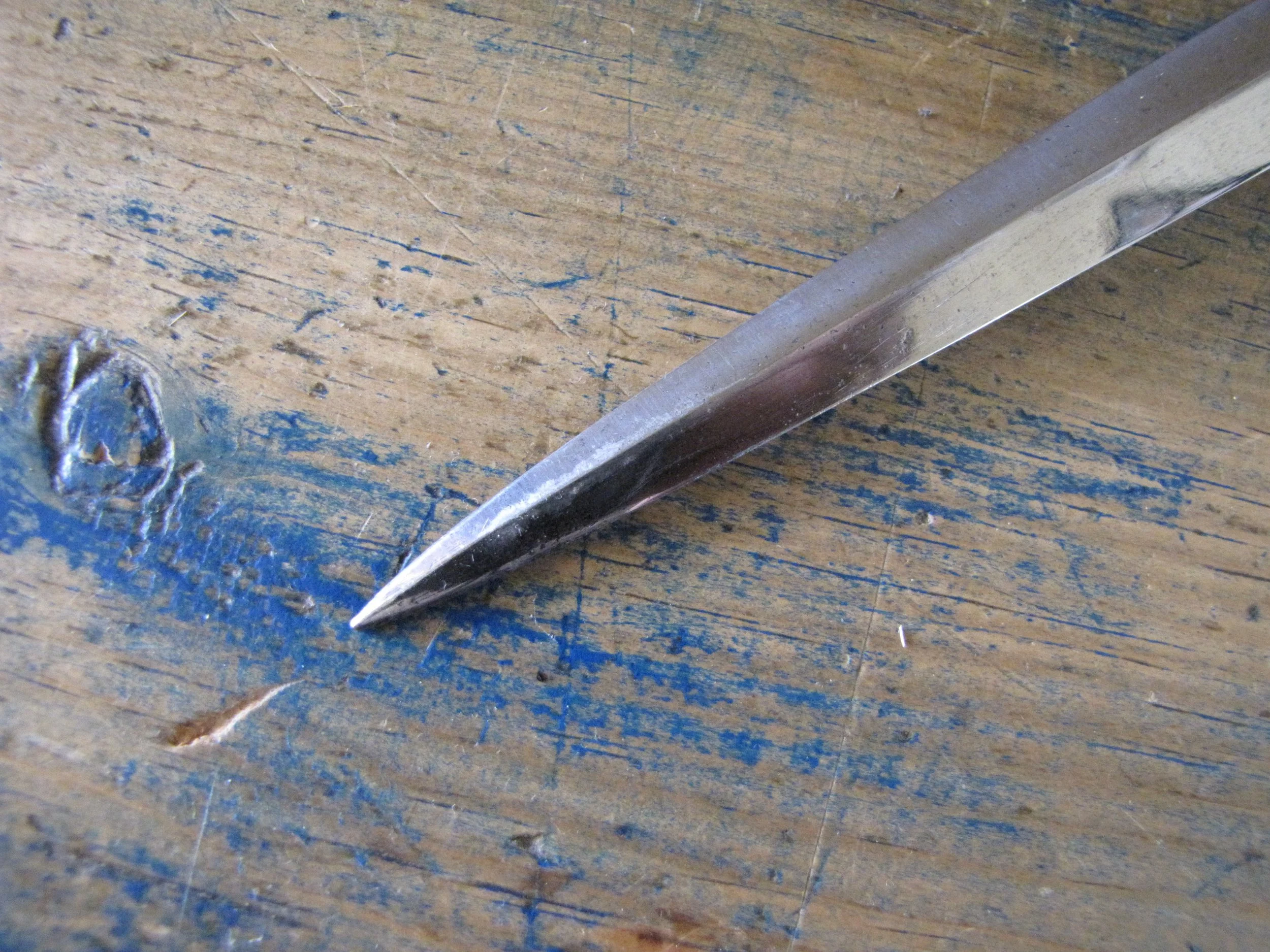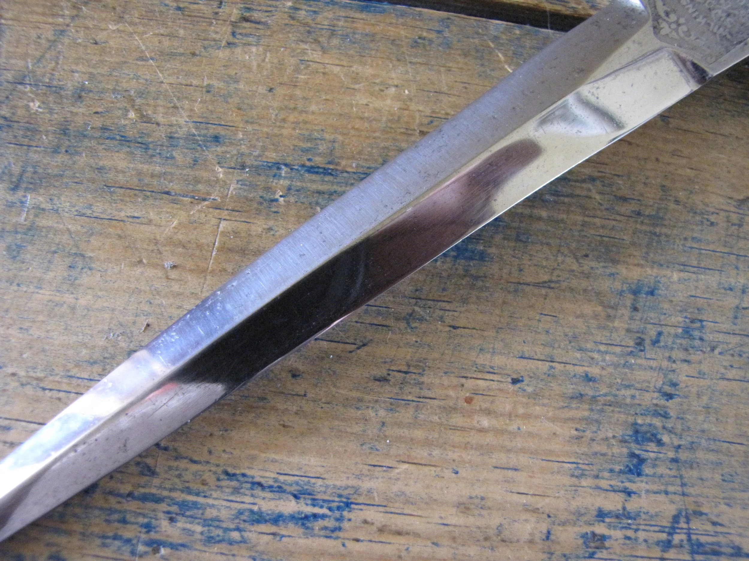A splendid, original and honest circa 1941 Wilkinson First Pattern F-S Fighting Knife. This example shows some light use and wear but remains in really splendid original condition. The blade has a wonderful narrow taper to it and is full length at 6 7/8” with some signs of light sharpening and use. The tip appears to have a very slight (hardly noticeable) kink but barely visible but mentioned for full disclosure. Both etchings are clear and readable. The hilt, grip and guard are all solid and in great condition. The pommel nut original and shows the original clamp marks. No original scabbard with this example but overall a really fine, totally original and correct 1941 Wilkie First Pattern.