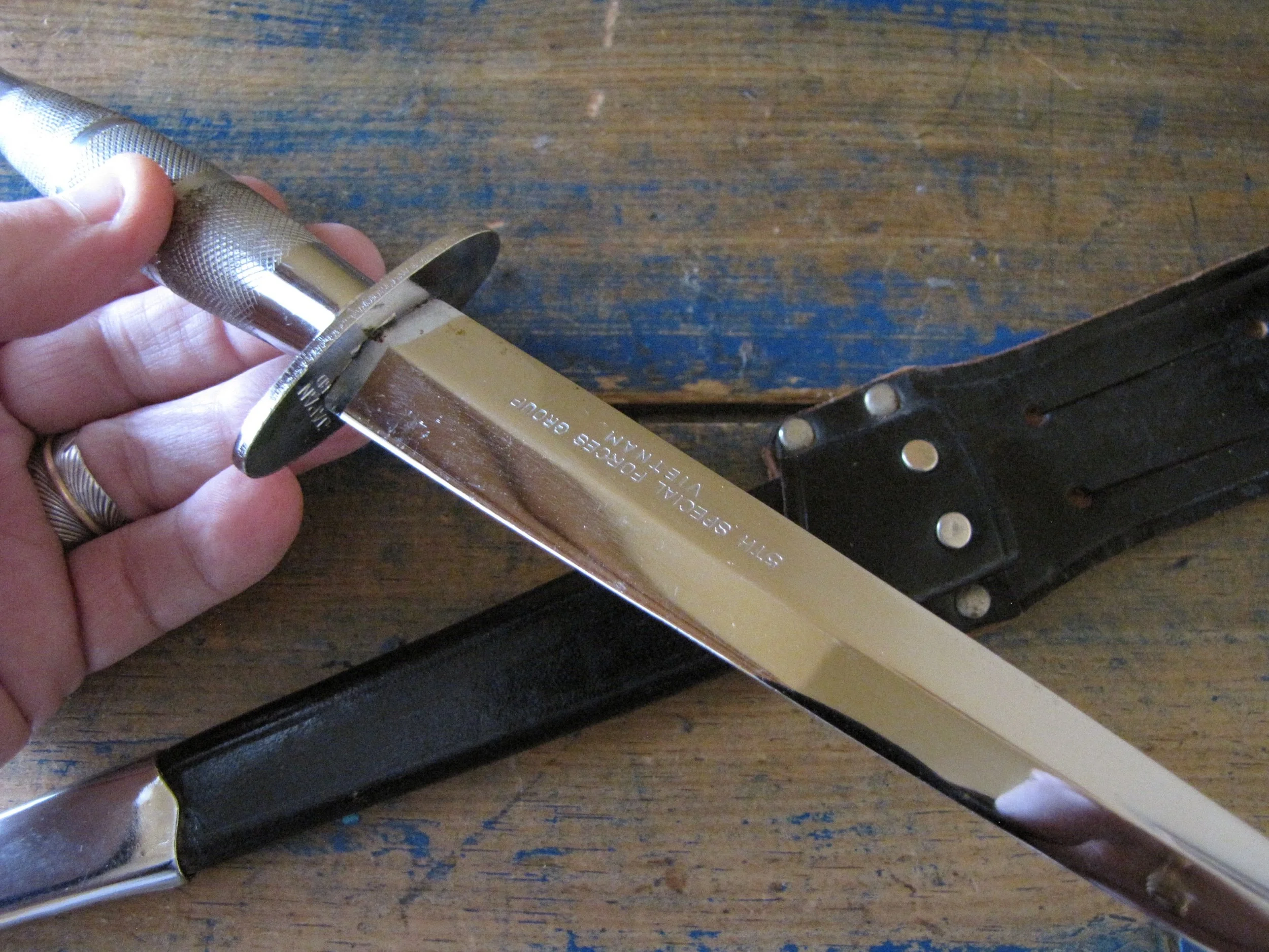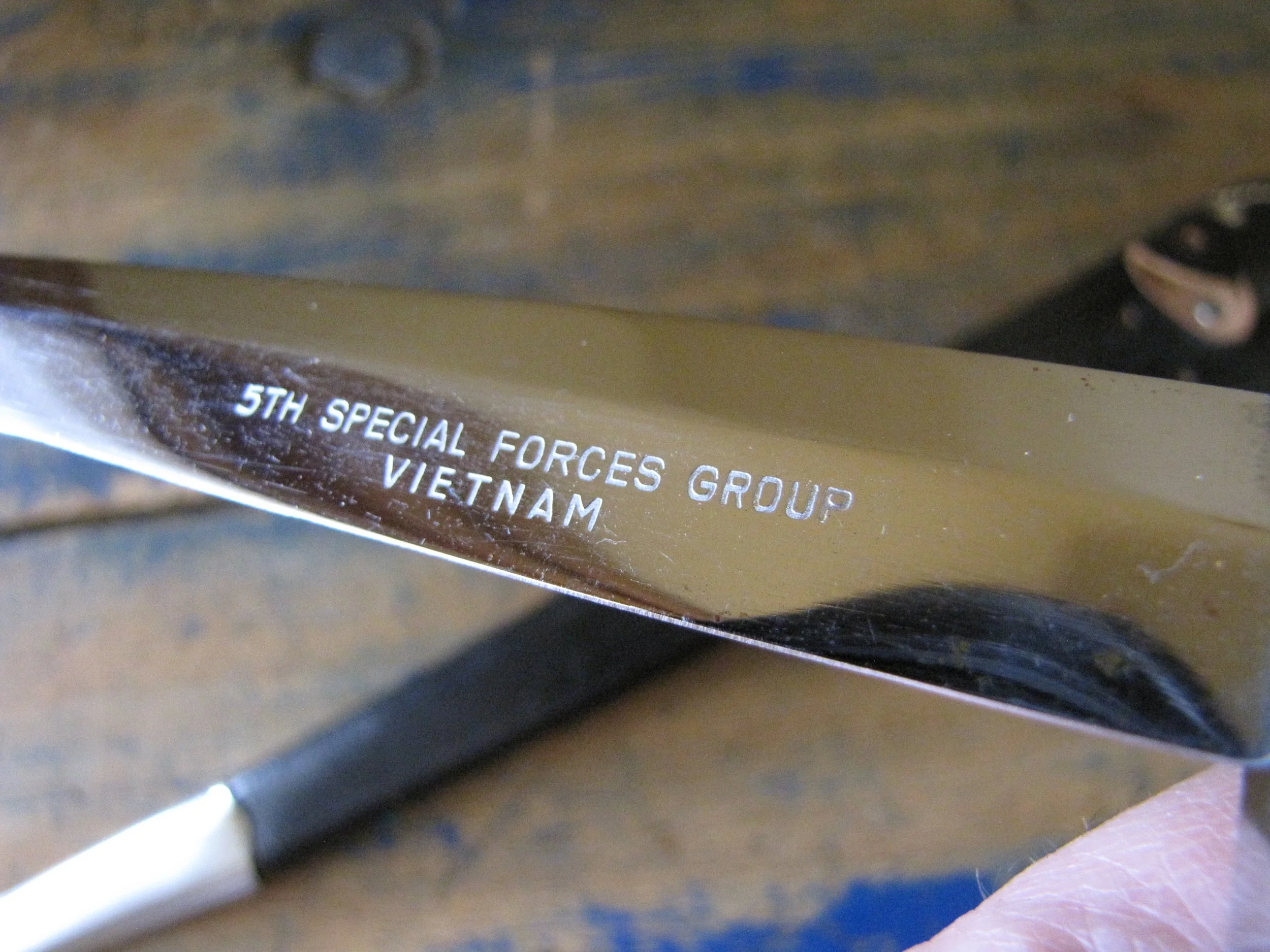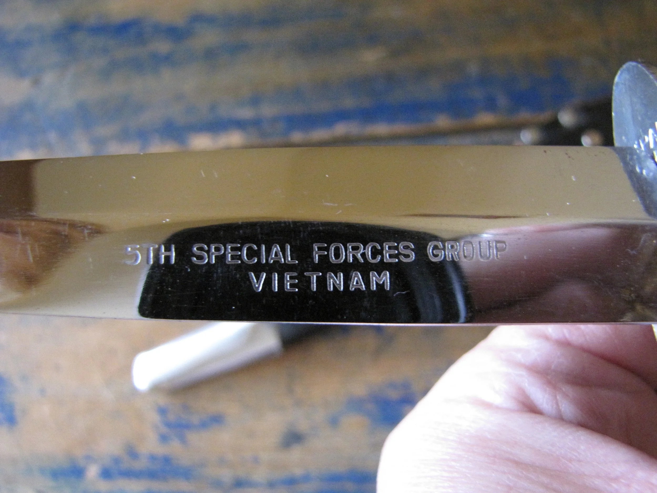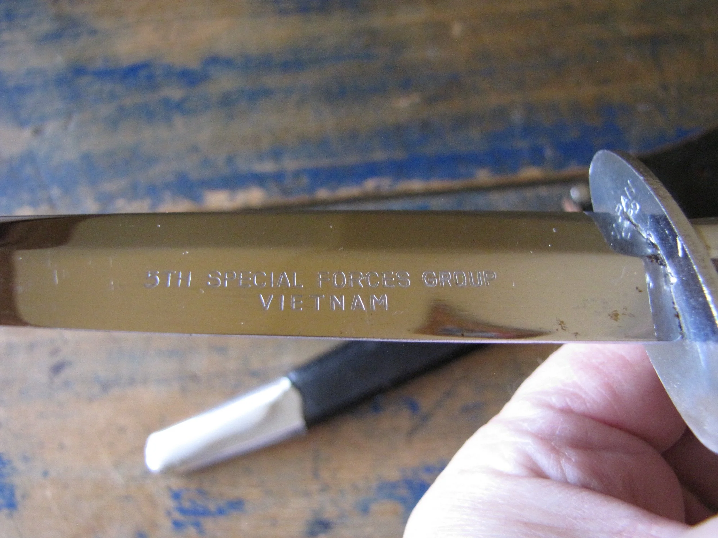 A very near flawless example of the desirable c1970s Vietnam 5th Special Forces presentation F-S by Japan Sword. Unused, solid and tight. Two small areas of plating loss (one on the blade and one on the grip) shown in the photos but otherwise just about as-new. Complete with its original and correct scabbard. The chape is a little loose but still strongly attached. The blade is cleanly and clearly engraved ‘5TH SPECIAL FORCES GROUP VIETNAM’.