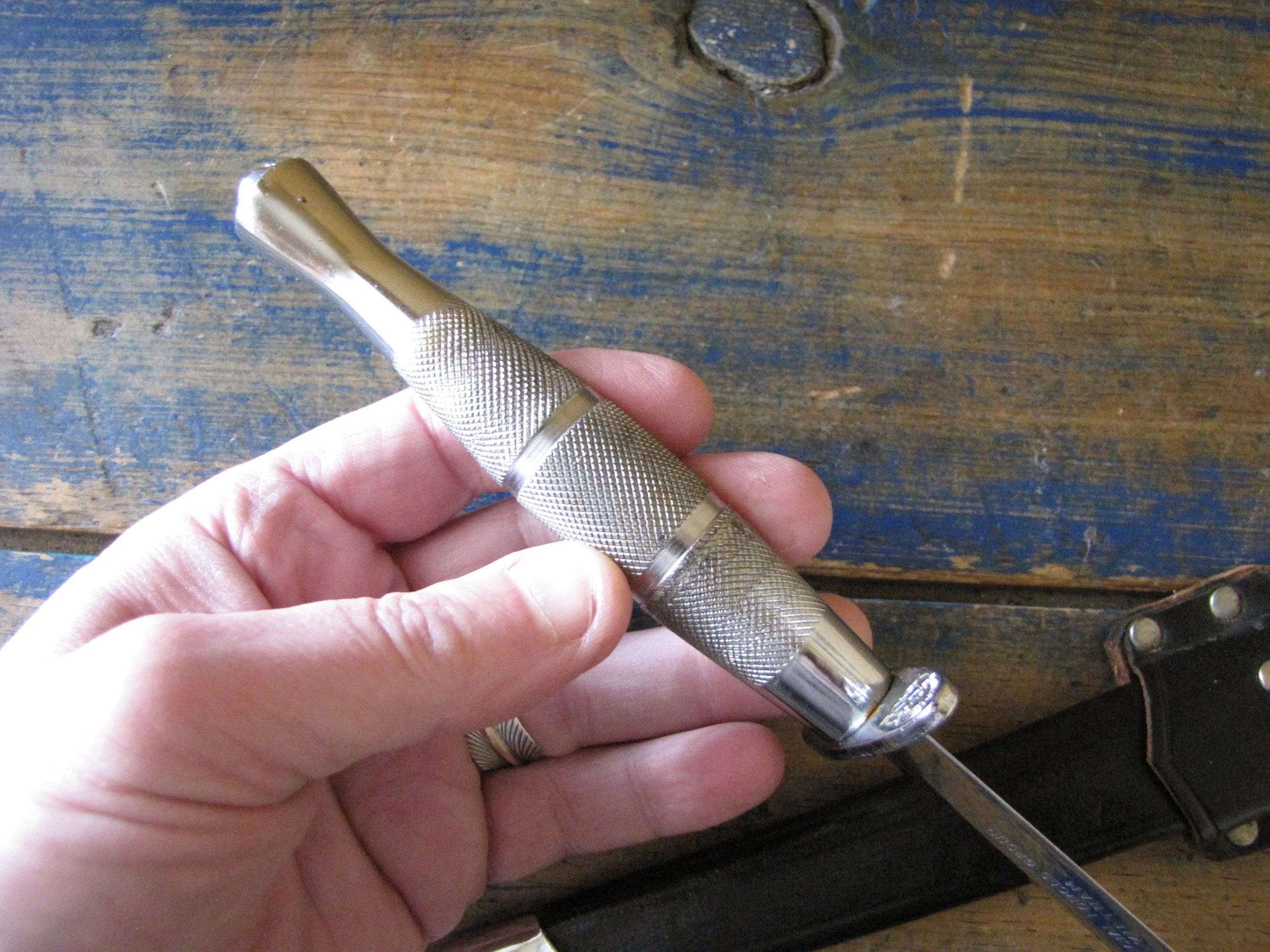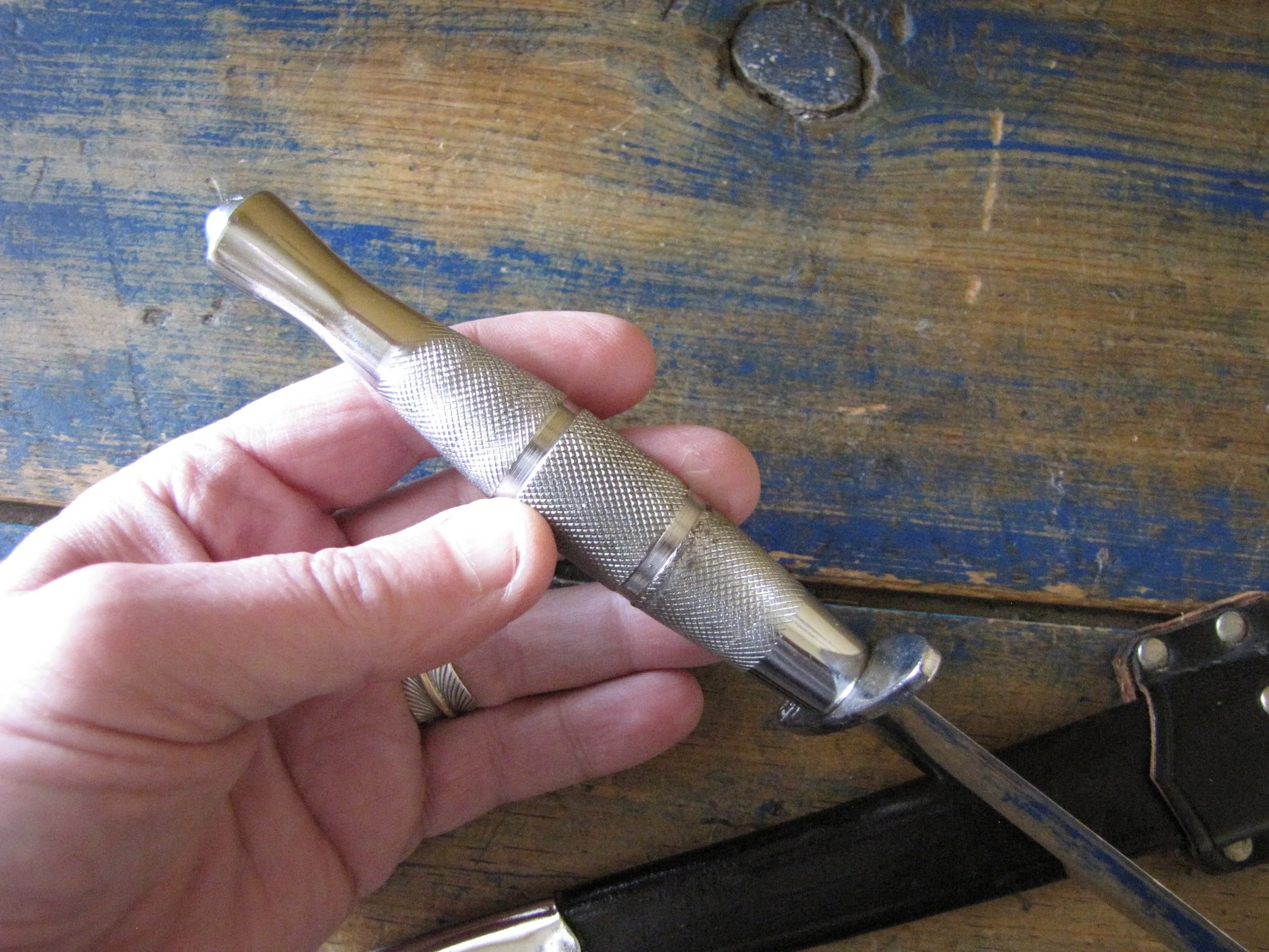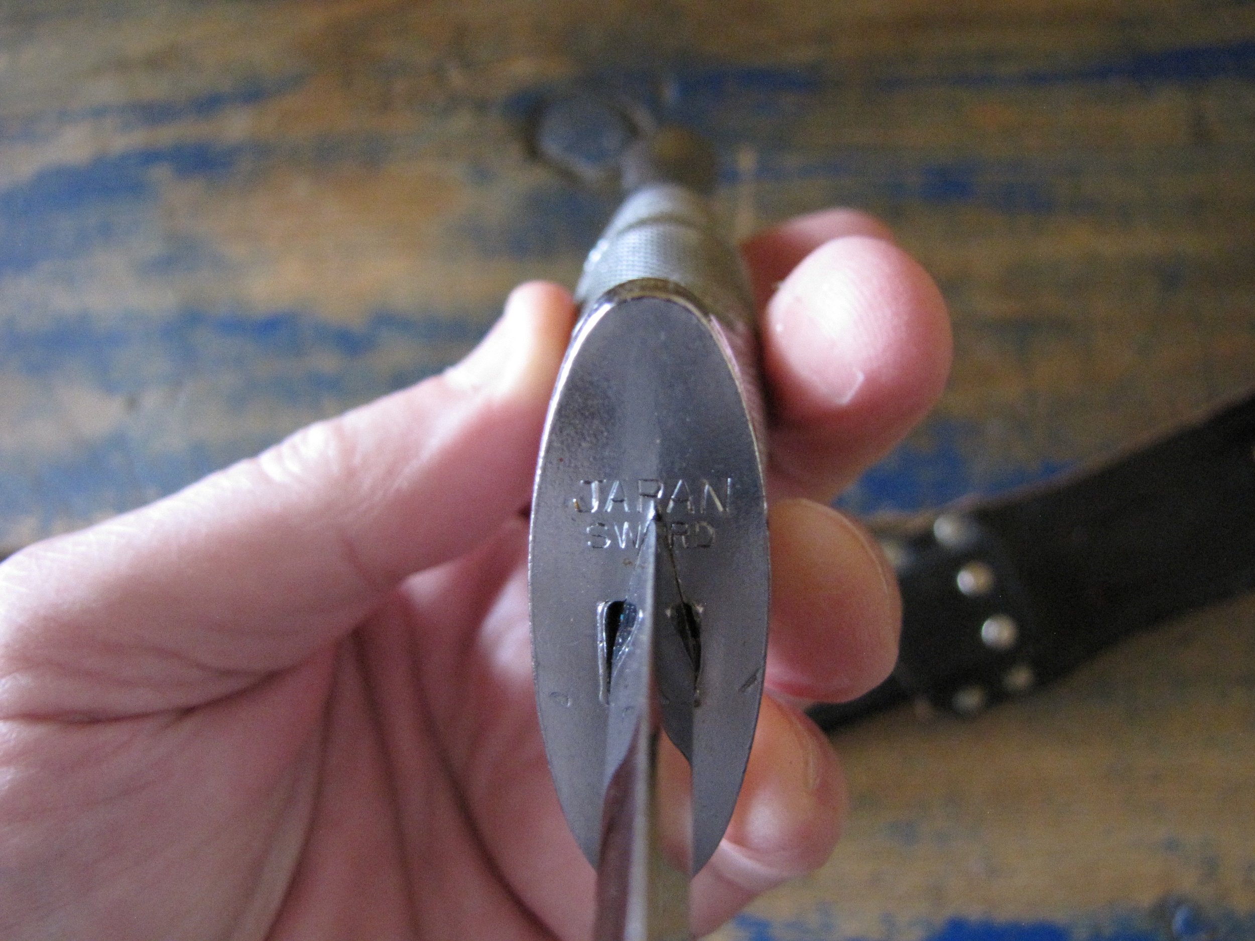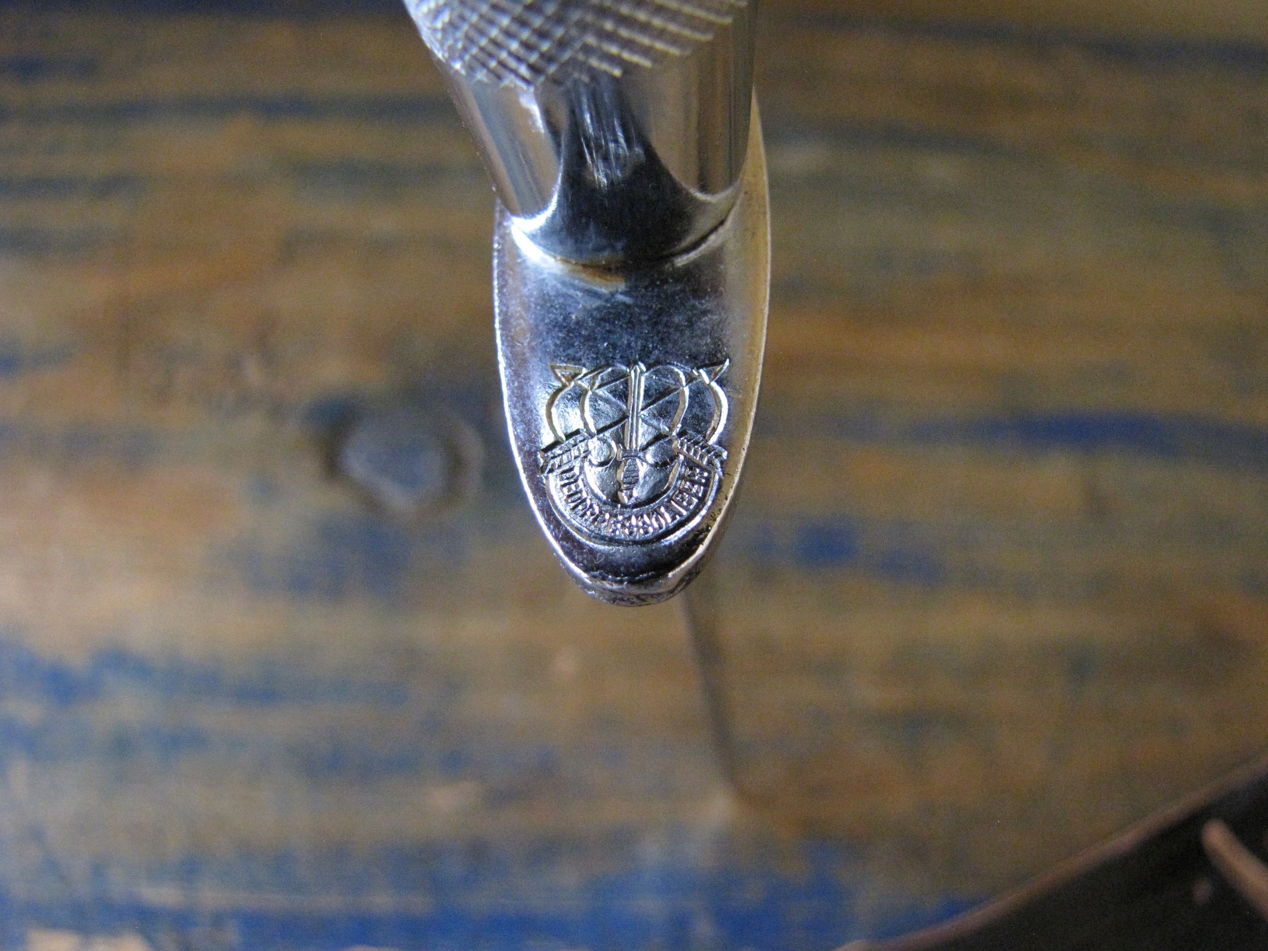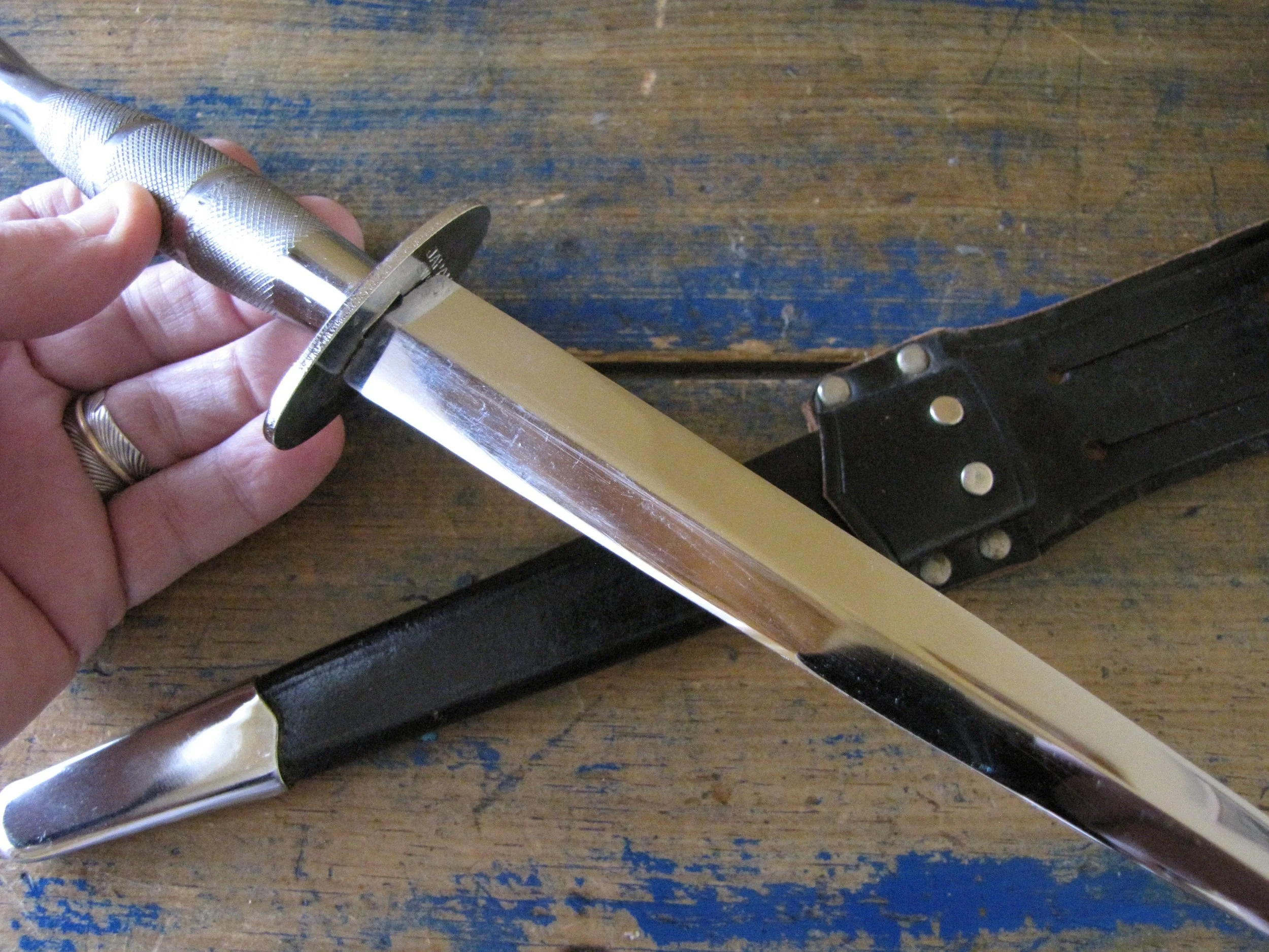A very near flawless example of the desirable c1970s Vietnam 5th Special Forces presentation F-S by Japan Sword. Unused, solid and tight. Two small areas of plating loss (one on the blade and one on the grip) shown in the photos but otherwise just about as-new. Complete with its original and correct scabbard. The chape is a little loose but still strongly attached. The blade is cleanly and clearly engraved ‘5TH SPECIAL FORCES GROUP VIETNAM’.