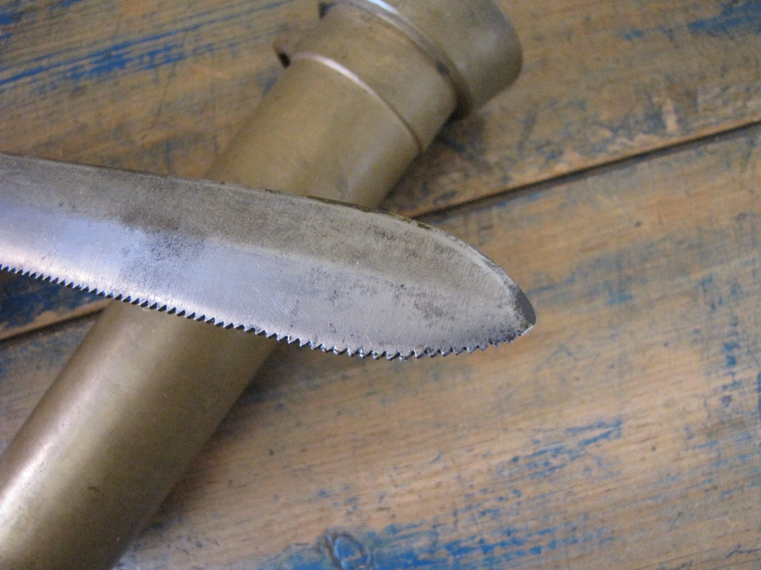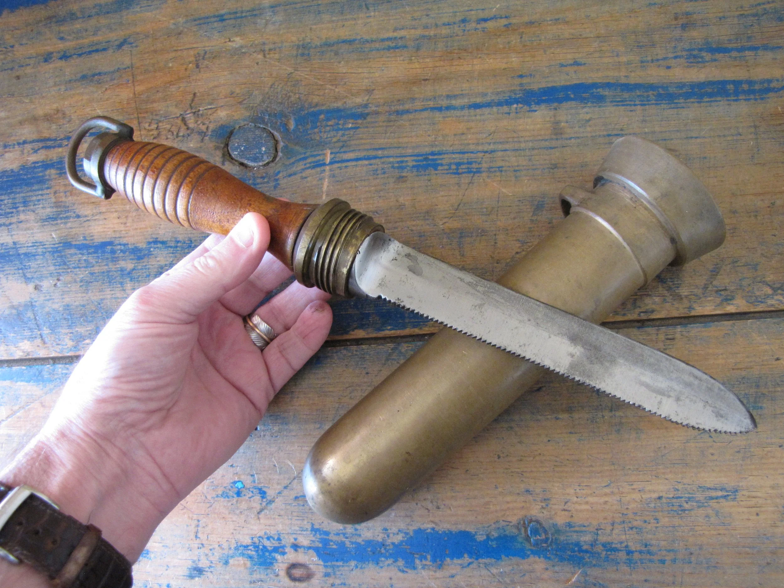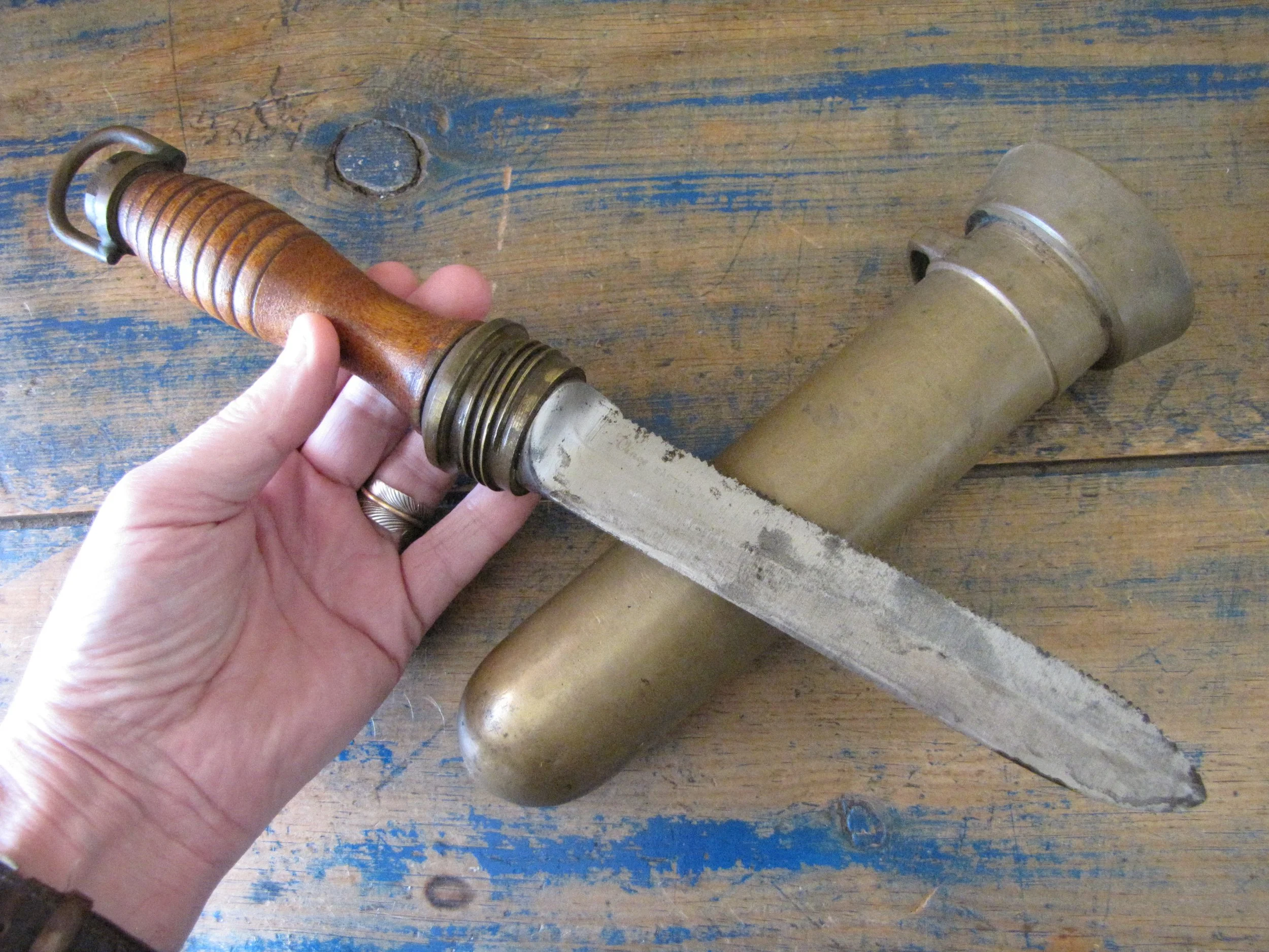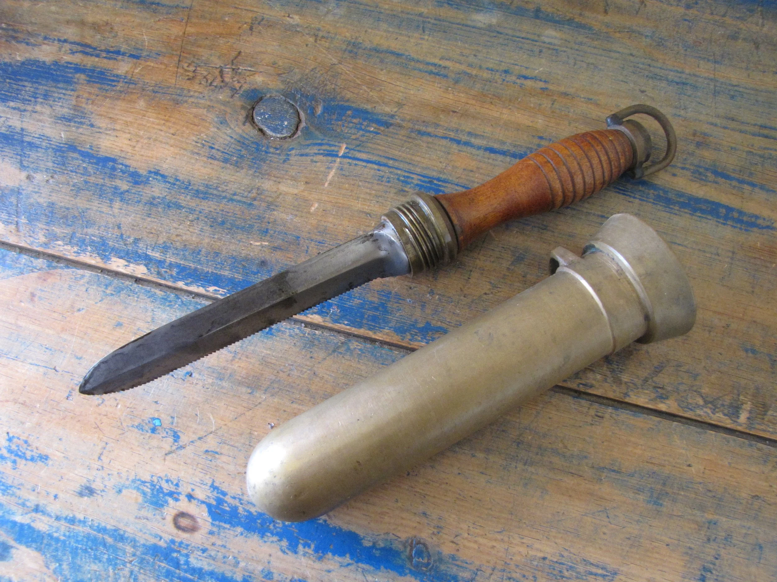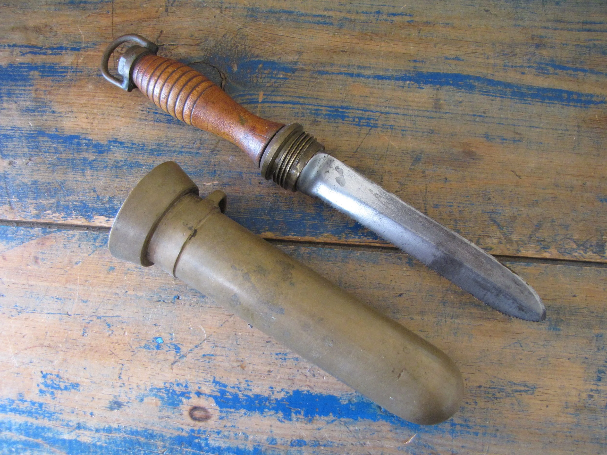 An honest and scarce example of the WWII U.S. Navy Dive Knife. In used condition but honest and complete. The blades on these are lightly etched ‘Vince, EASTON PA. U.S.A.' most of the etching is just visible but now softened due to use. Very slight movement to the ferrel and a couple of small/old cracks to the wooden grip, condition is as shown and very decent considering the the deep sea/salt water use of these knives. A great example of an early U.S. Navy ‘hard-hat’ dive knives that has actually seen service. Not the extra cost on ‘international’ shipping due to the excessive weight on this knife with solid brass sheath. US shipping remains the same.
