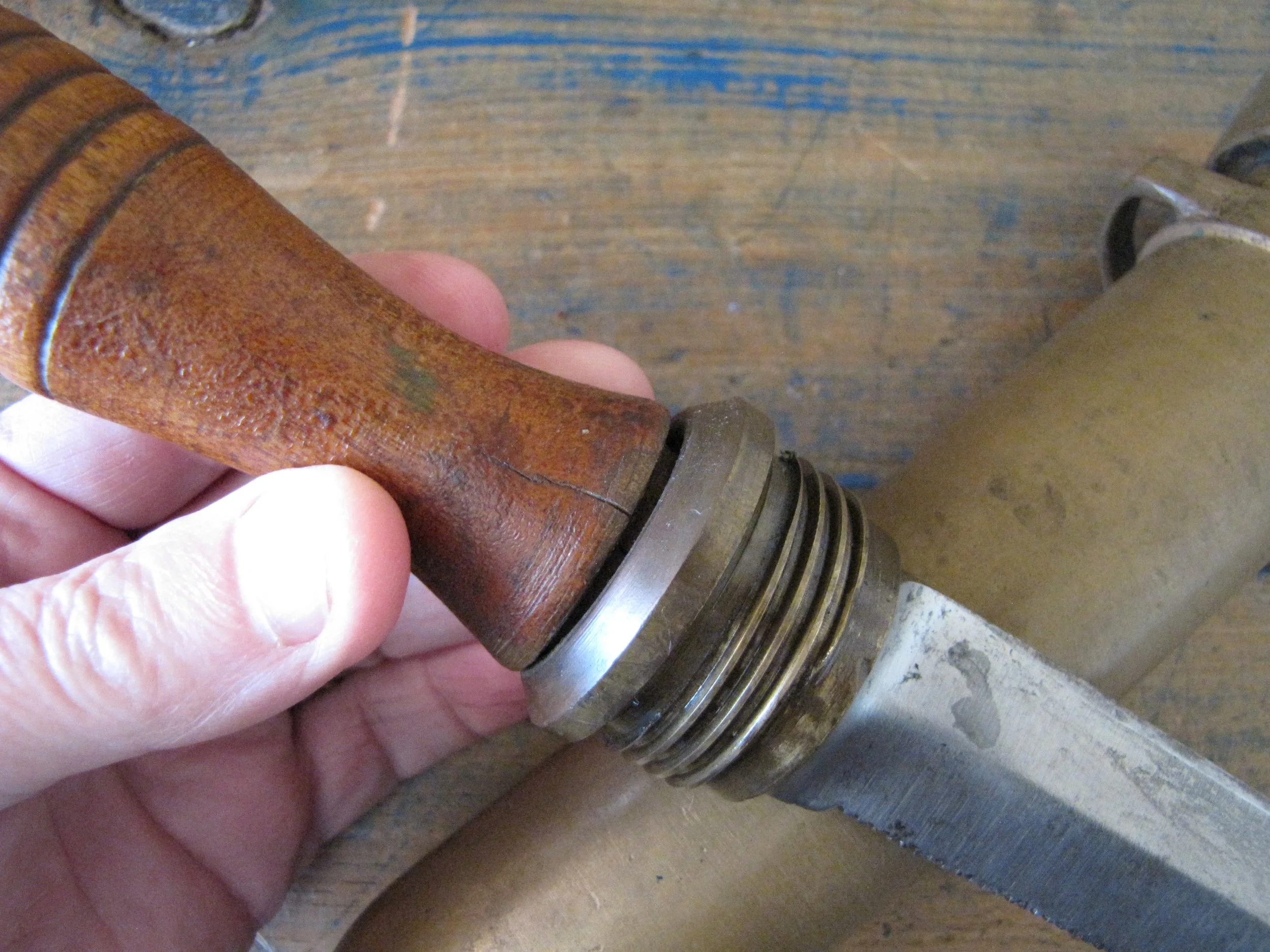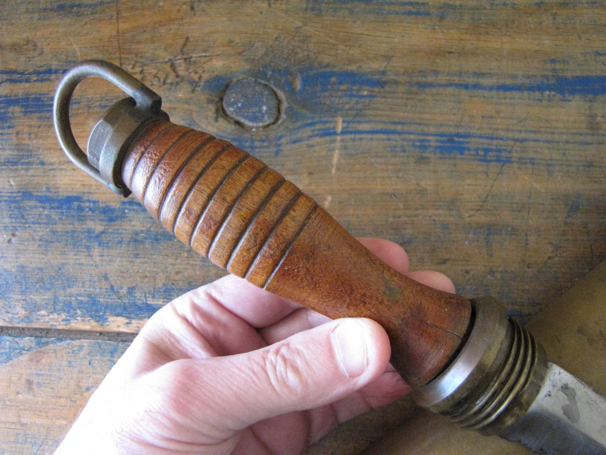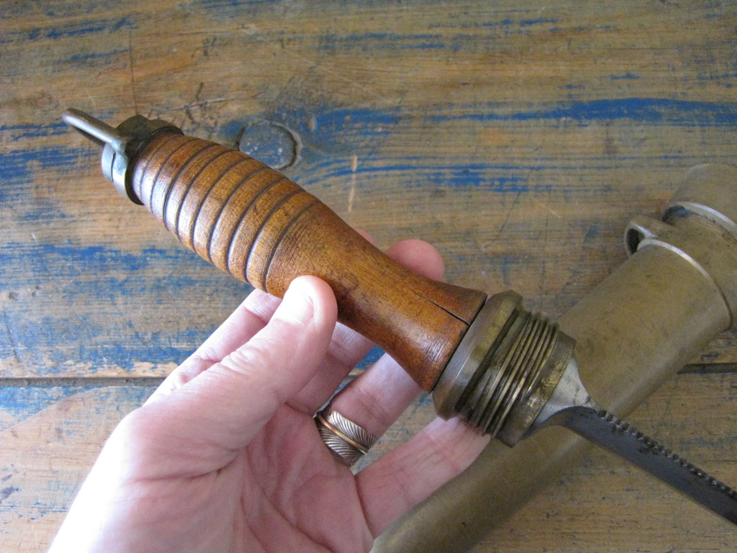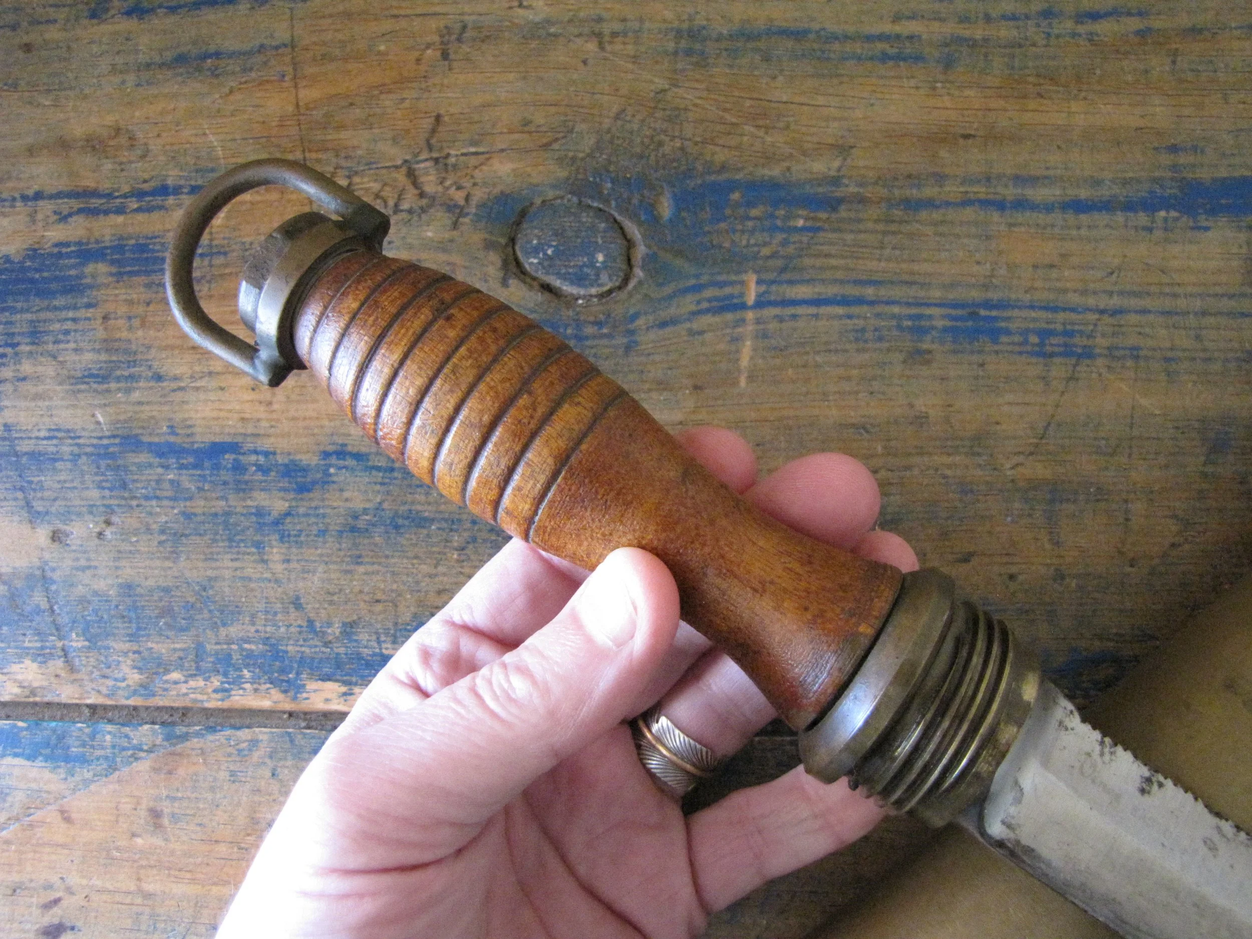 An honest and scarce example of the WWII U.S. Navy Dive Knife. In used condition but honest and complete. The blades on these are lightly etched ‘Vince, EASTON PA. U.S.A.' most of the etching is just visible but now softened due to use. Very slight movement to the ferrel and a couple of small/old cracks to the wooden grip, condition is as shown and very decent considering the the deep sea/salt water use of these knives. A great example of an early U.S. Navy ‘hard-hat’ dive knives that has actually seen service. Not the extra cost on ‘international’ shipping due to the excessive weight on this knife with solid brass sheath. US shipping remains the same.