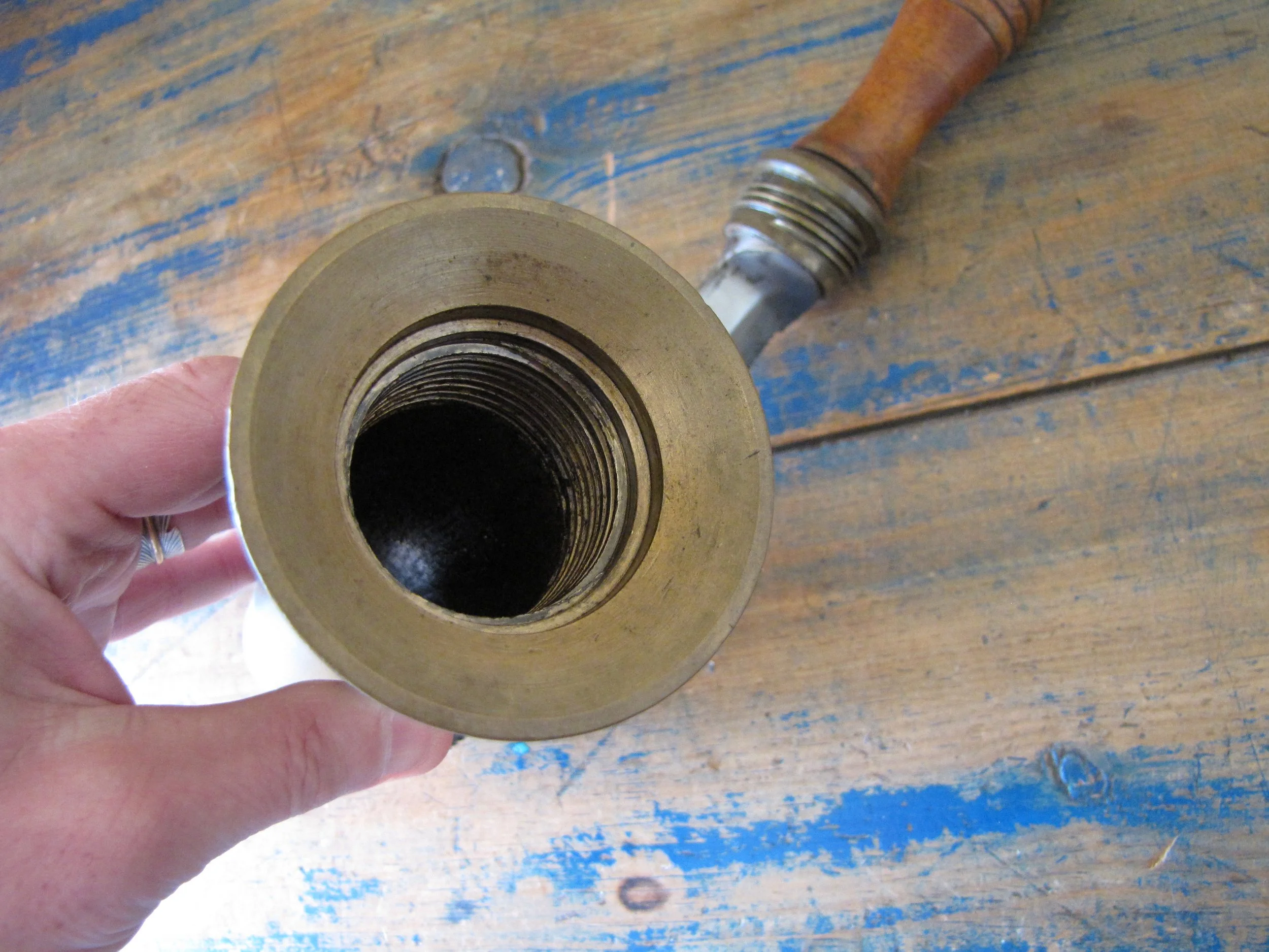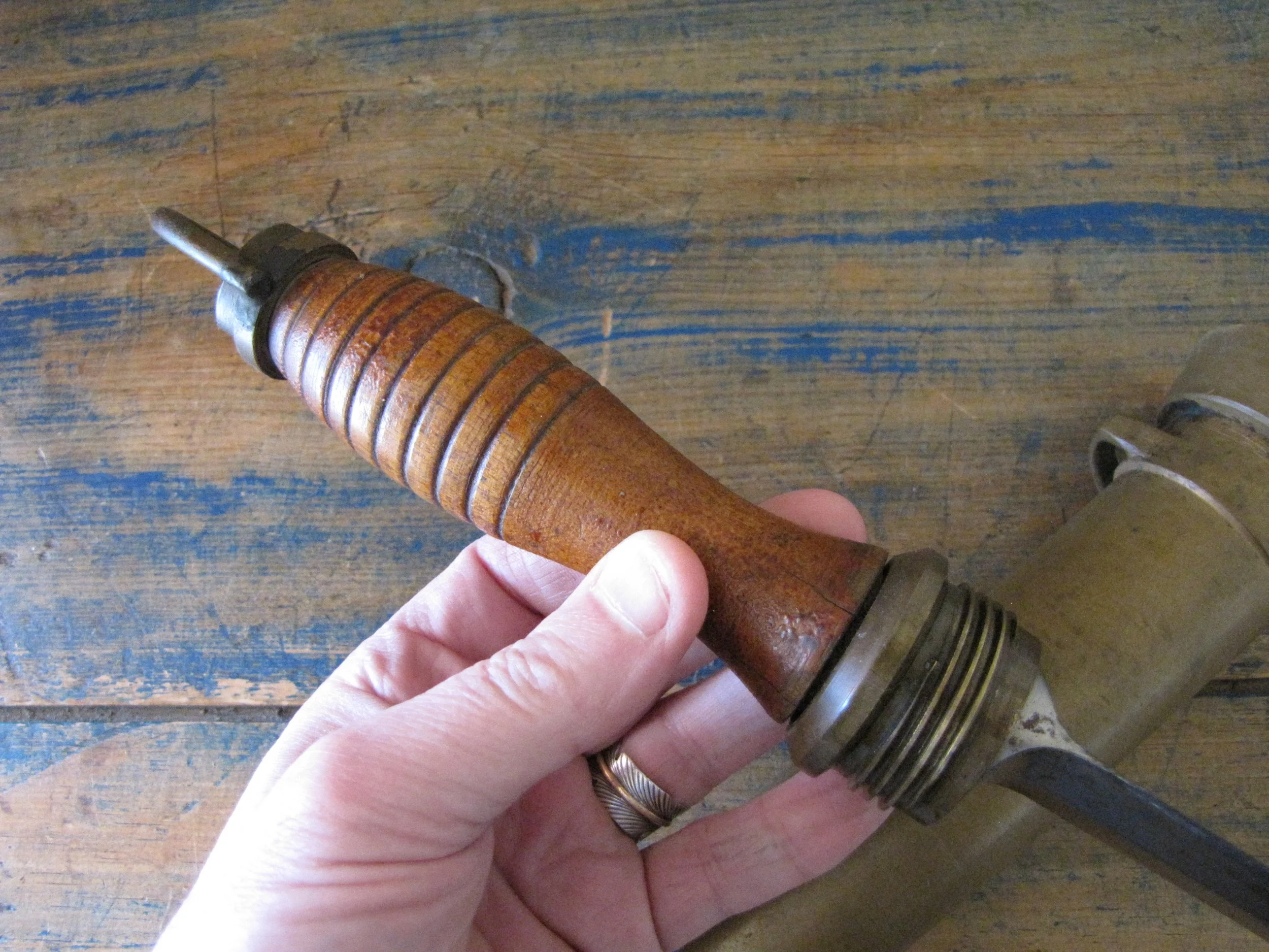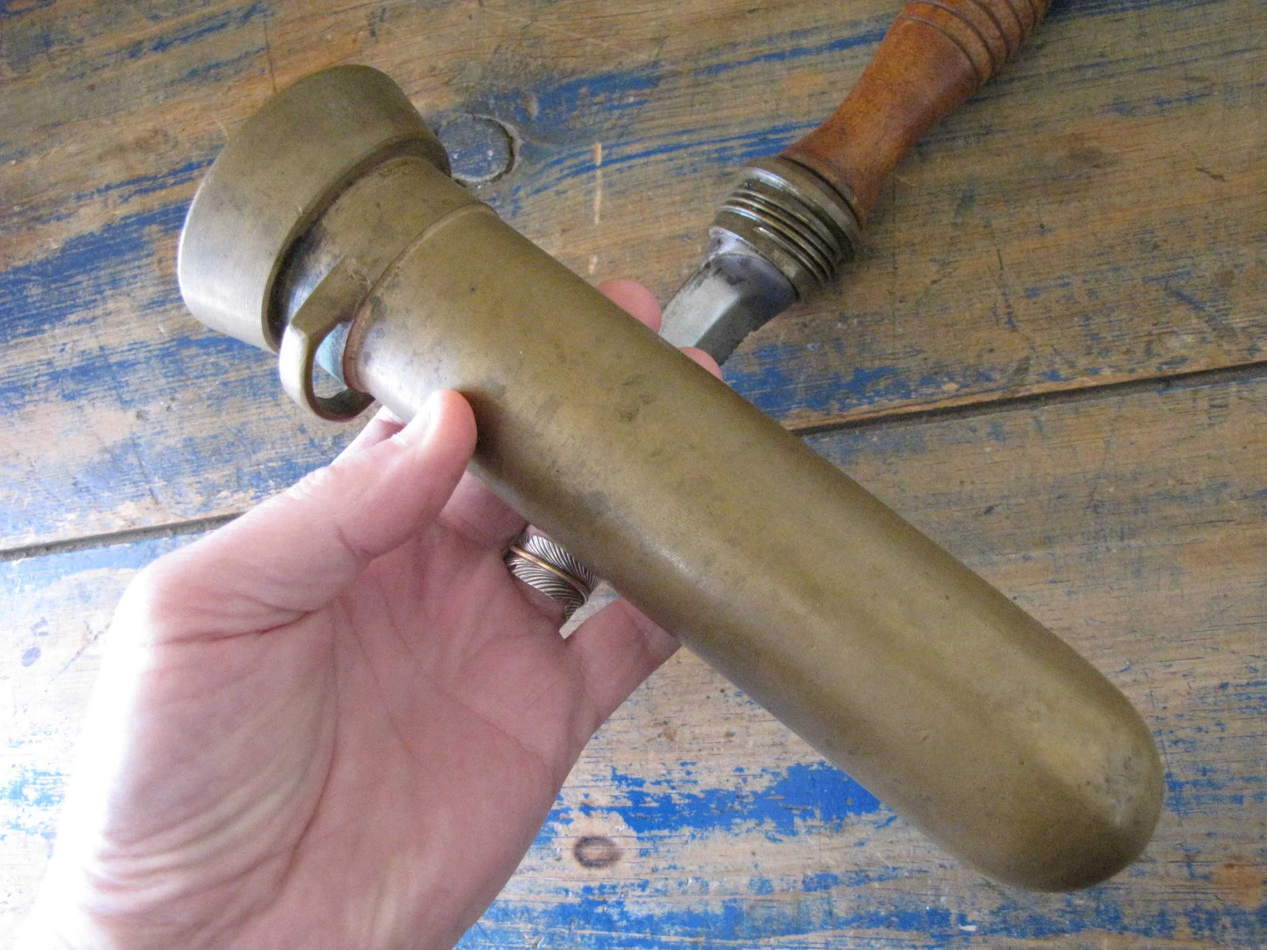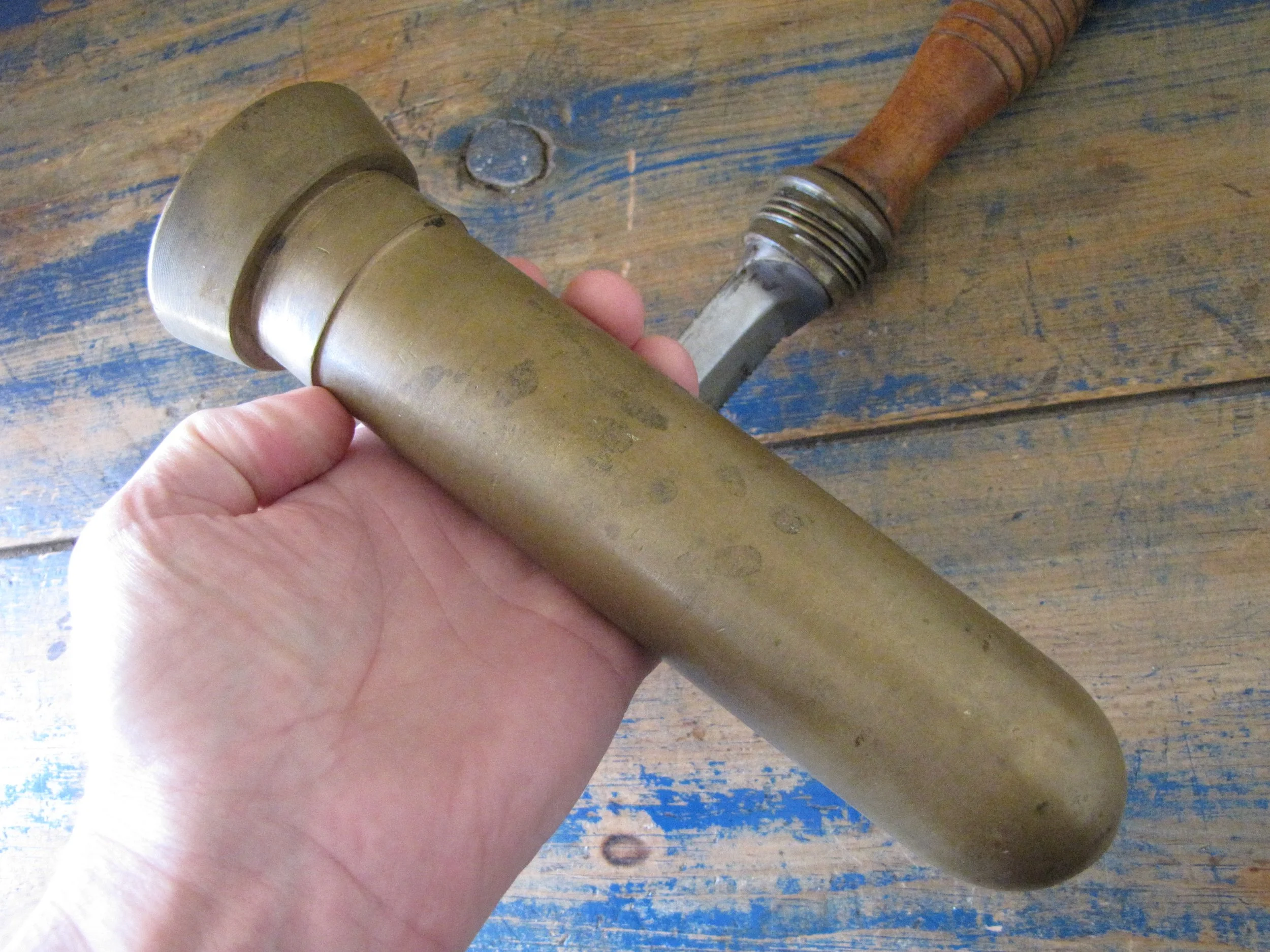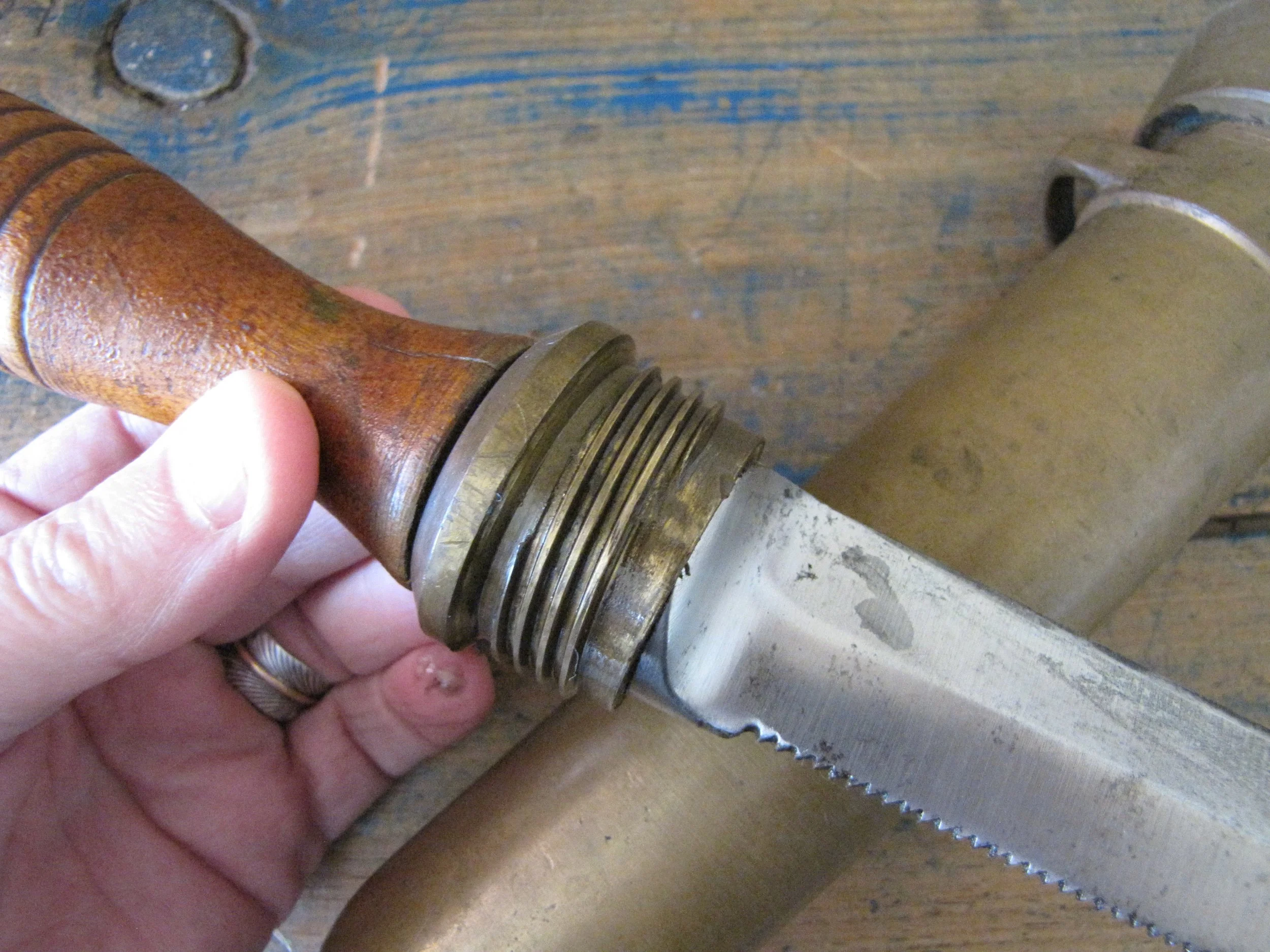 An honest and scarce example of the WWII U.S. Navy Dive Knife. In used condition but honest and complete. The blades on these are lightly etched ‘Vince, EASTON PA. U.S.A.' most of the etching is just visible but now softened due to use. Very slight movement to the ferrel and a couple of small/old cracks to the wooden grip, condition is as shown and very decent considering the the deep sea/salt water use of these knives. A great example of an early U.S. Navy ‘hard-hat’ dive knives that has actually seen service. Not the extra cost on ‘international’ shipping due to the excessive weight on this knife with solid brass sheath. US shipping remains the same.