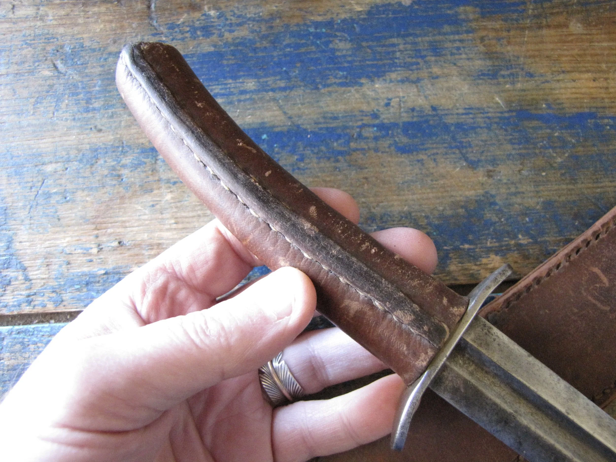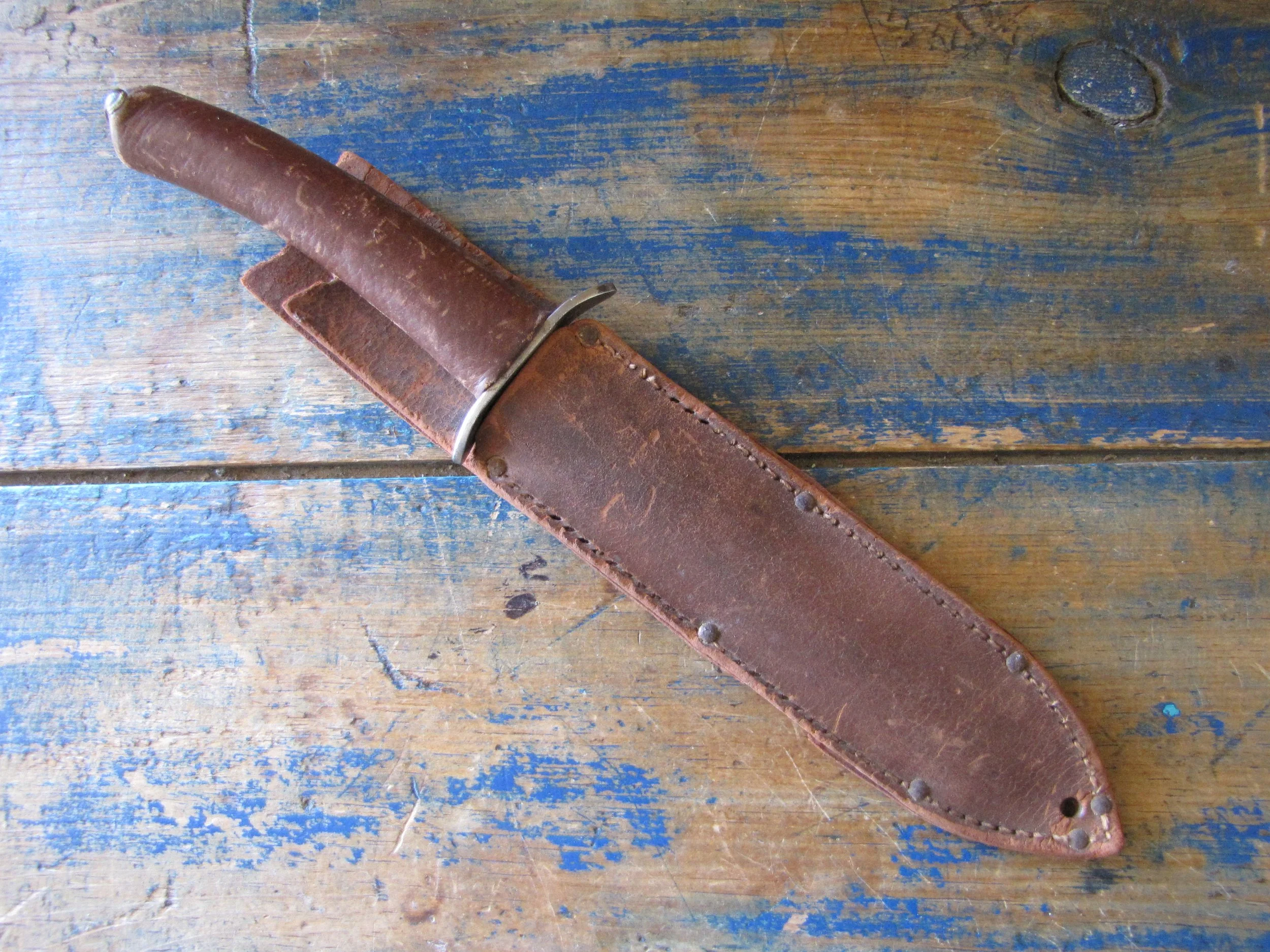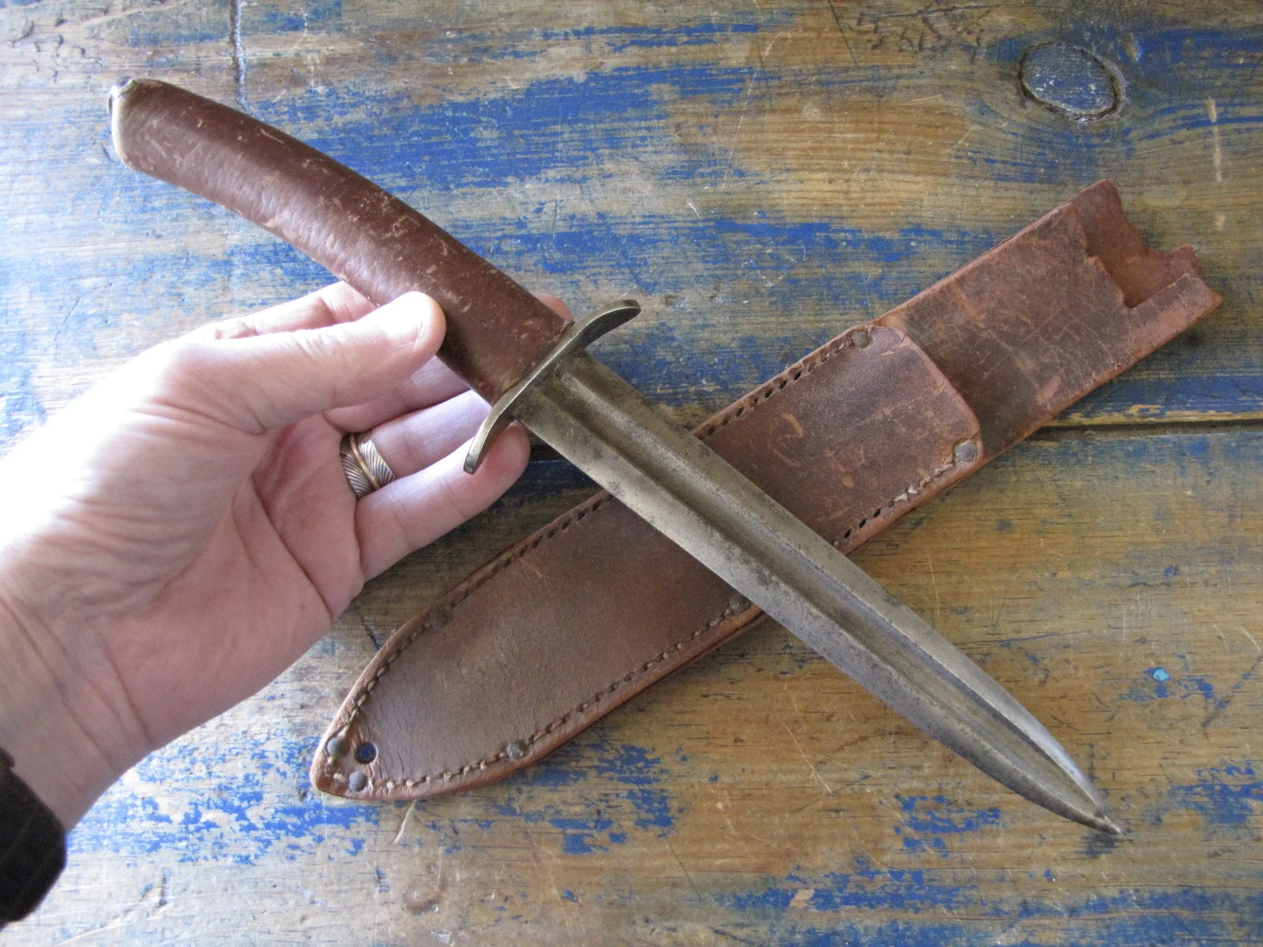 A scarce and solid example of the Knife-Crafters of Philadelphia fighting knife, made using a repurposed Patton sword blade. The sheath is not original and in poor condition. Overall length is just over 12” with a 6 7/8” blade. Shows general use and wear throughout but remaining in solid and serviceable condition.
