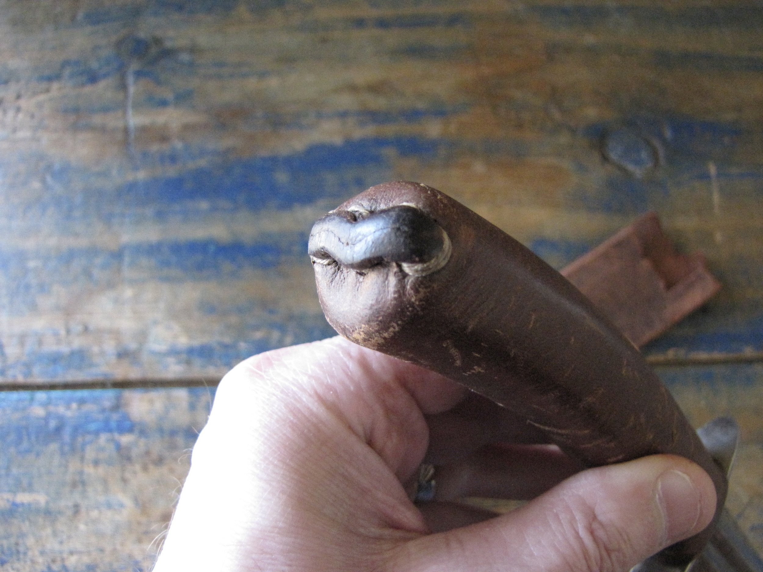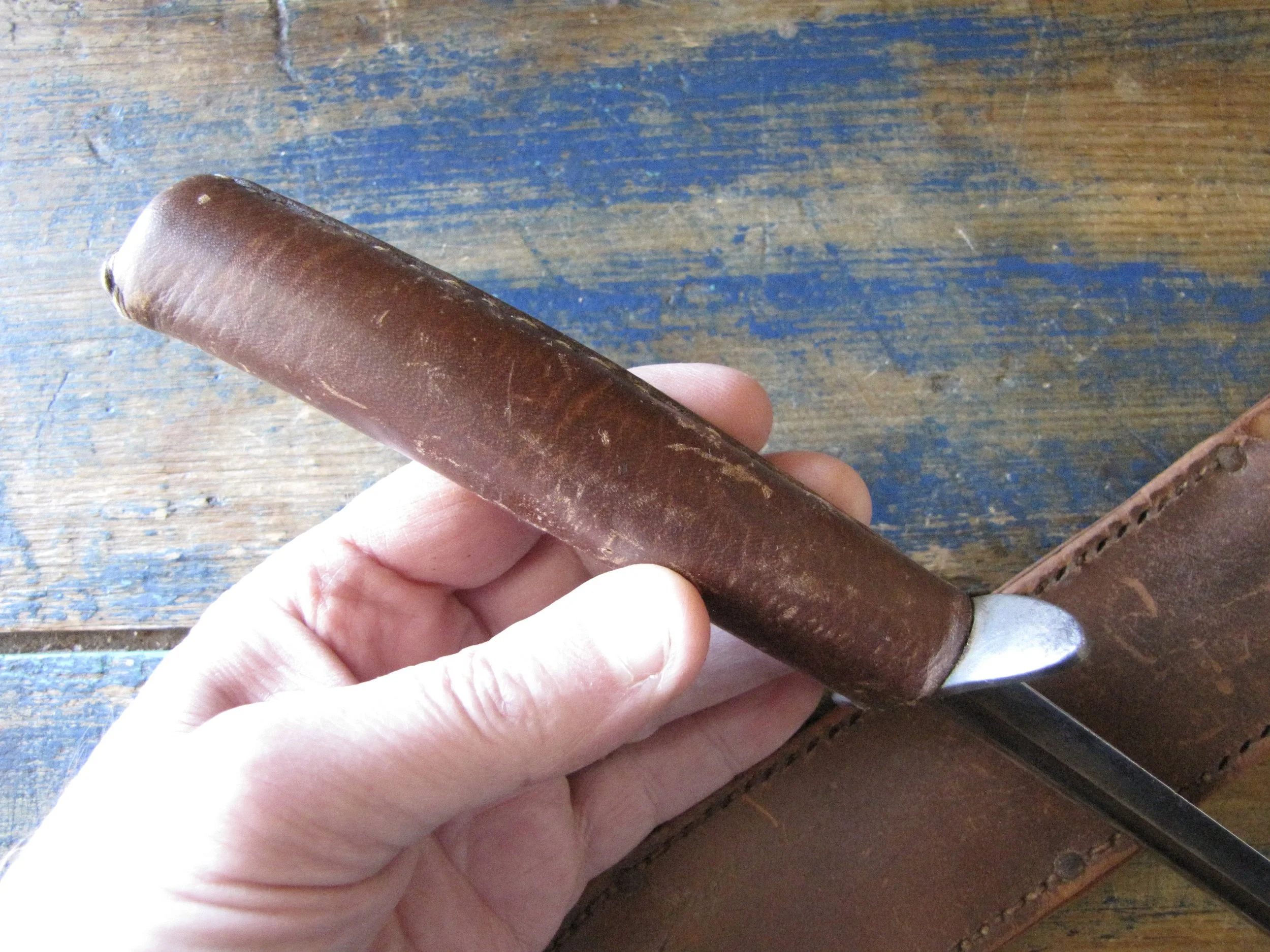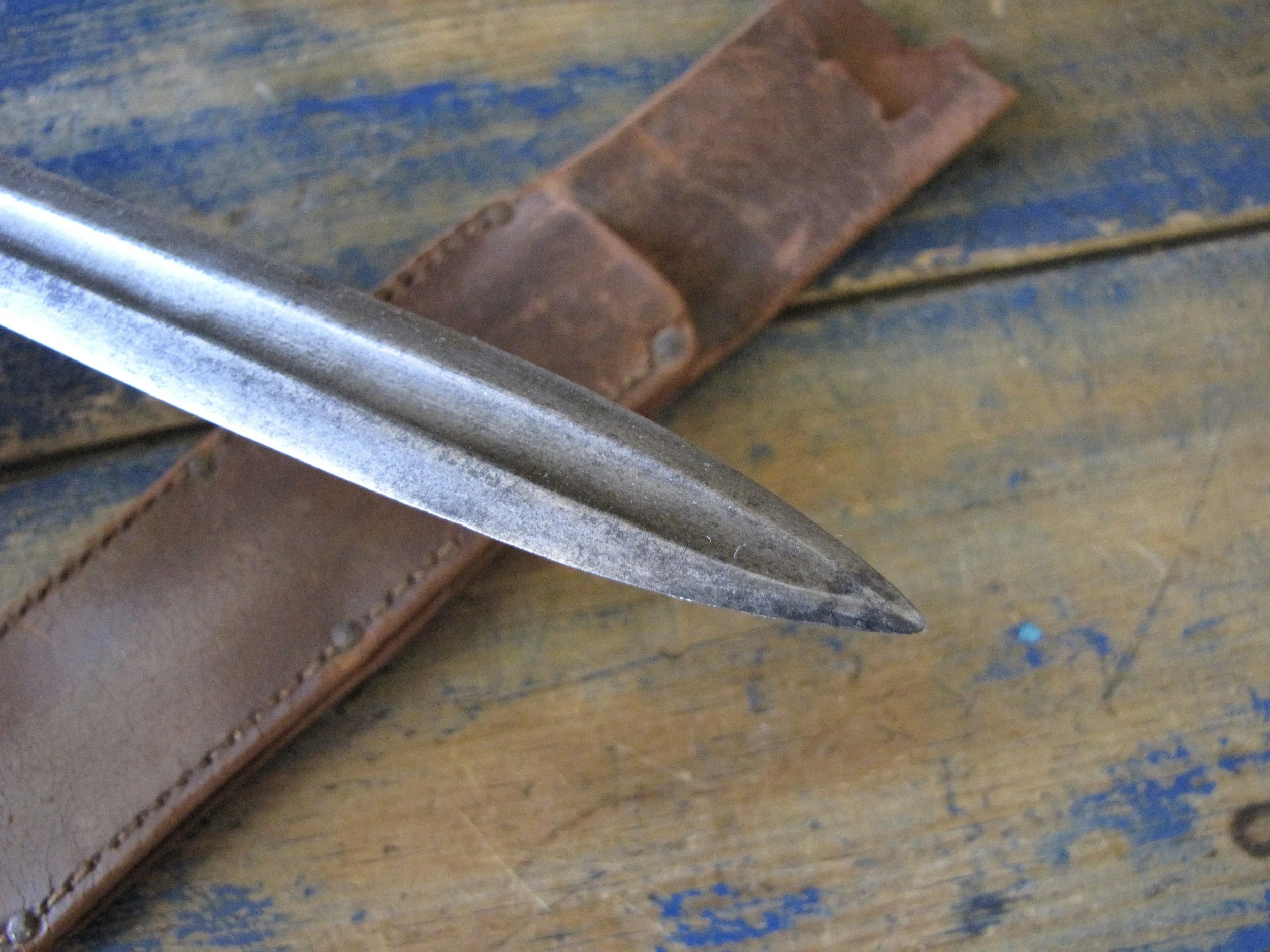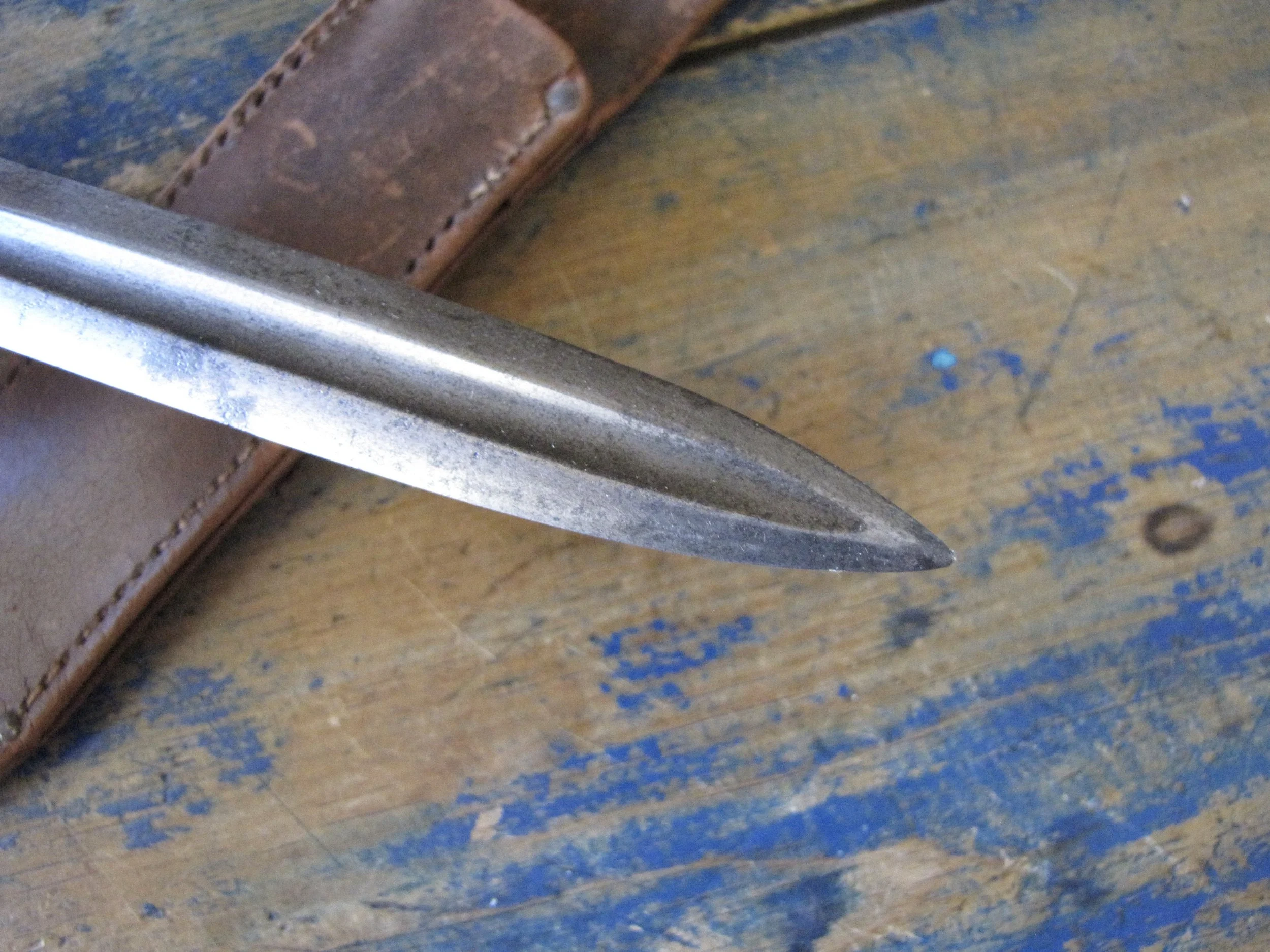 A scarce and solid example of the Knife-Crafters of Philadelphia fighting knife, made using a repurposed Patton sword blade. The sheath is not original and in poor condition. Overall length is just over 12” with a 6 7/8” blade. Shows general use and wear throughout but remaining in solid and serviceable condition.