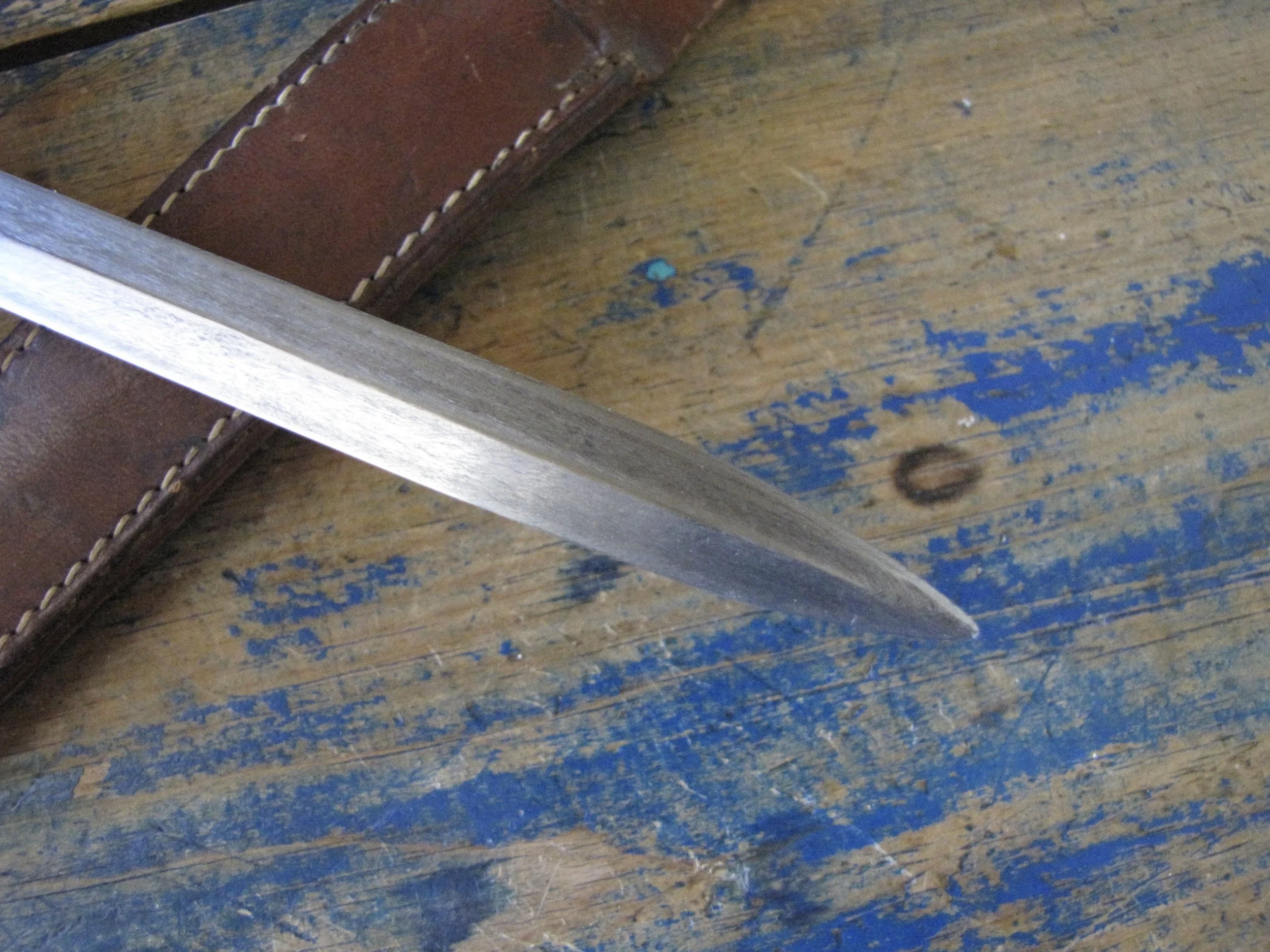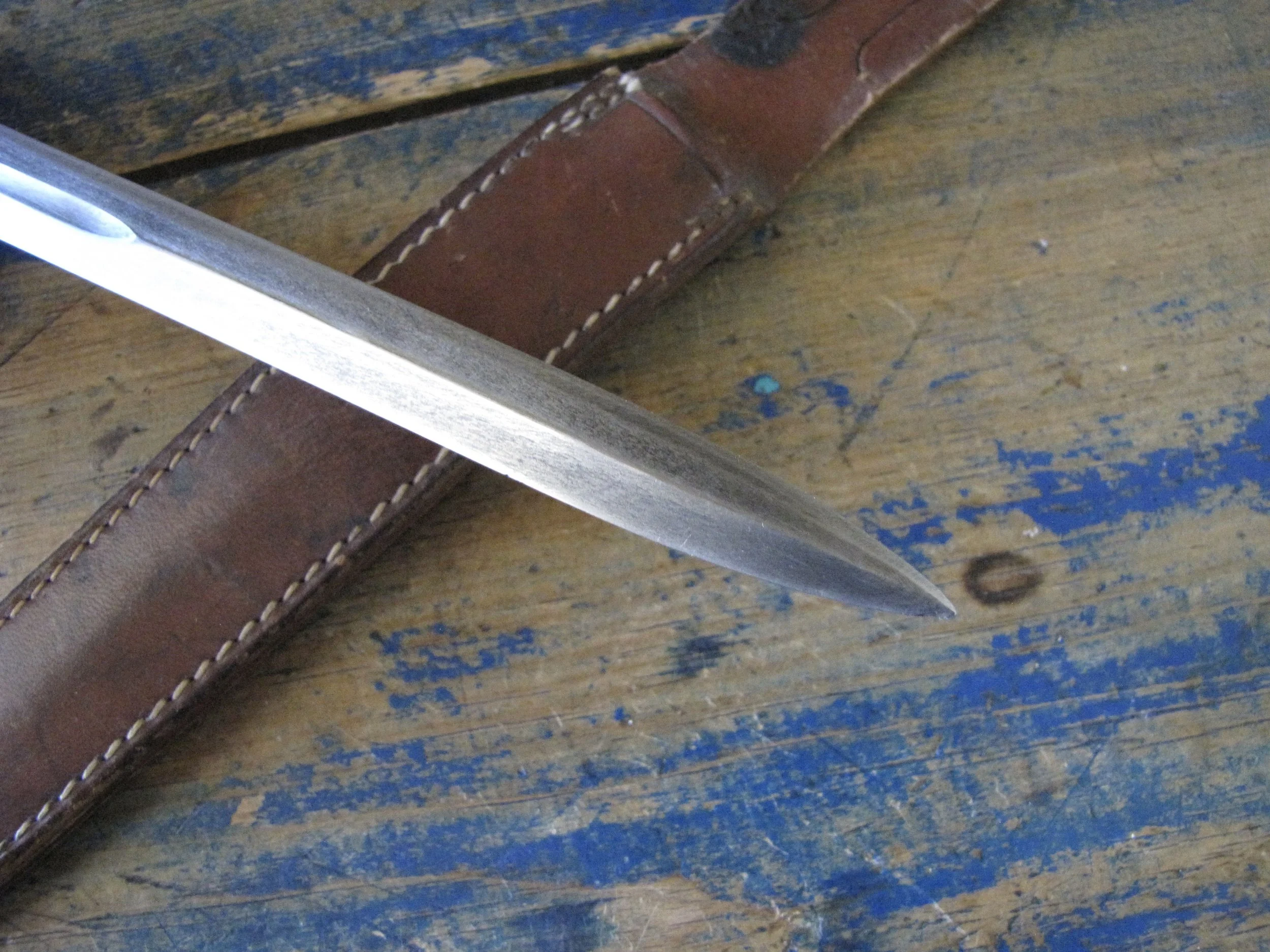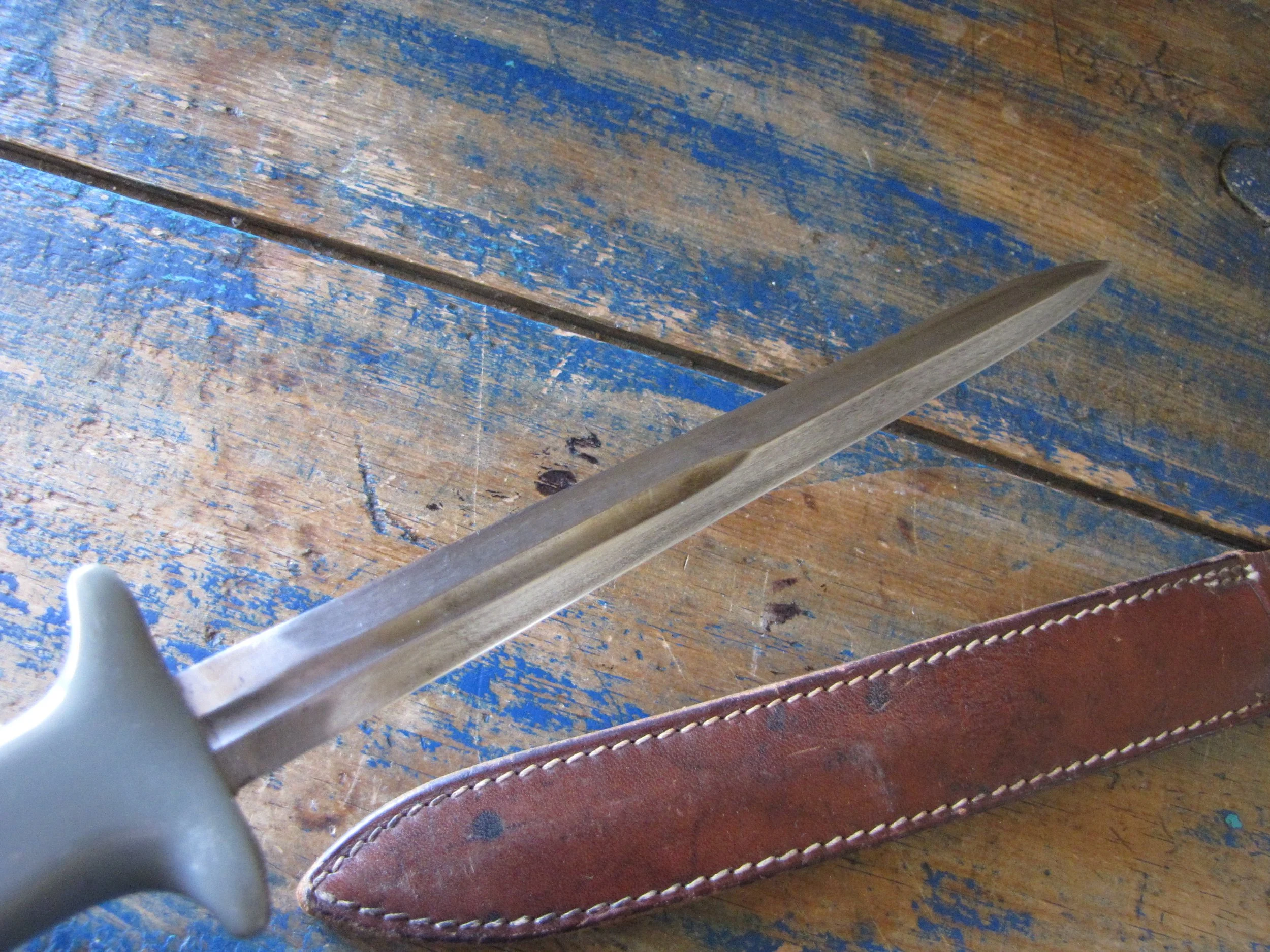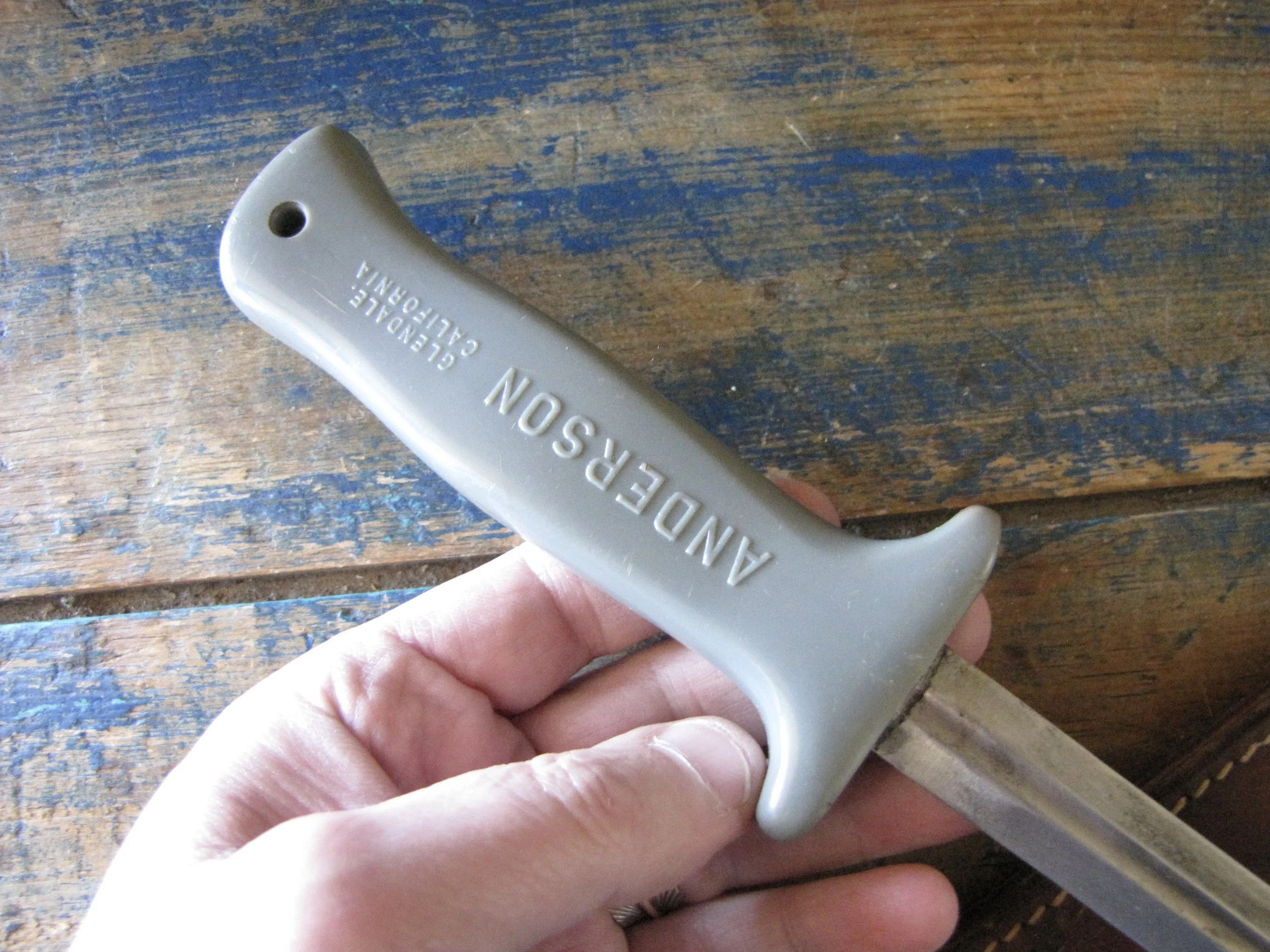 A nice example of the WWII Anderson fighting knife, utilizing the tip of a Patton sword blade. A good solid and clean example with an overall length of 13 1/2” and with a 8 1/4” blade.
