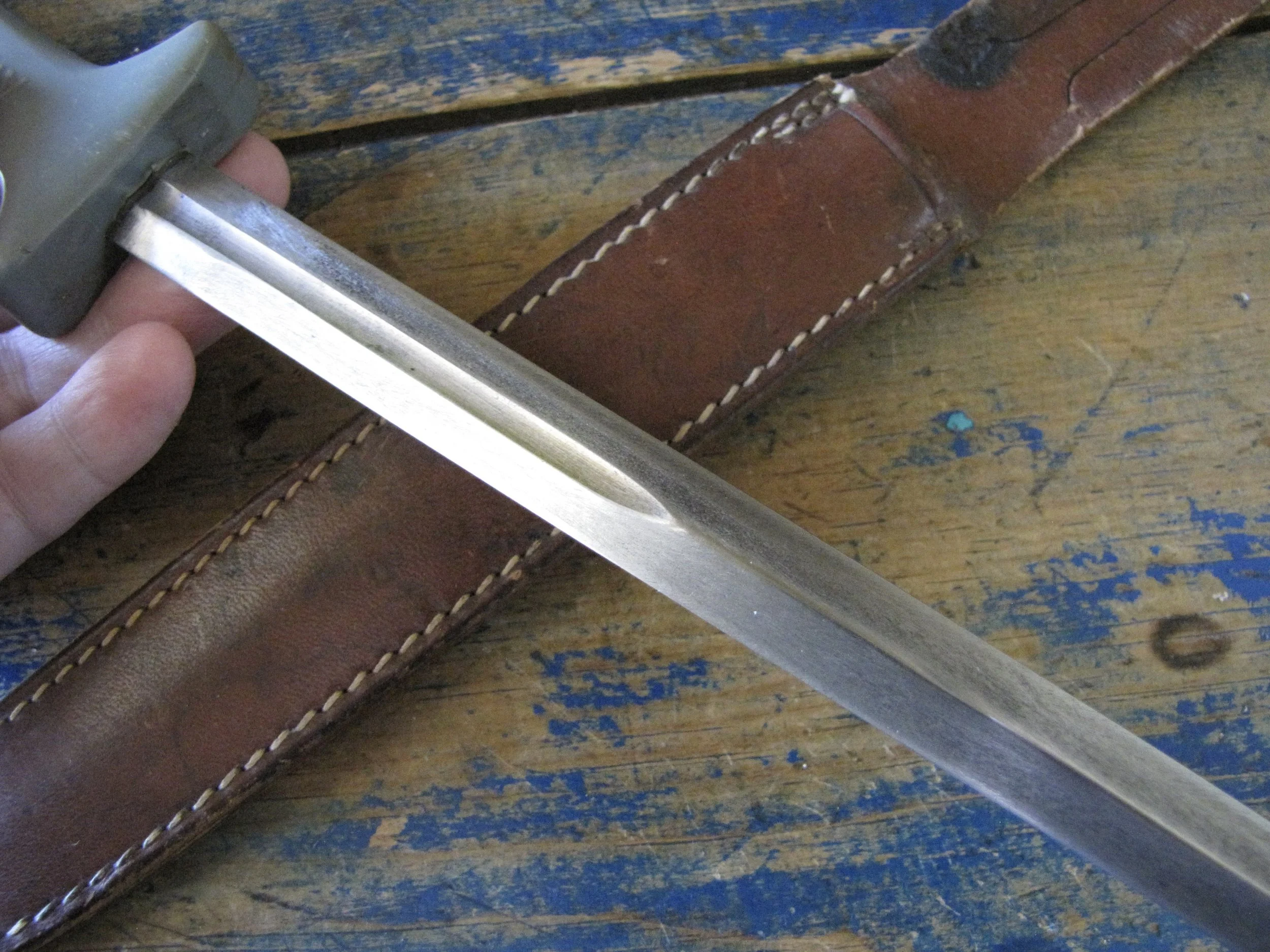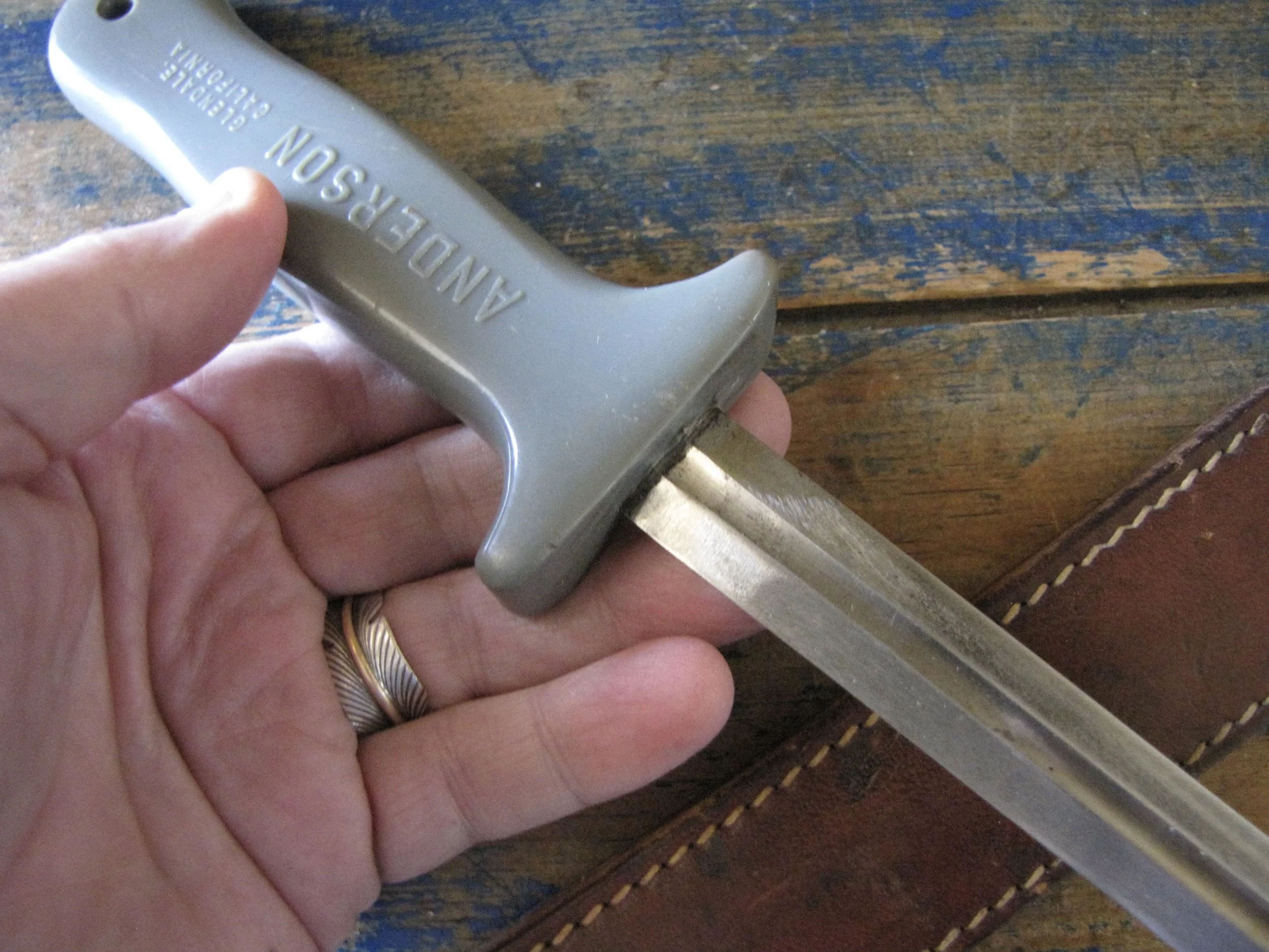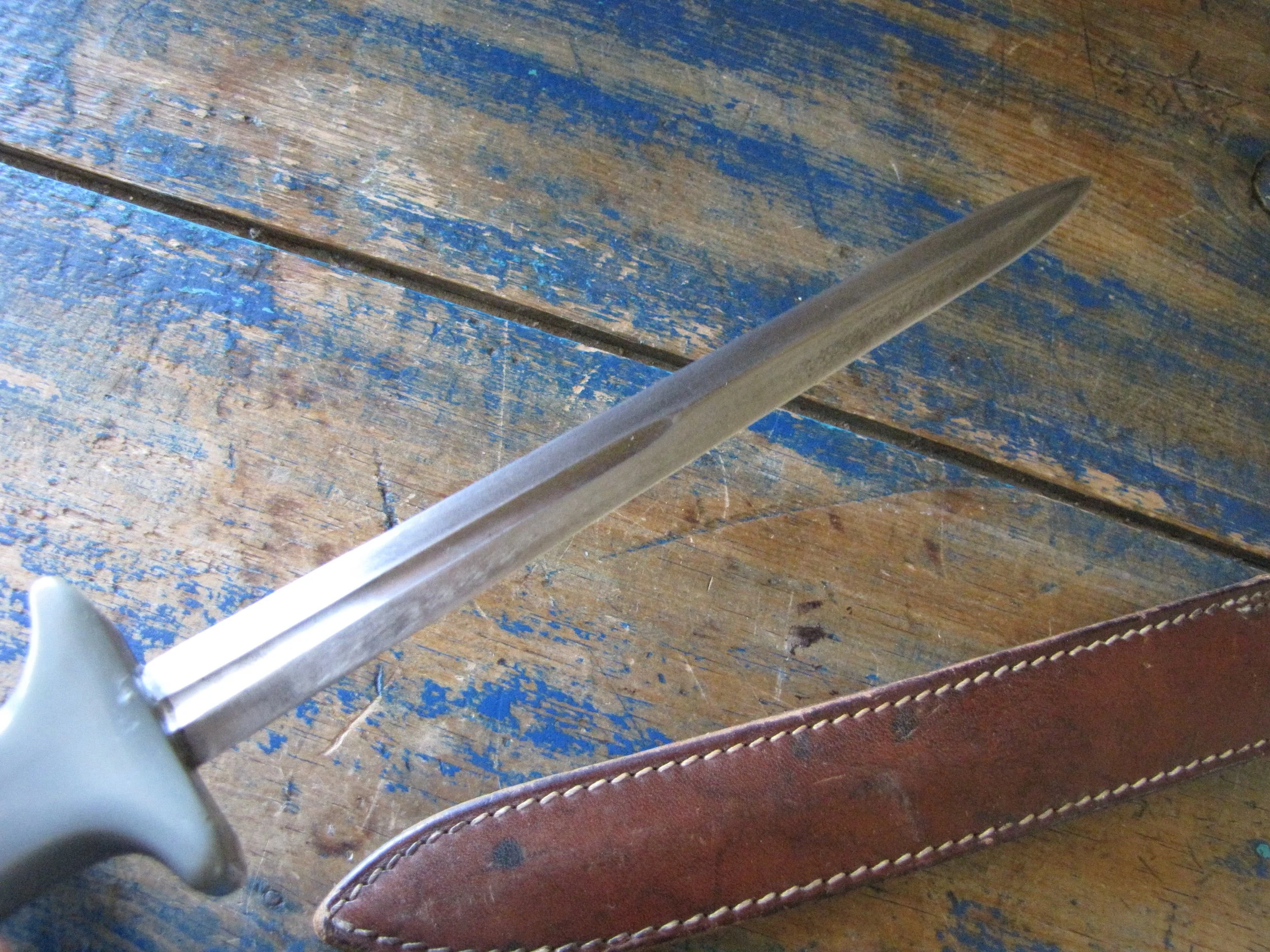 A nice example of the WWII Anderson fighting knife, utilizing the tip of a Patton sword blade. A good solid and clean example with an overall length of 13 1/2” and with a 8 1/4” blade.
