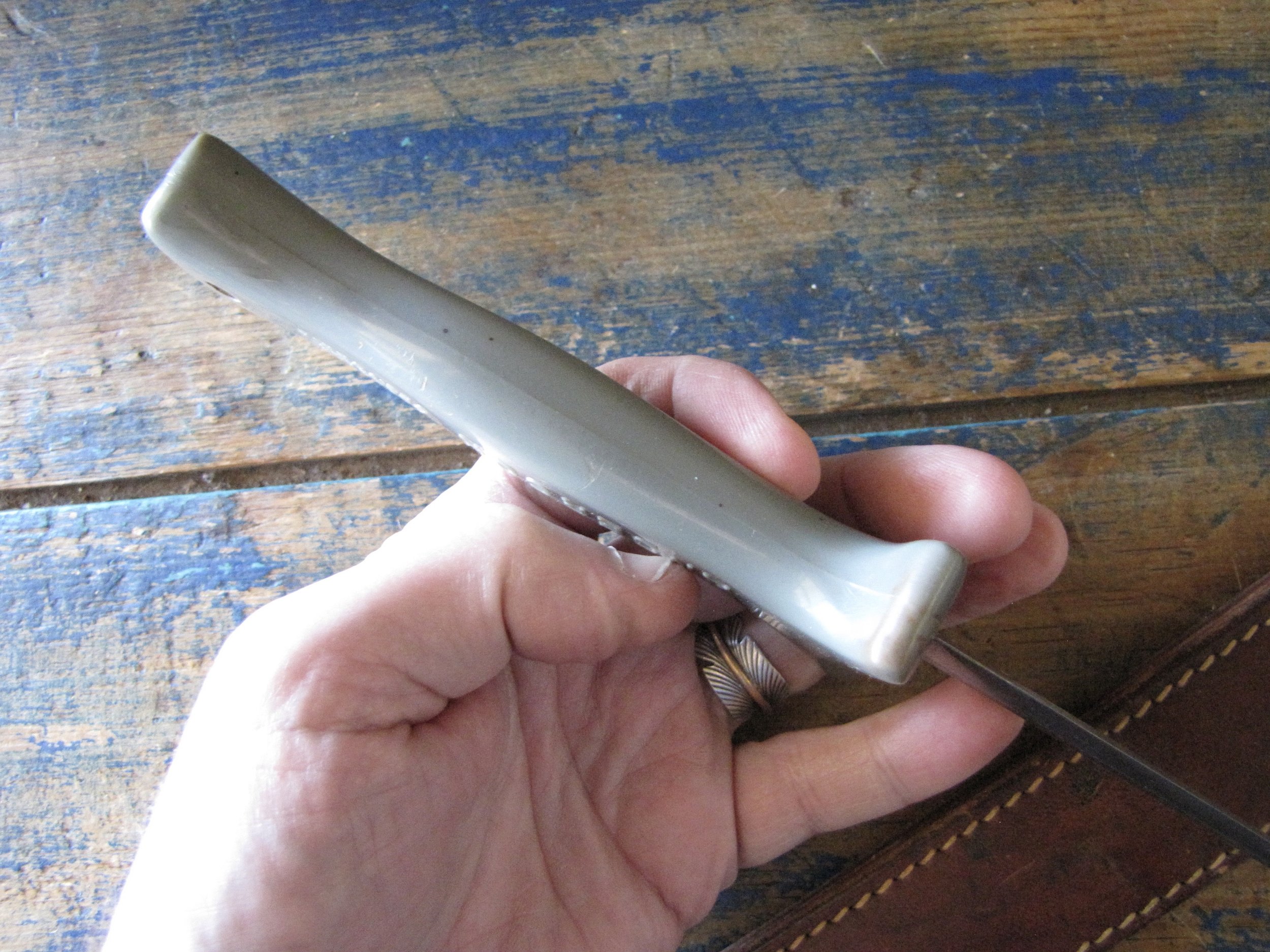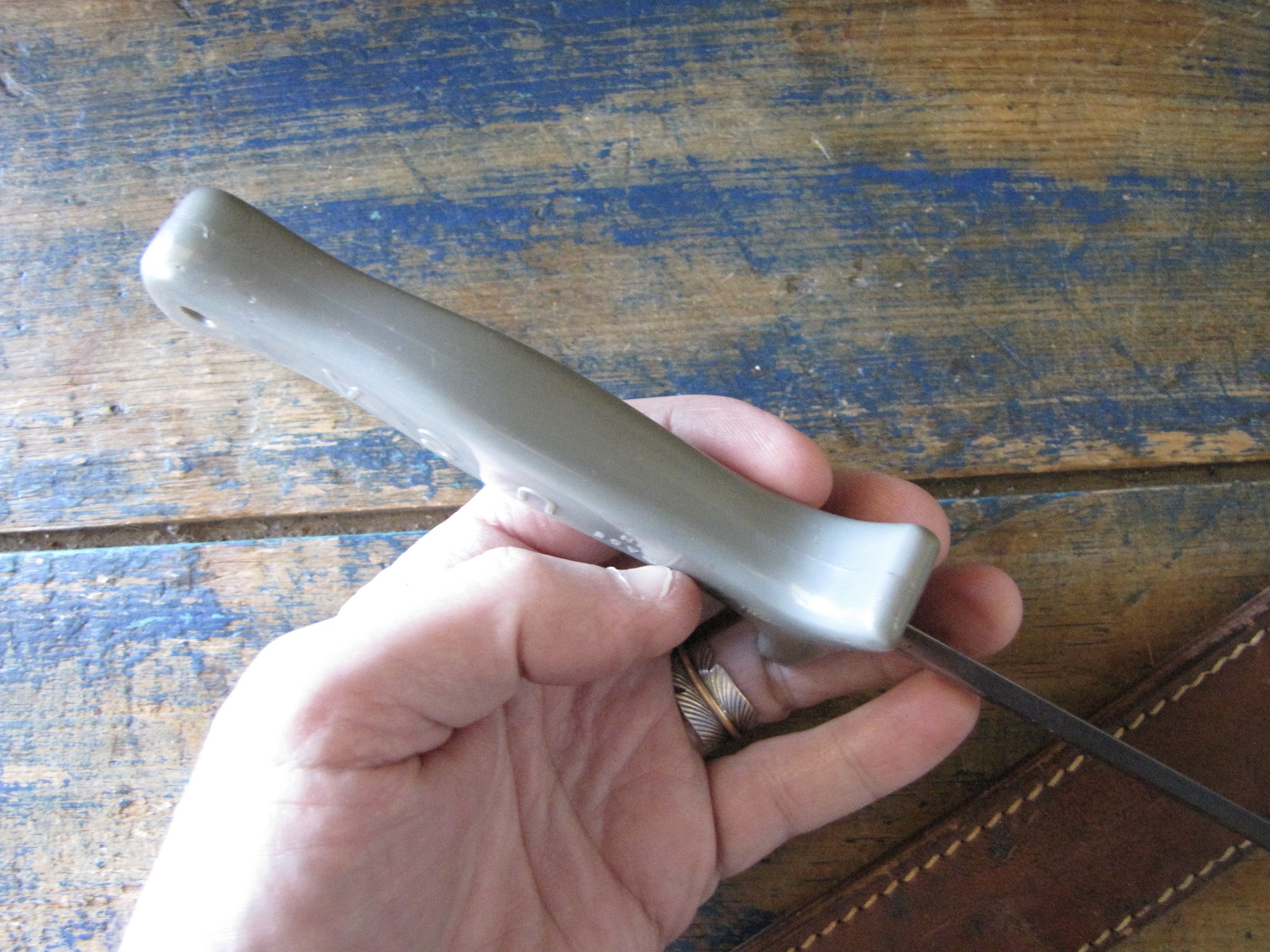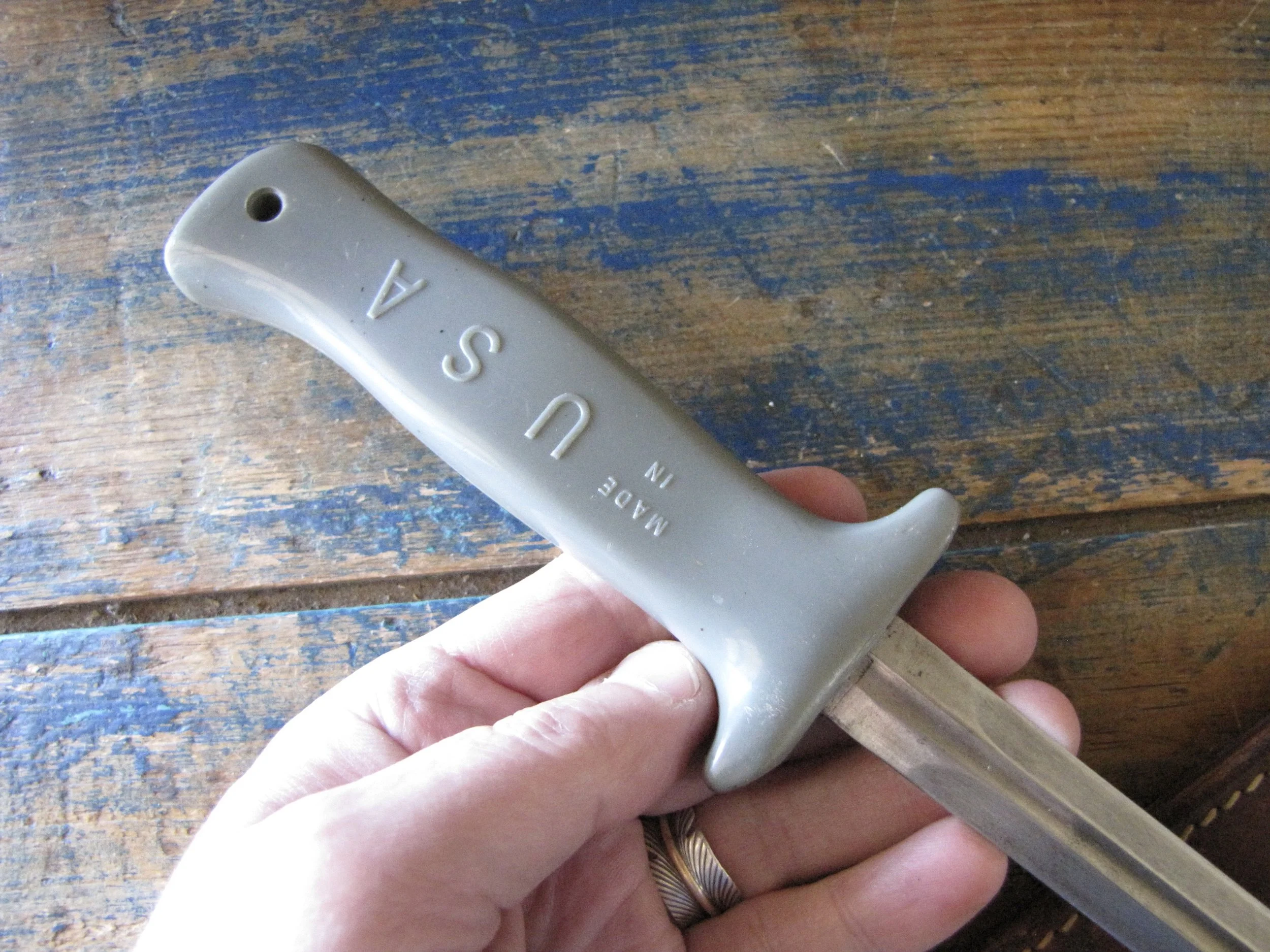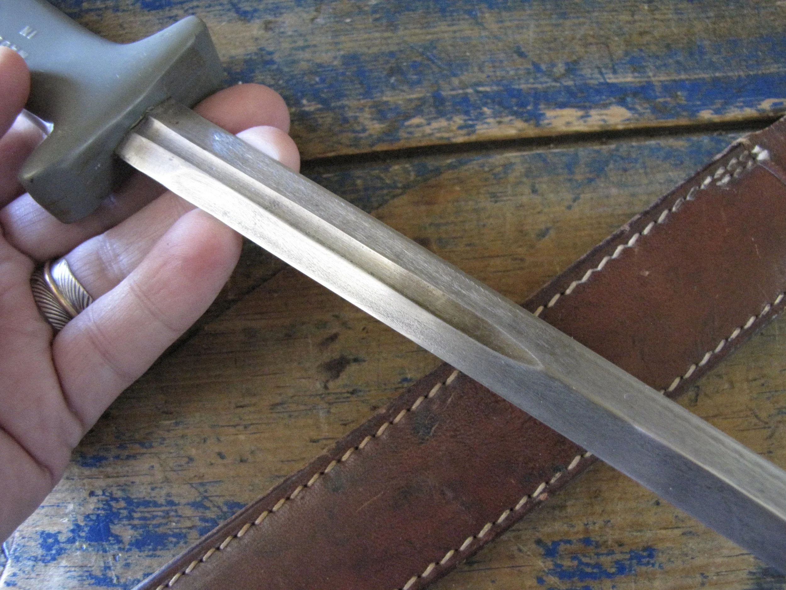 A nice example of the WWII Anderson fighting knife, utilizing the tip of a Patton sword blade. A good solid and clean example with an overall length of 13 1/2” and with a 8 1/4” blade.