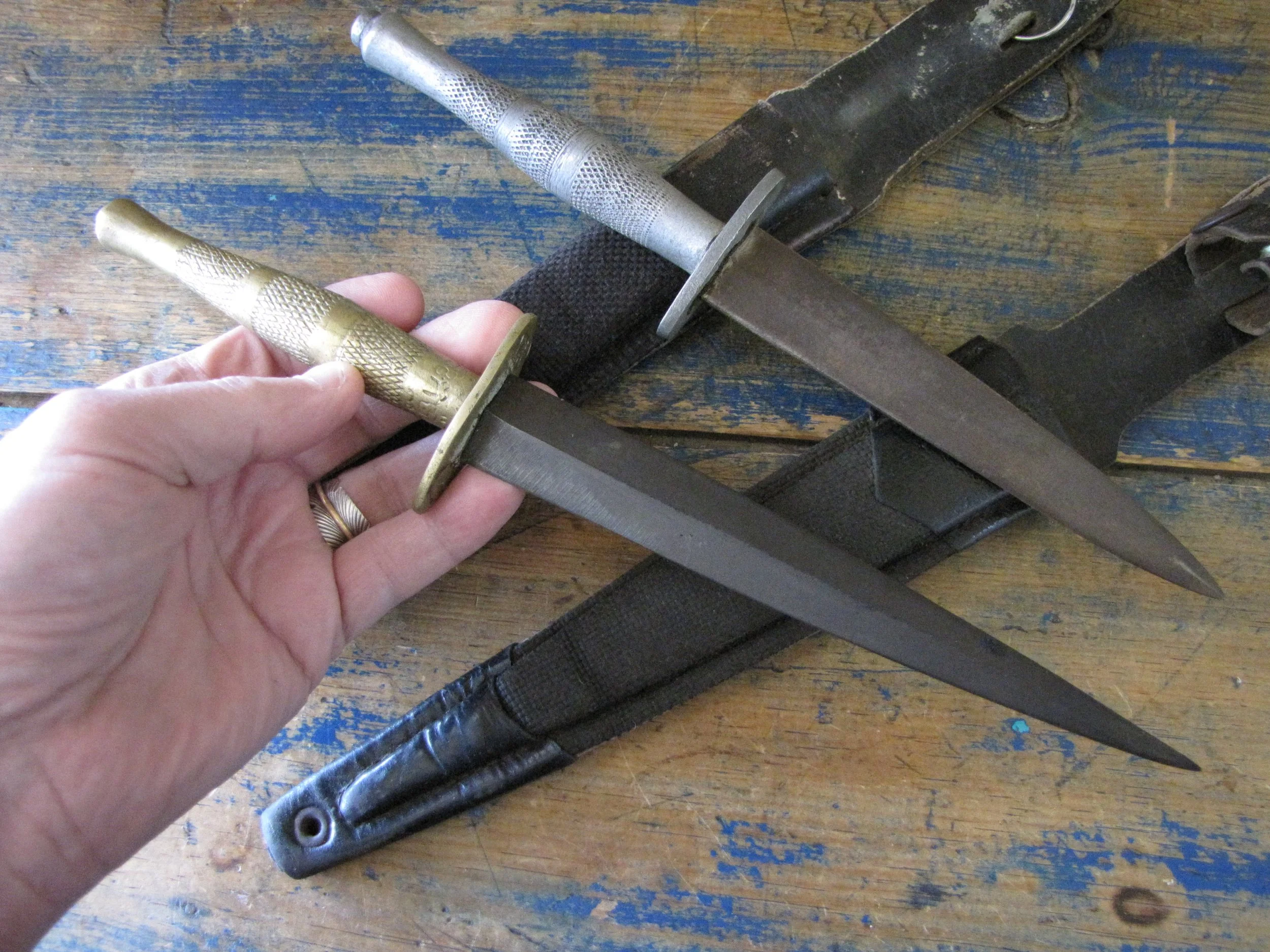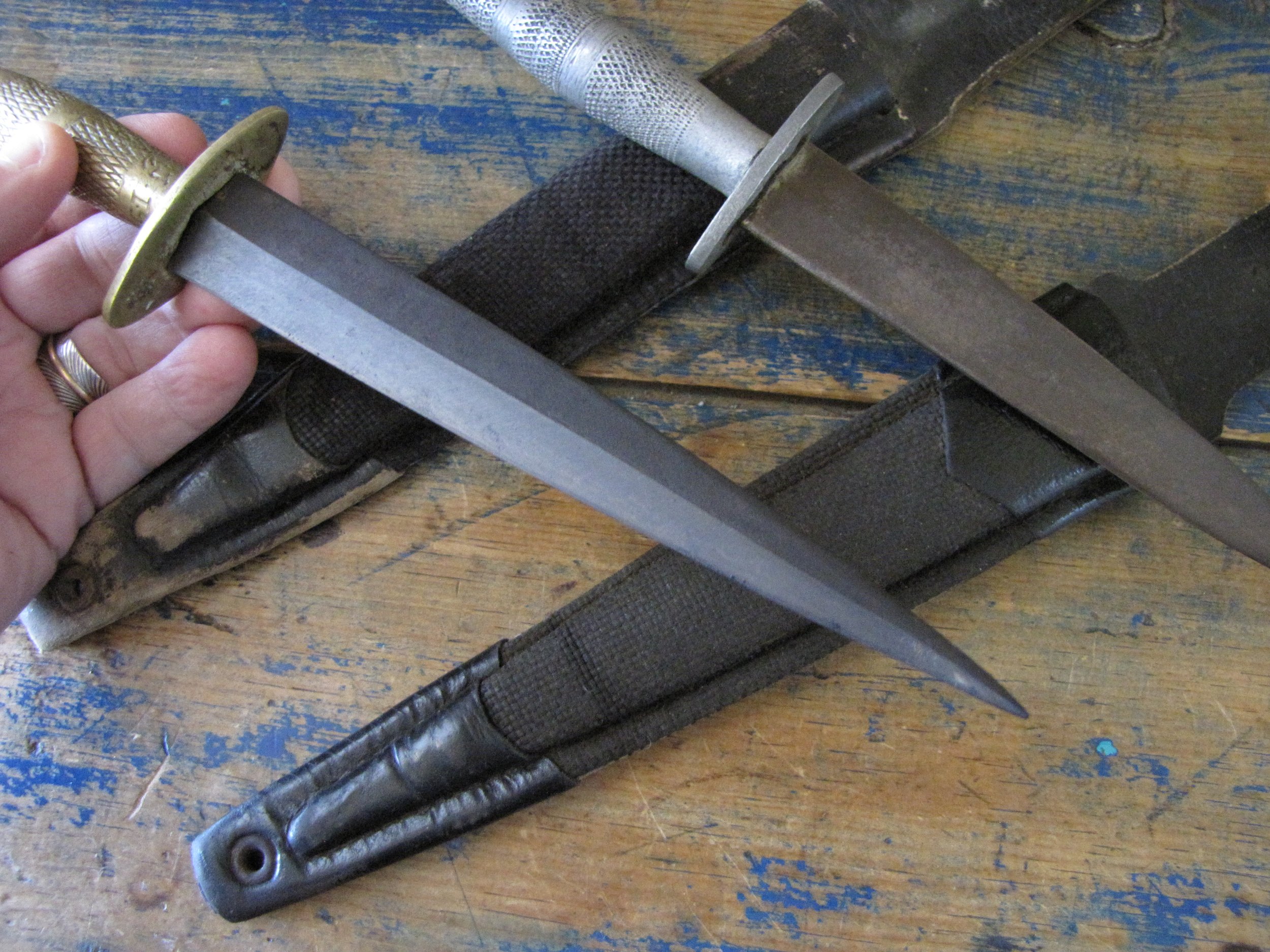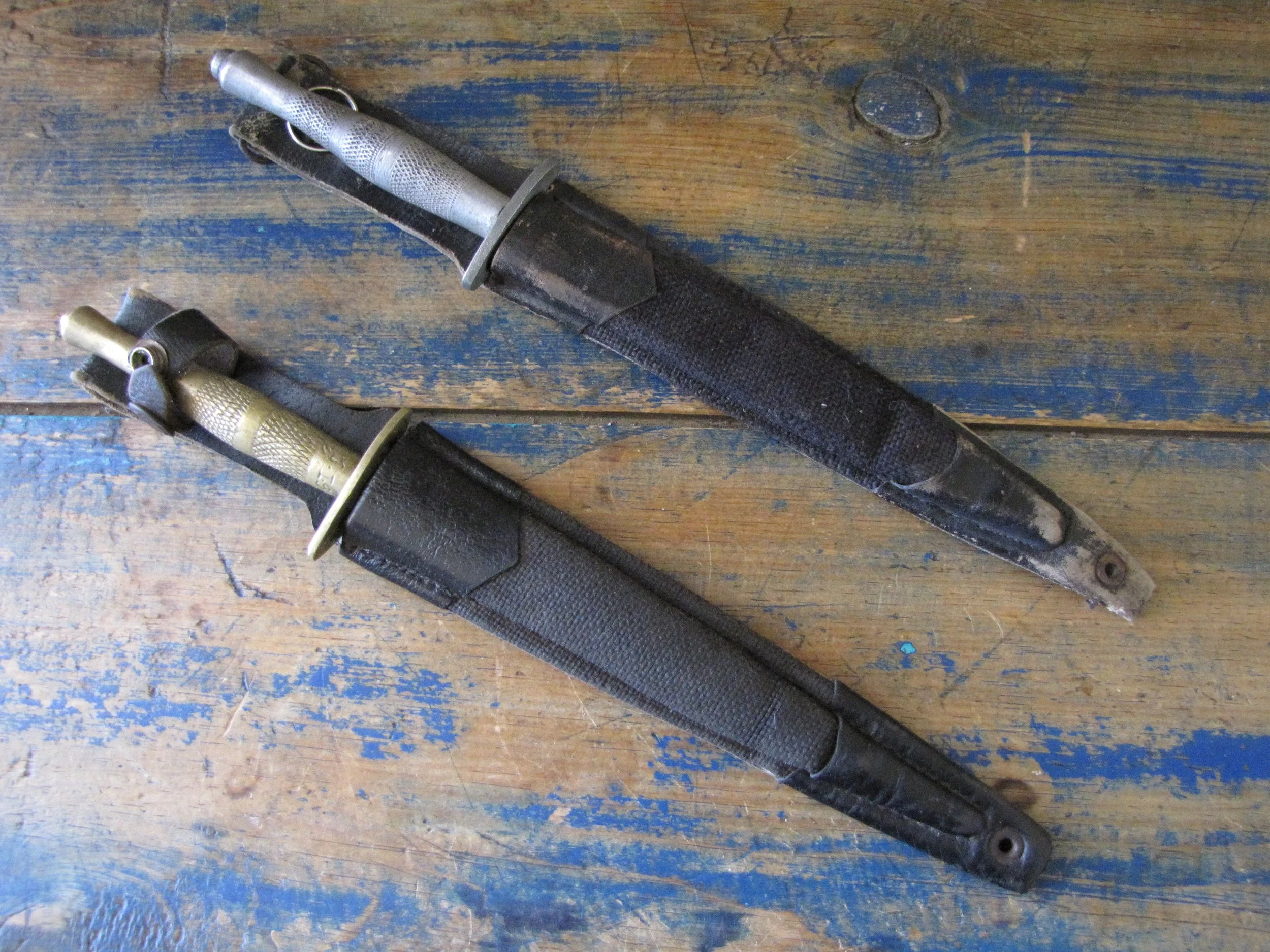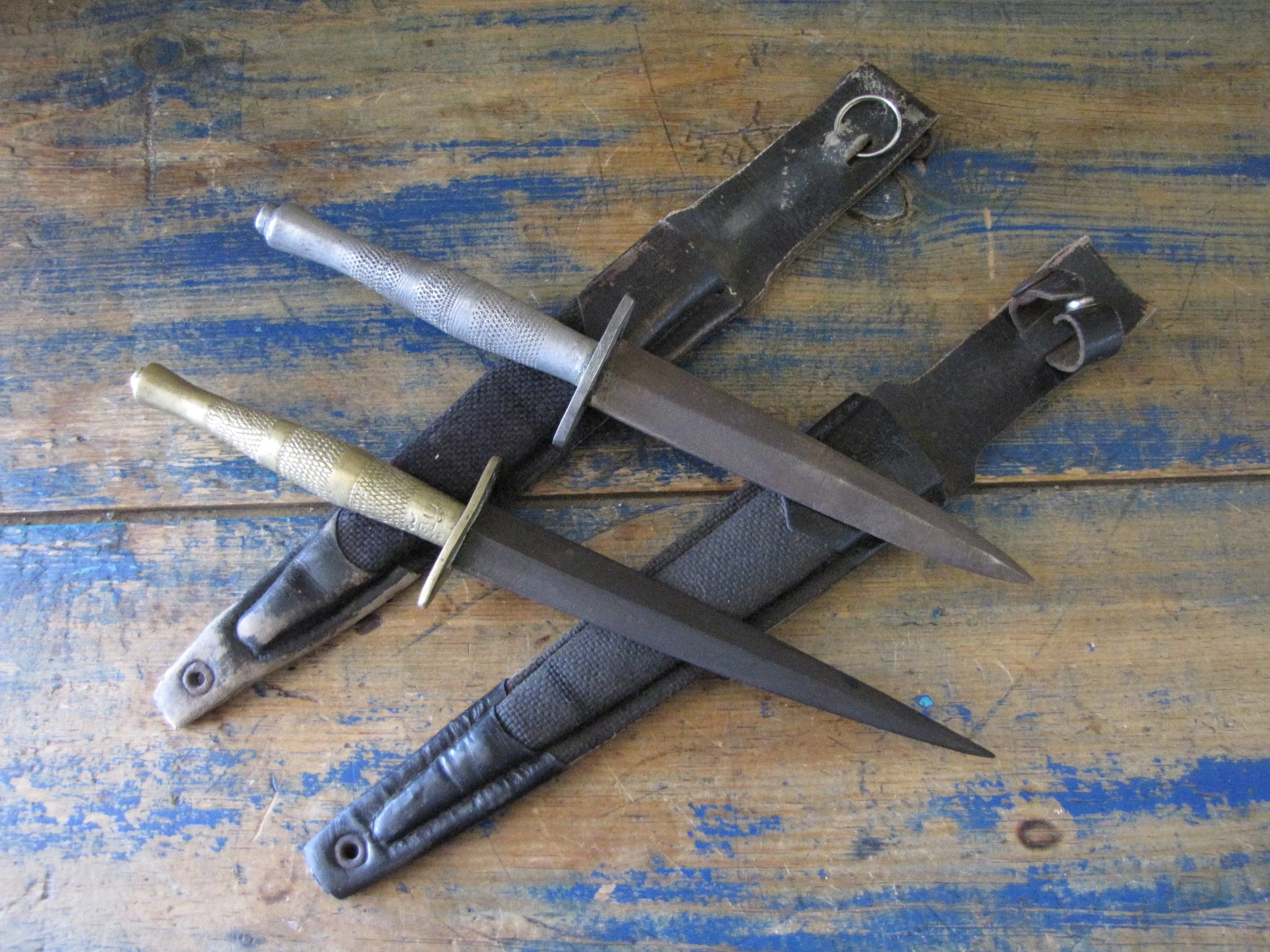 Sold as a pair, two Indonesian F-S knives. Purportedly issued/used by the Indonesian Special Forces KOPASSUS (1952 onwards) they come in a variety of different versions and are usually quite low quality construction. Nevertheless, they represent an interesting and unusual variation of the F-S. Complete with their correct sheaths. One having a brass grip, the other alloy.