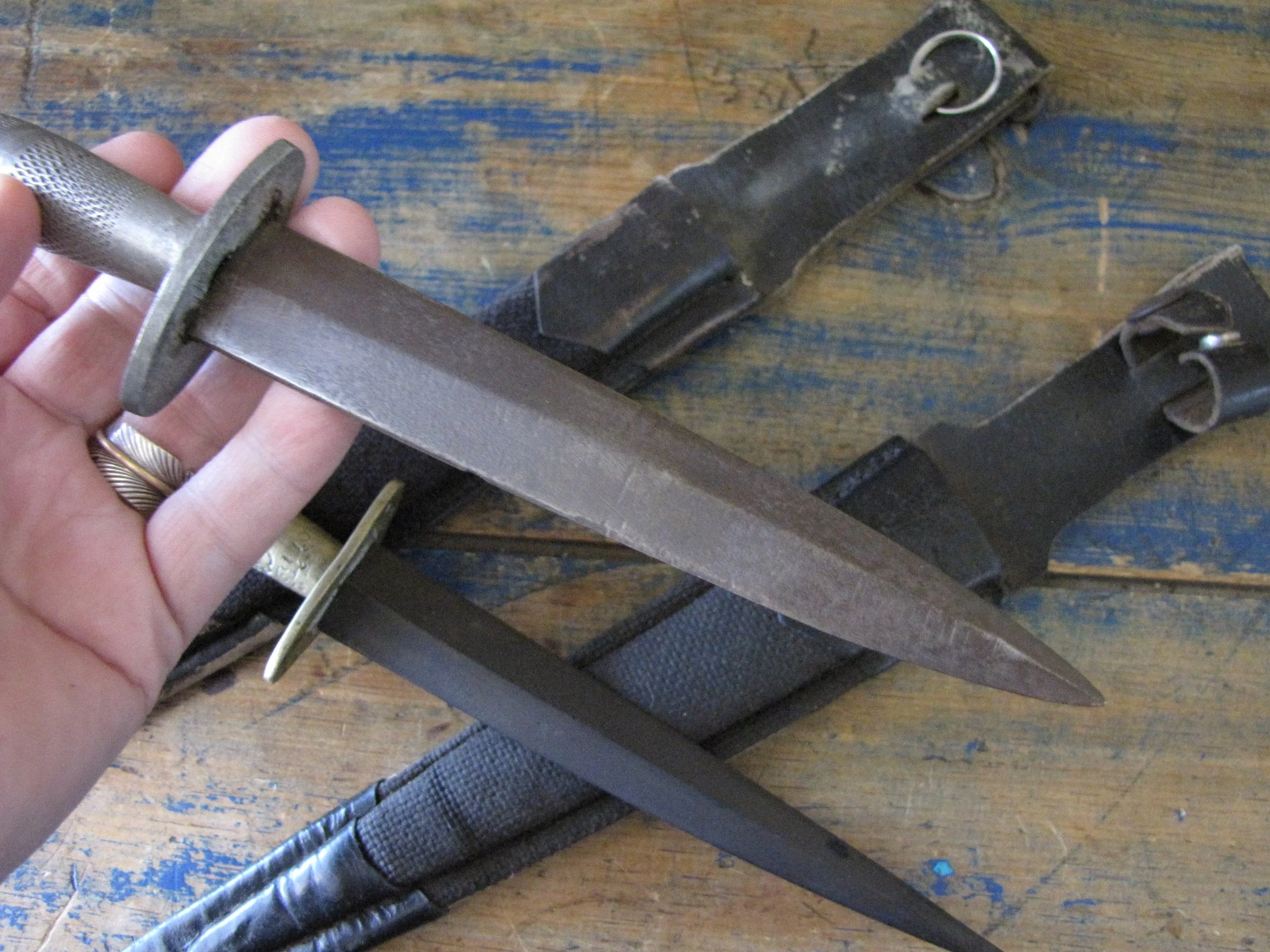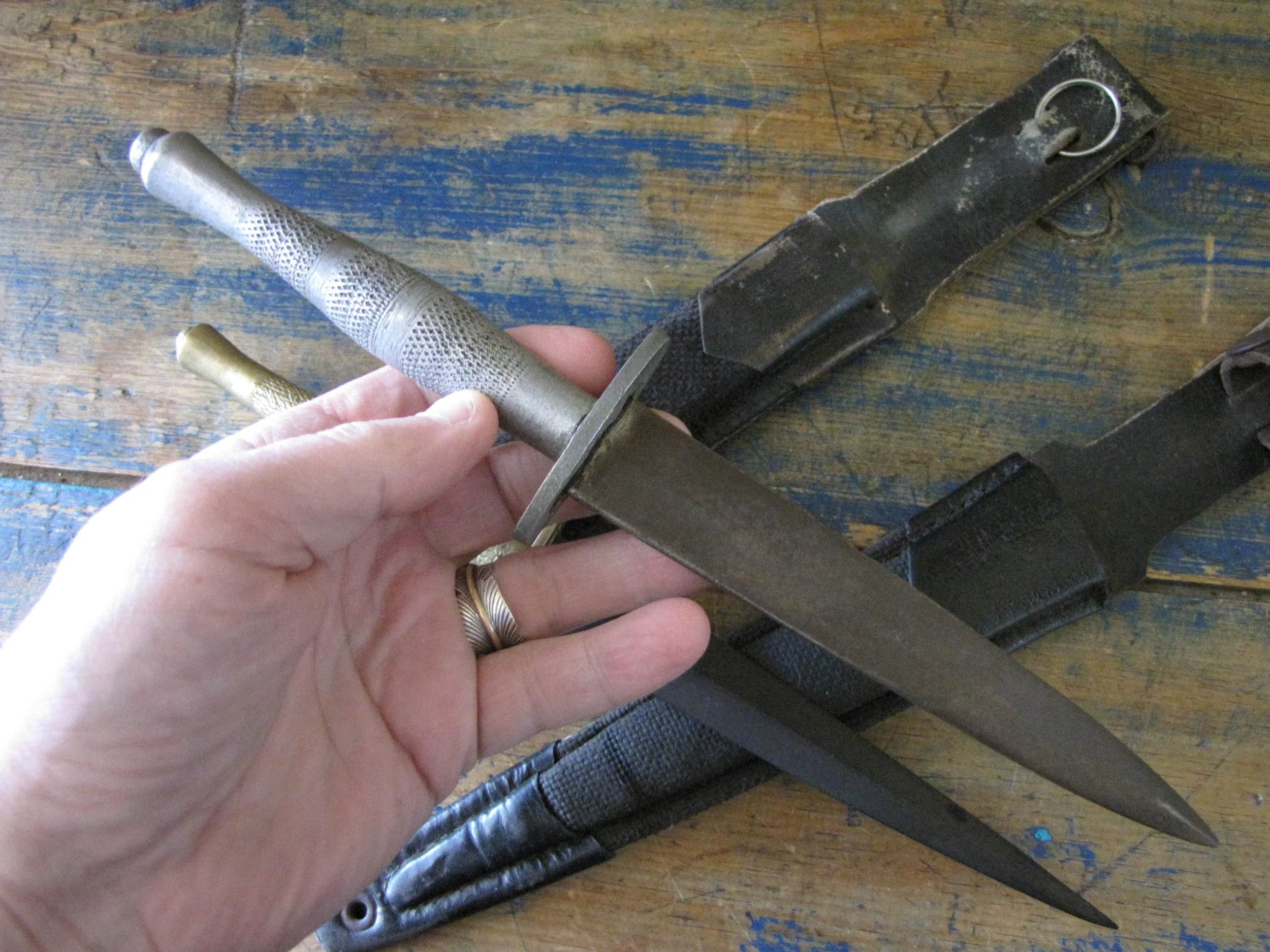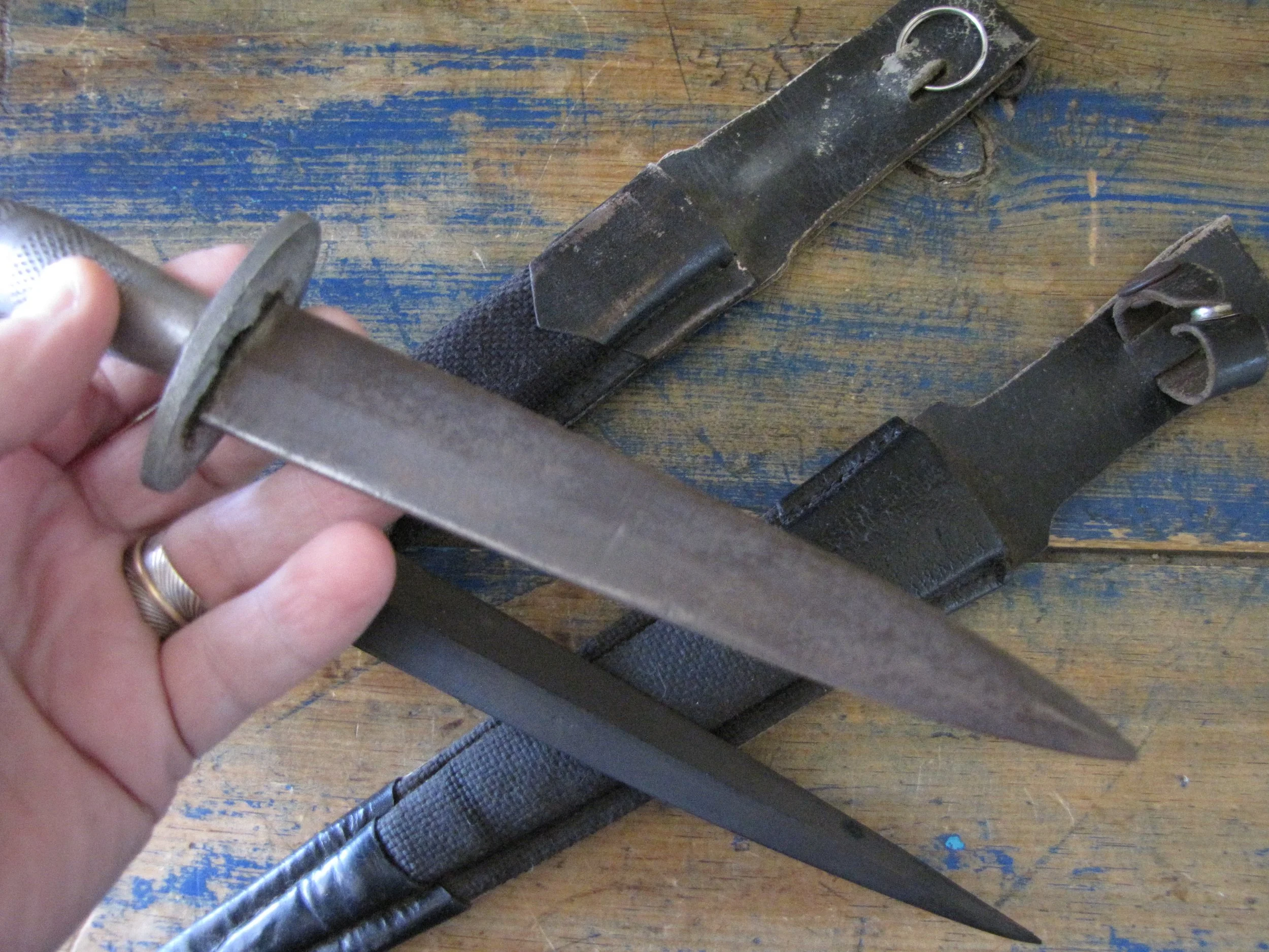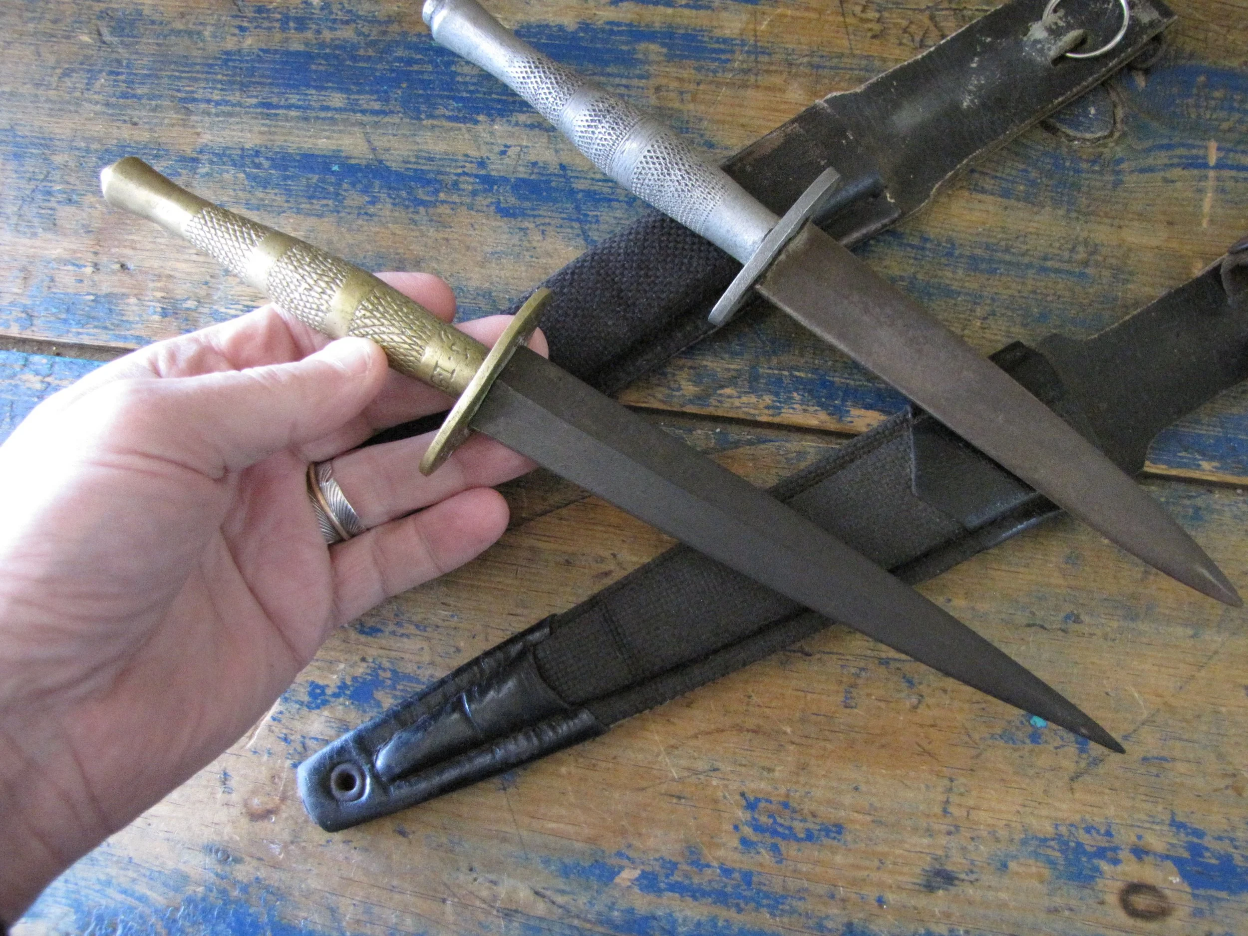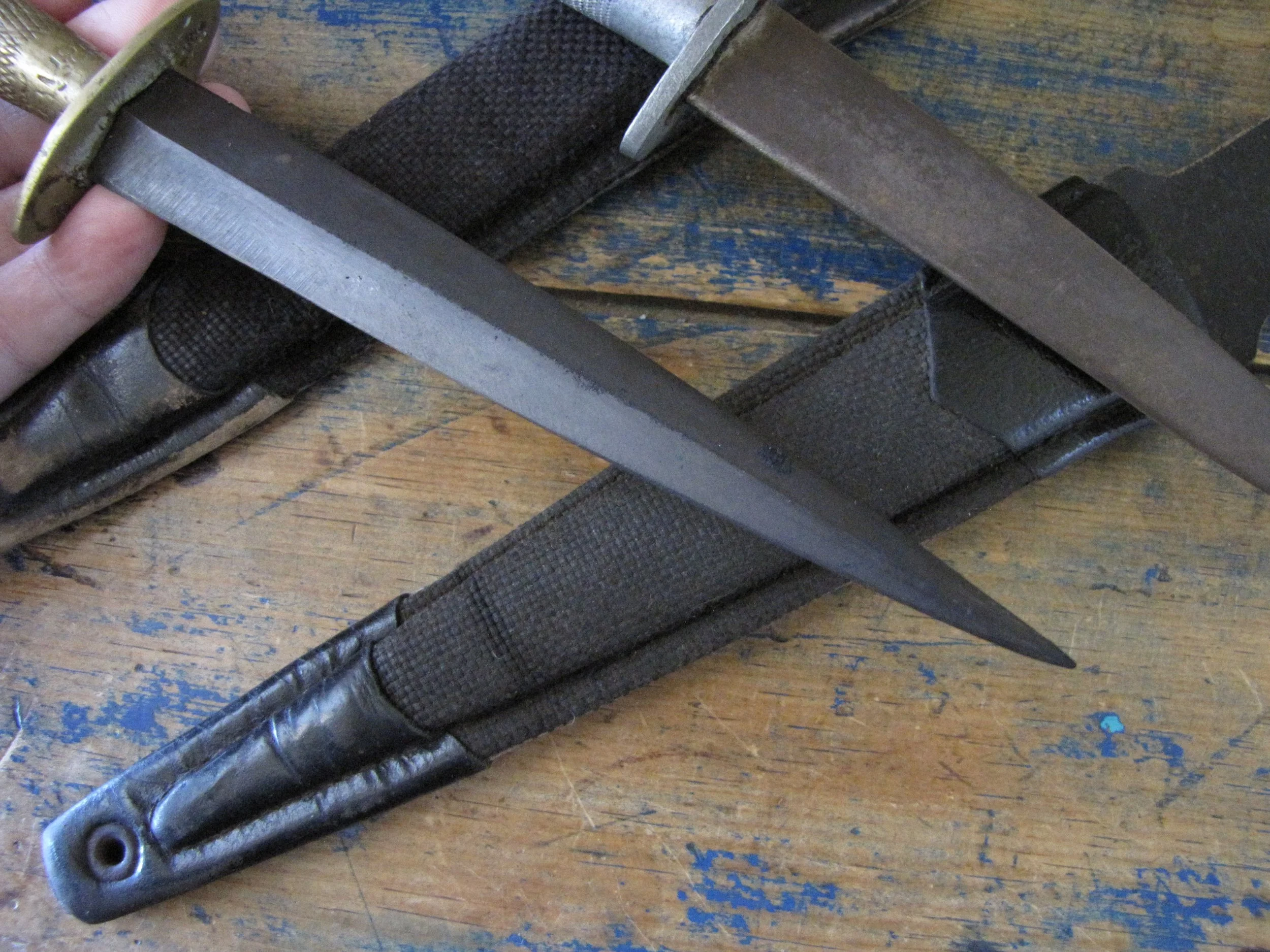 Sold as a pair, two Indonesian F-S knives. Purportedly issued/used by the Indonesian Special Forces KOPASSUS (1952 onwards) they come in a variety of different versions and are usually quite low quality construction. Nevertheless, they represent an interesting and unusual variation of the F-S. Complete with their correct sheaths. One having a brass grip, the other alloy.