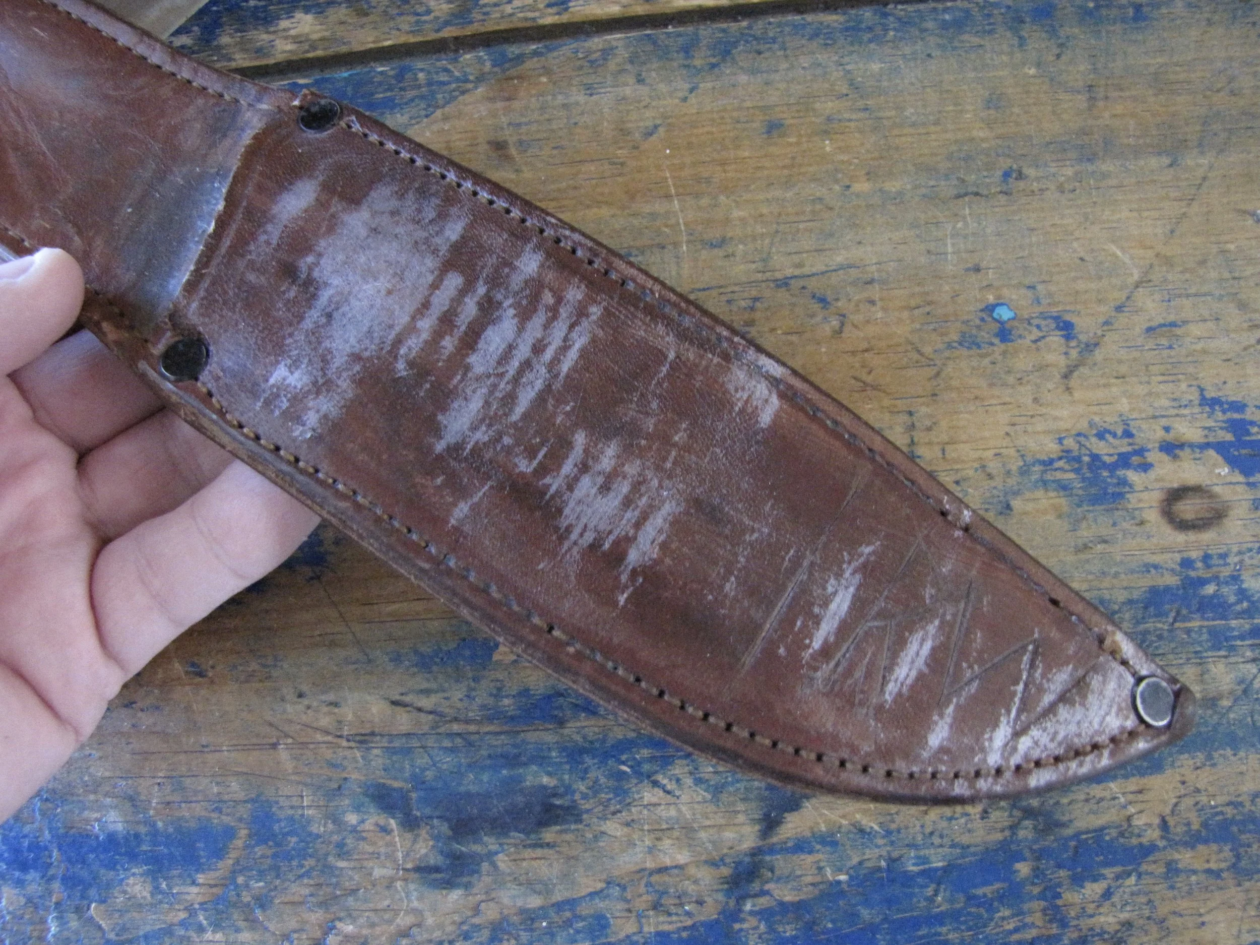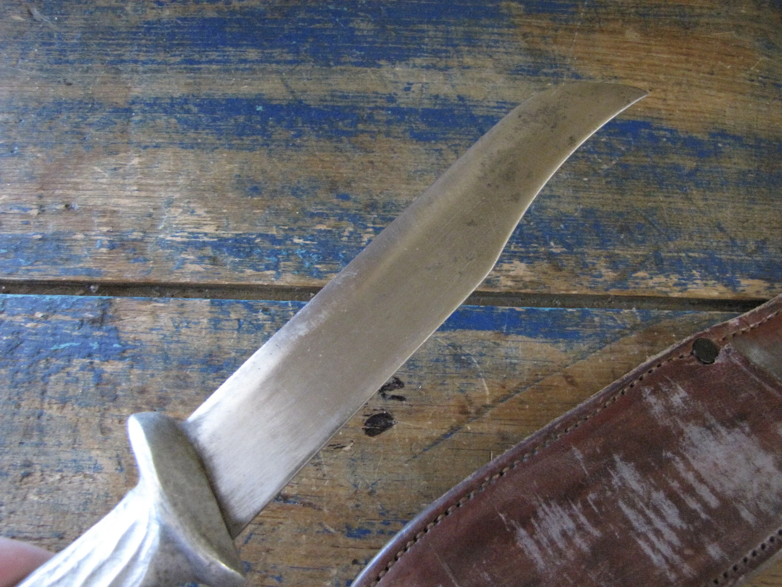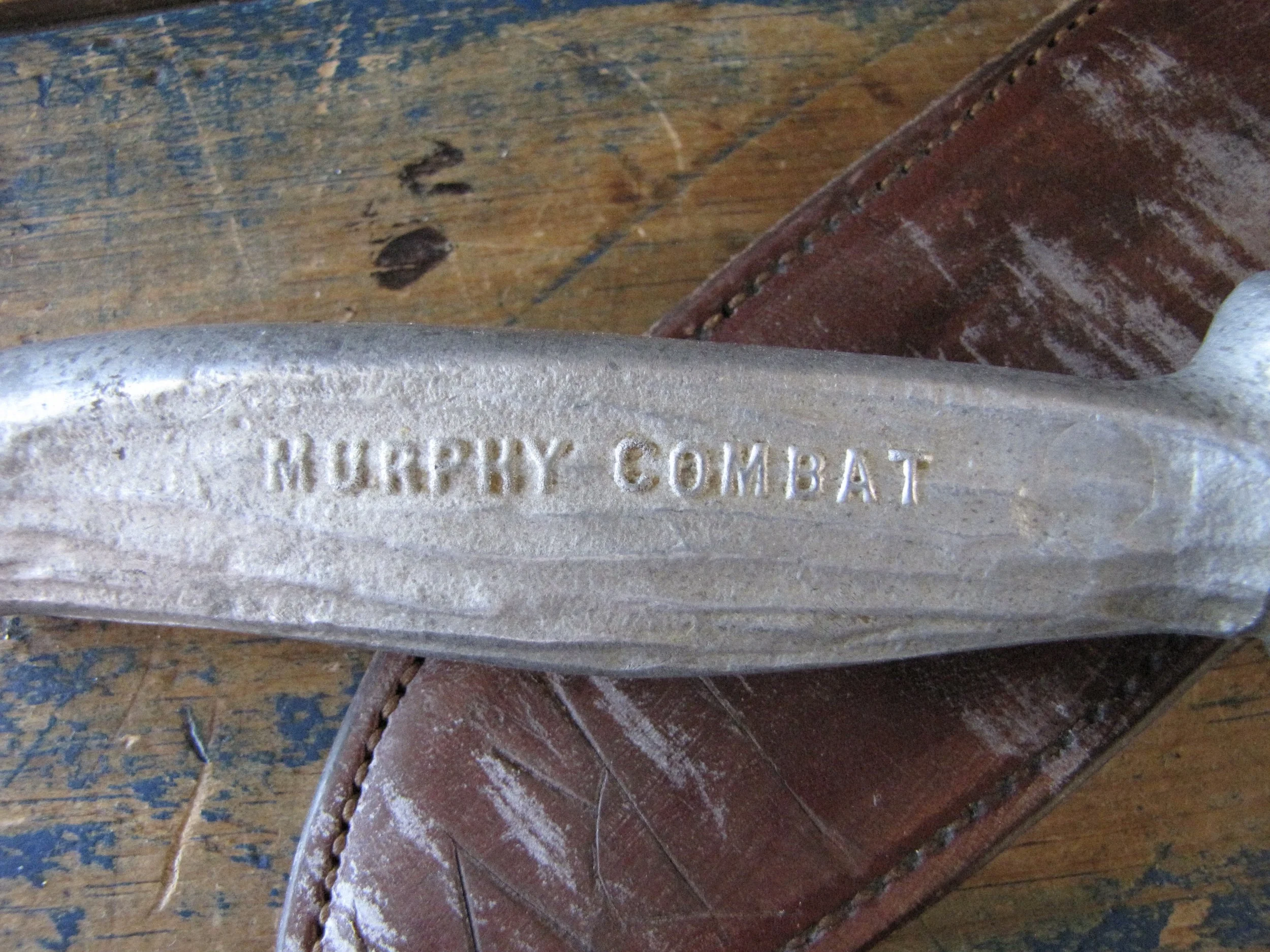 A really clean example of the hard to find WWII Murphy Combat Knife complete complete with its original and correct leather sheath. Overall length is 11 1/2” with a 6” blade. Sold cast hilt marked “MURHY COMBAT” on one side and “U.S.A.” on the other. Some signs of light use and sharpening but remaining in really lovely condition. The original sheath has an intact snap-fastener and is i great condition, with what looks like the original owners initials scratched into the front. A very nice example of a rarely seen knife.