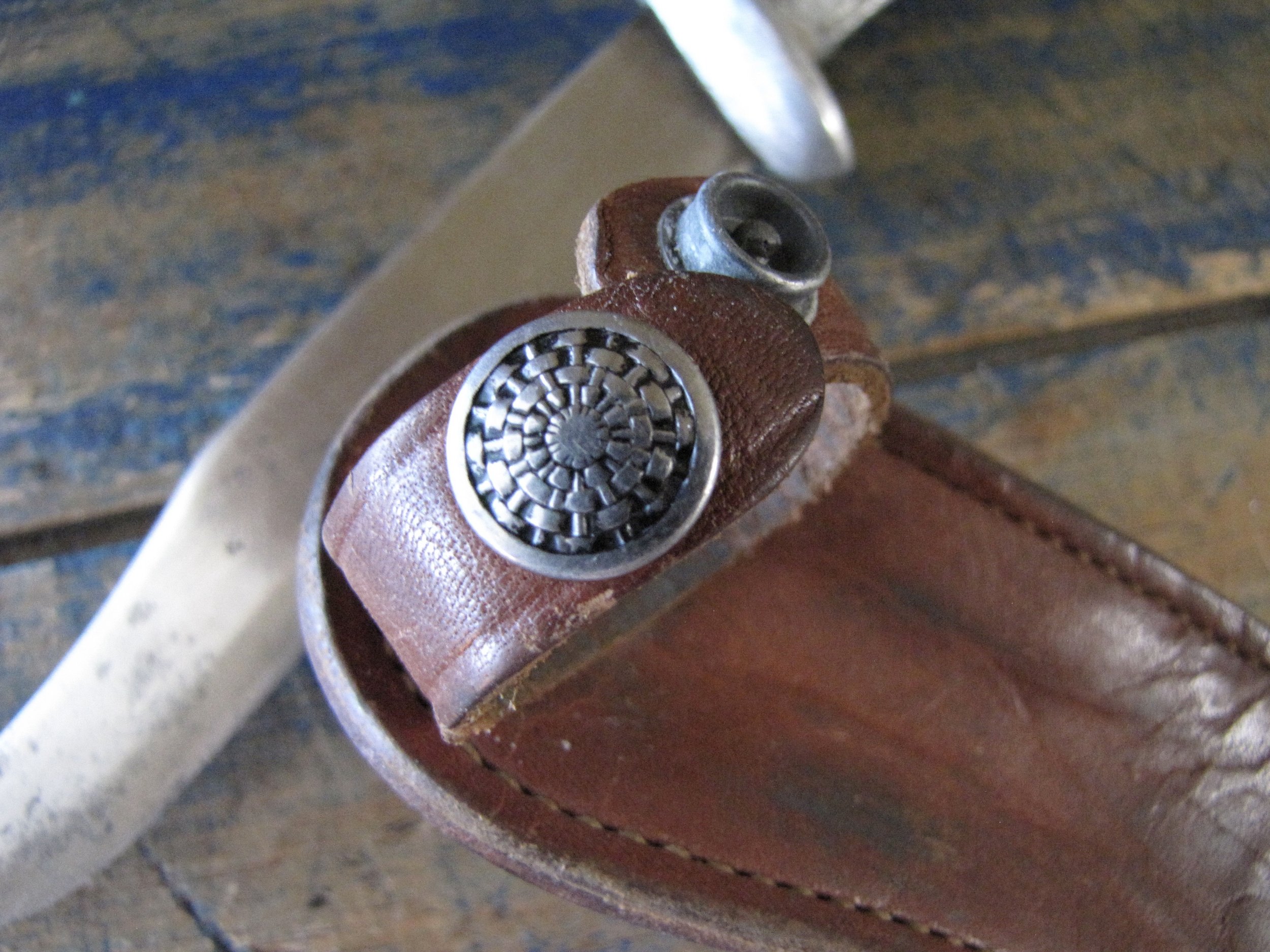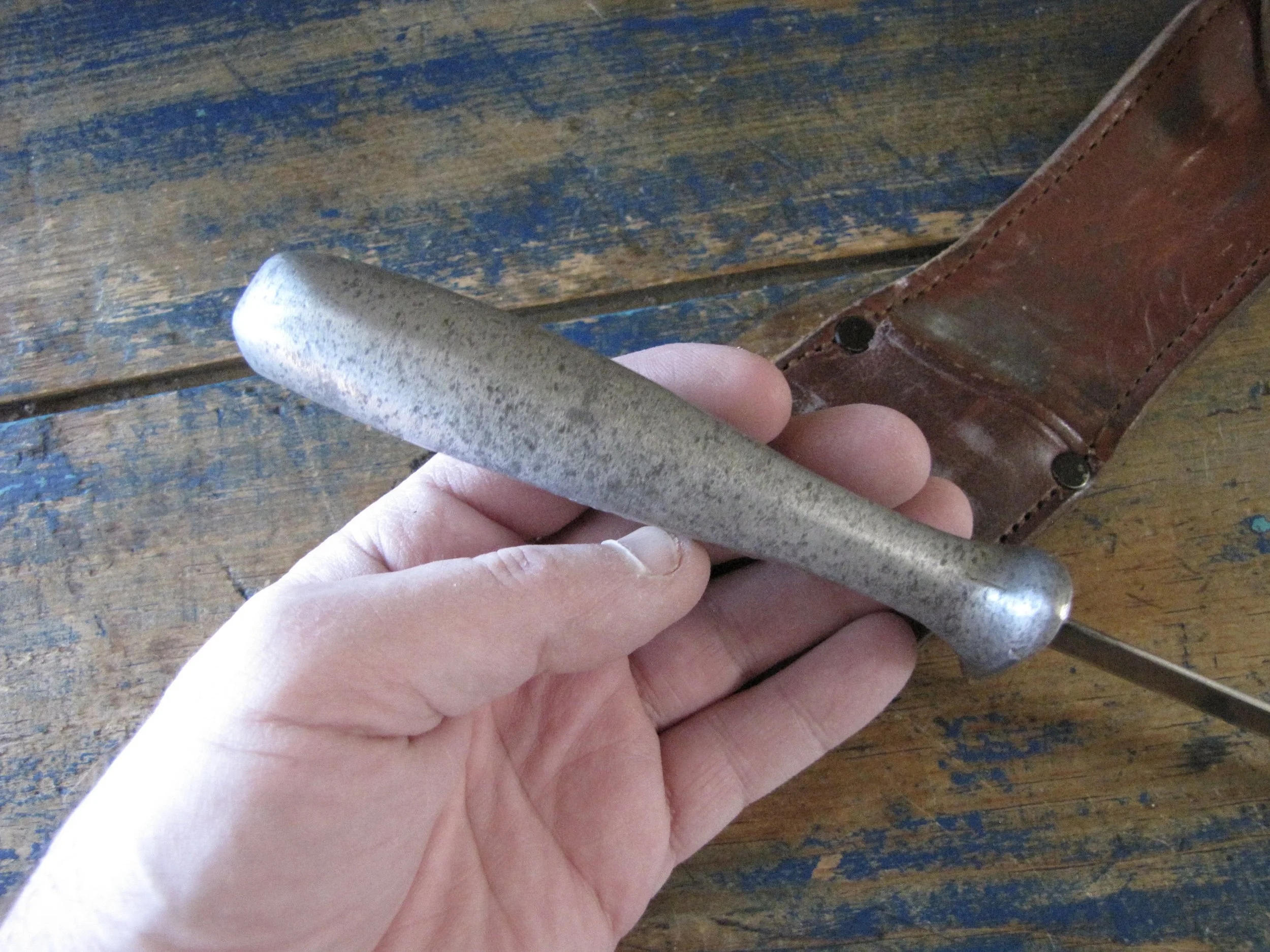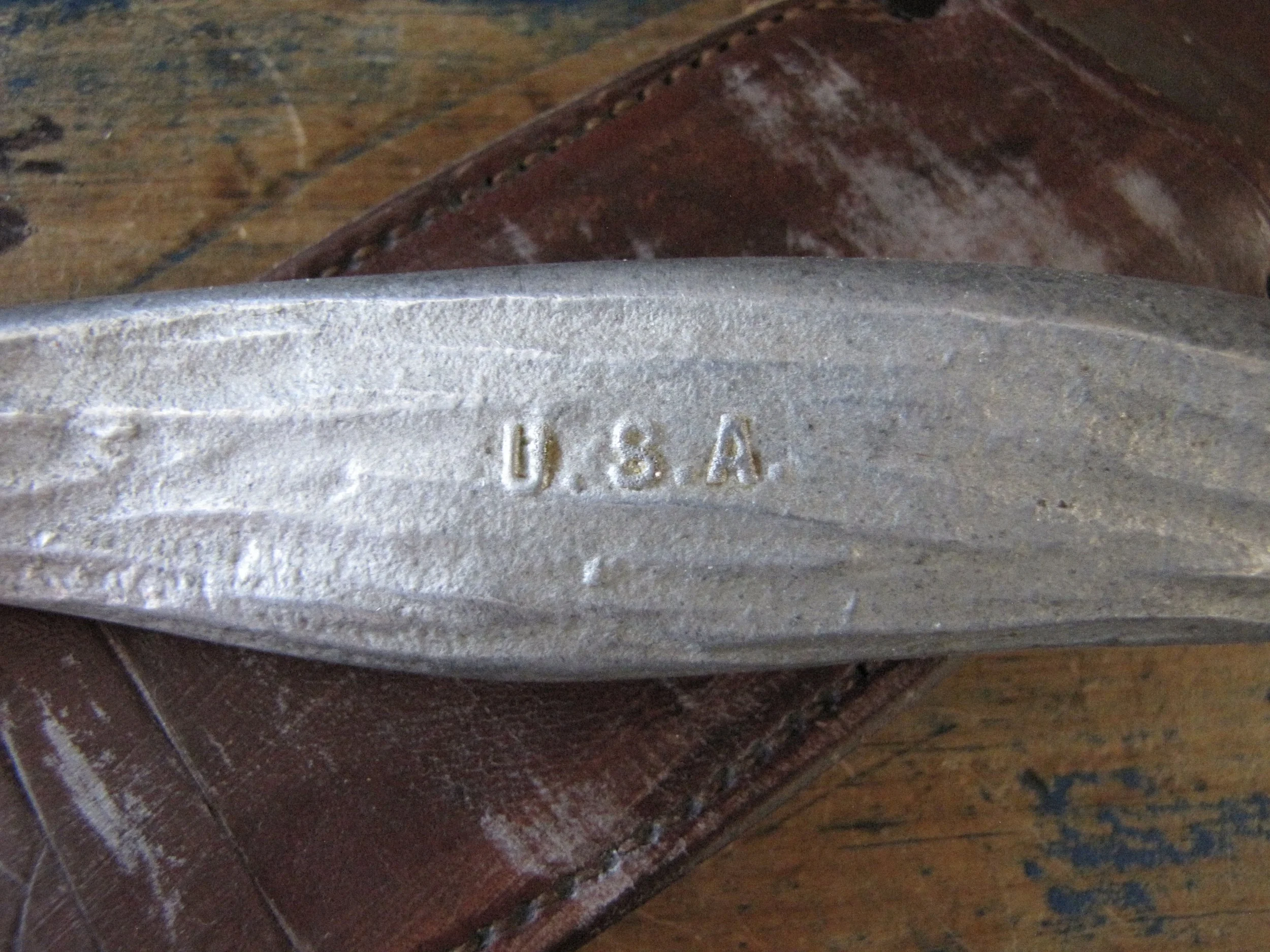 A really clean example of the hard to find WWII Murphy Combat Knife complete complete with its original and correct leather sheath. Overall length is 11 1/2” with a 6” blade. Sold cast hilt marked “MURHY COMBAT” on one side and “U.S.A.” on the other. Some signs of light use and sharpening but remaining in really lovely condition. The original sheath has an intact snap-fastener and is i great condition, with what looks like the original owners initials scratched into the front. A very nice example of a rarely seen knife.