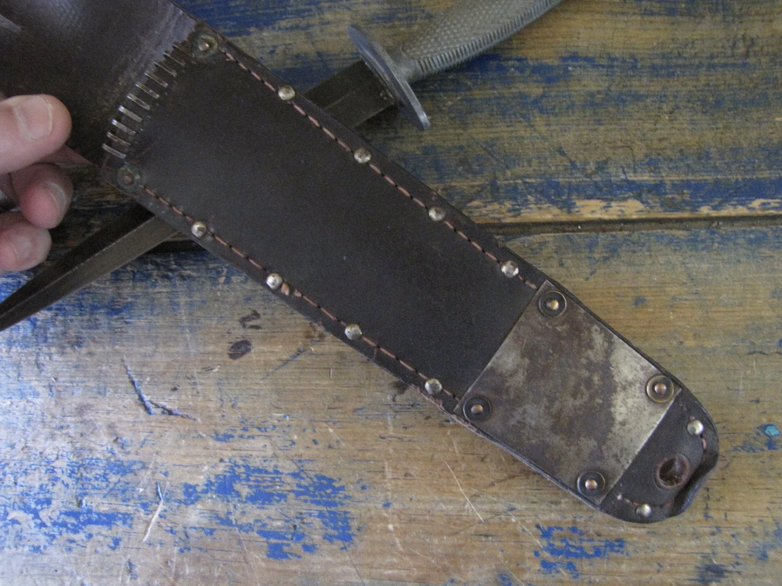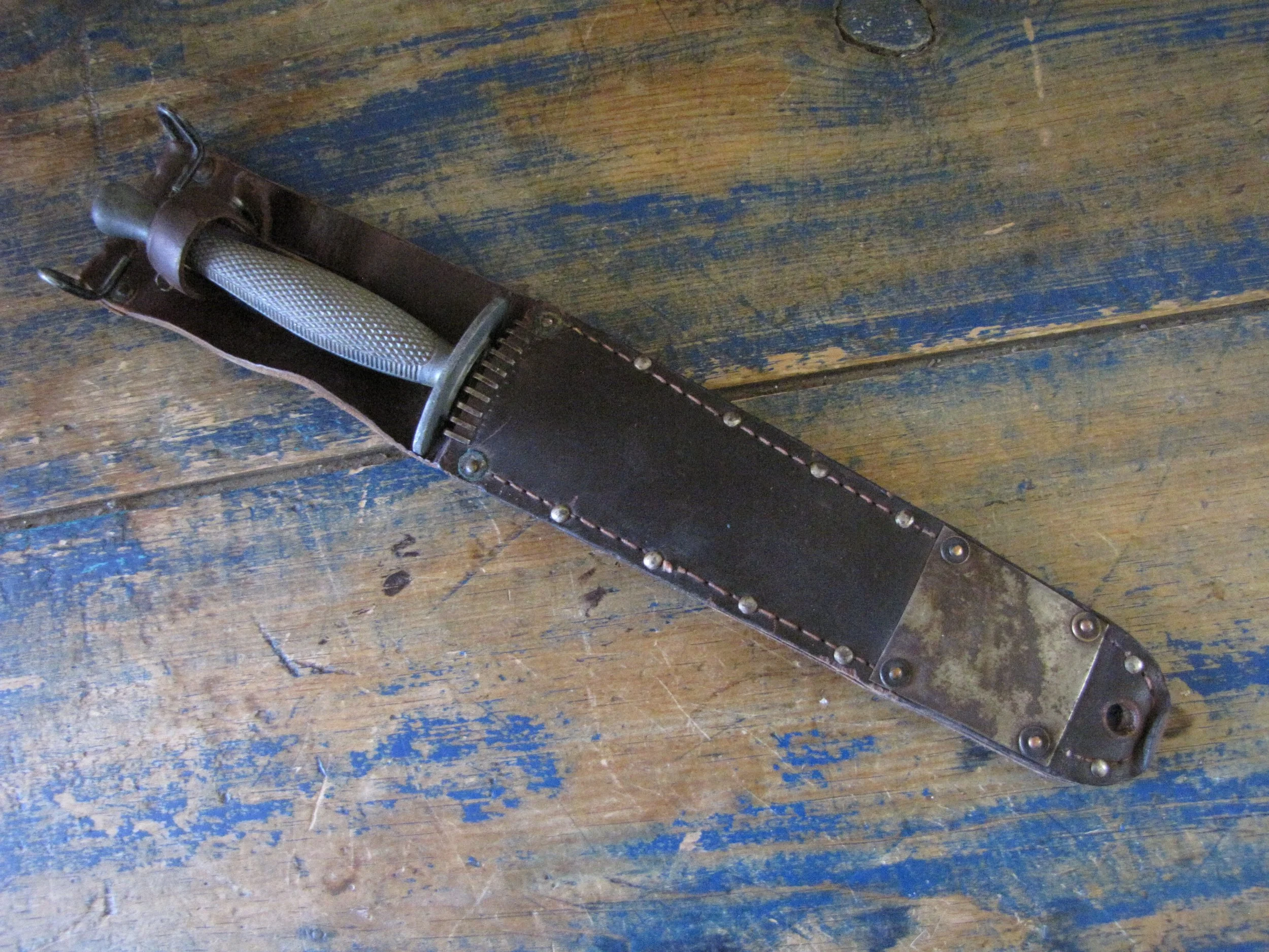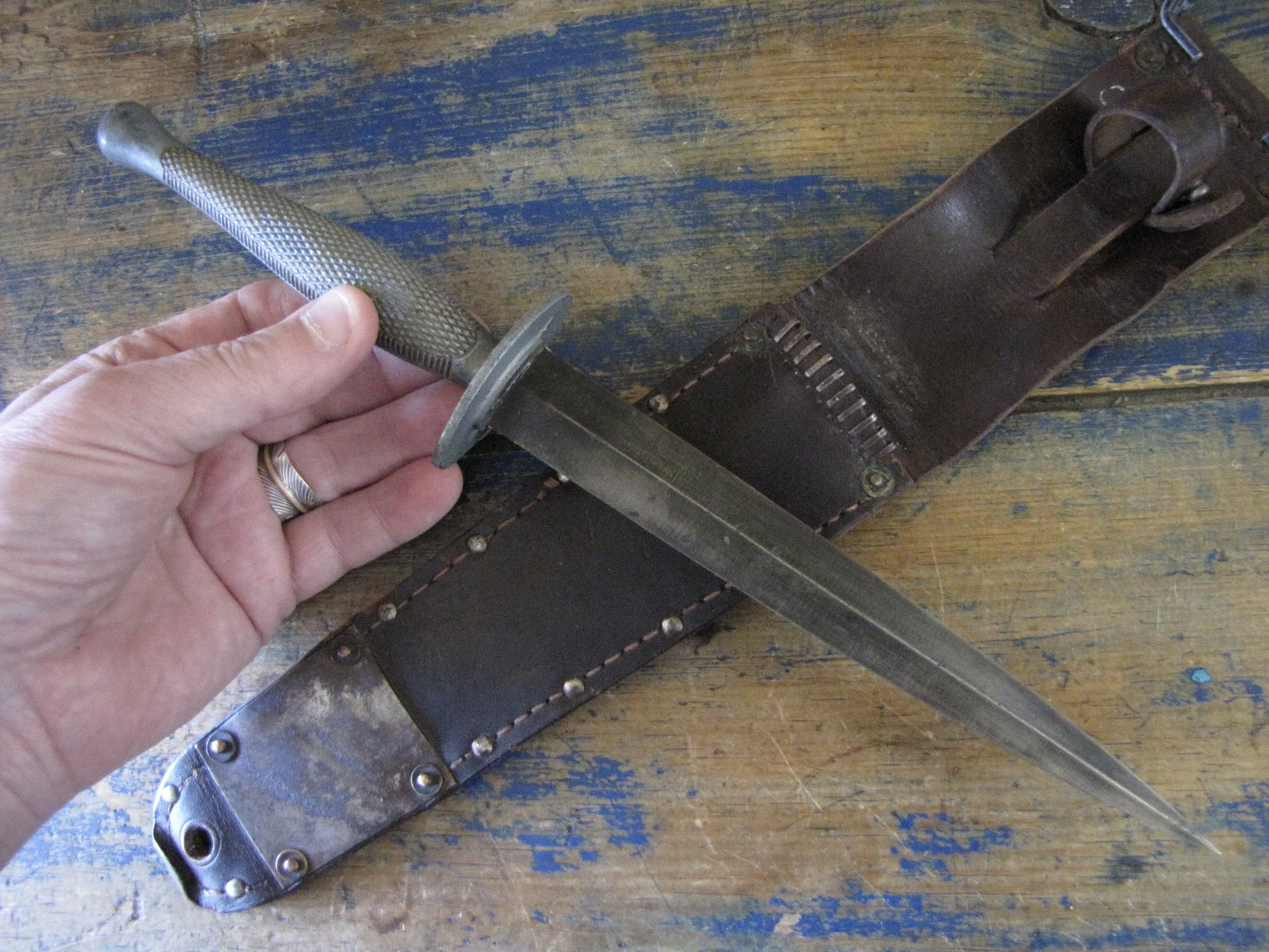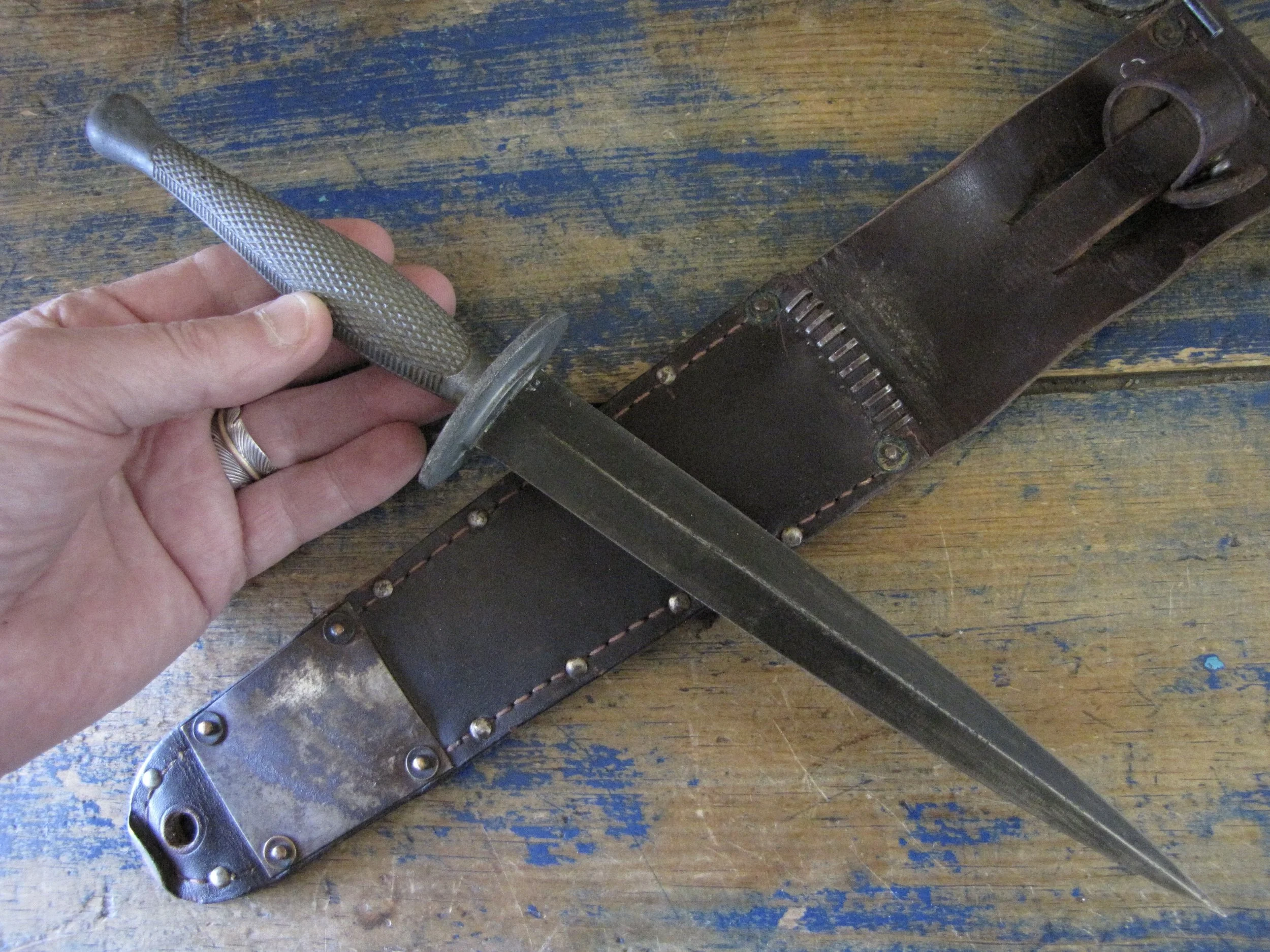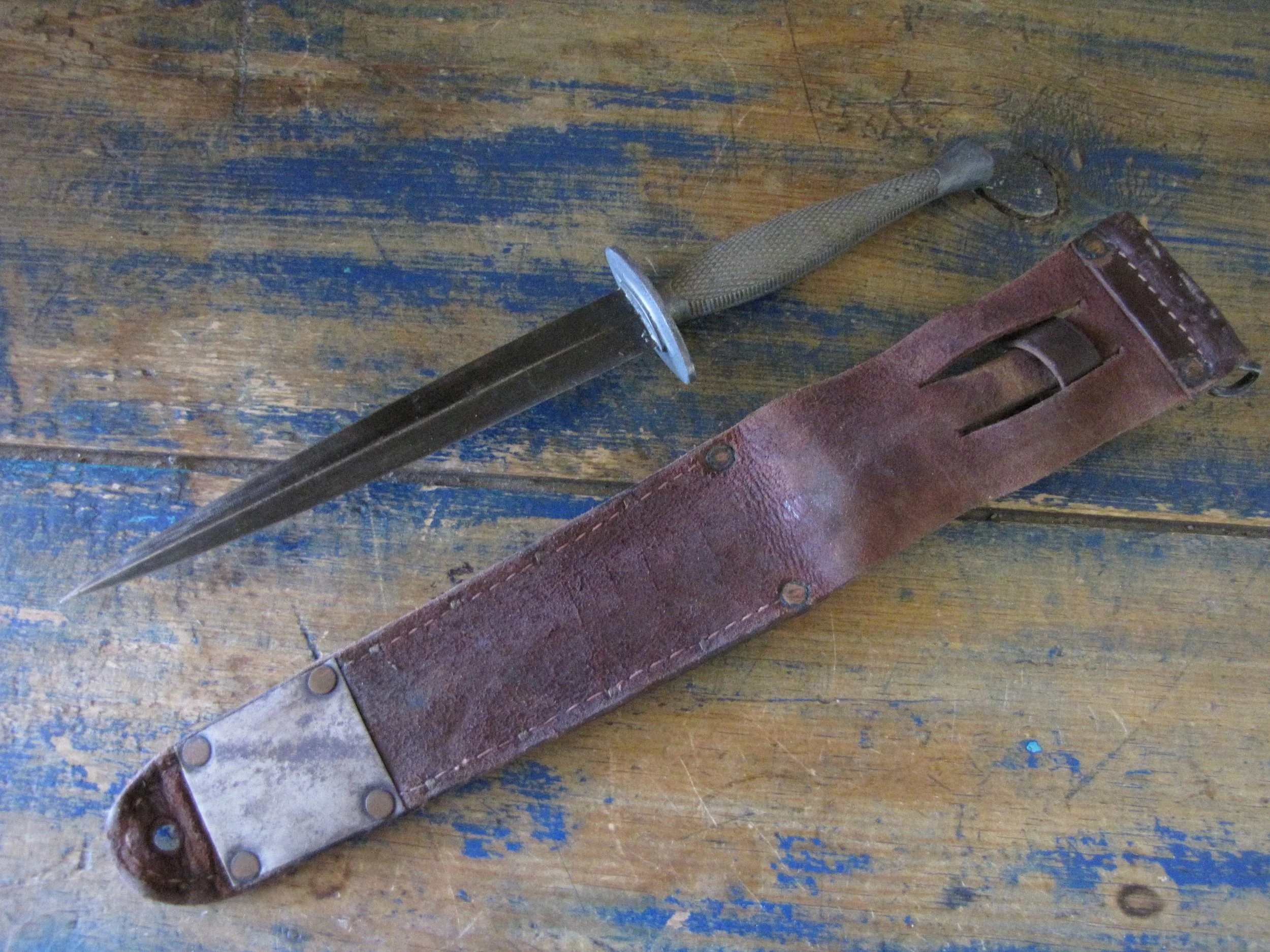 Without doubt one of true rarities within F-S variant collecting specifically and WWII fighting knife collecting in general. Made by the US company Camillus and to the same design as the famed U.S. Marine Raider Stiletto, a small batch was supplied to he Canadian 1st Parachute Battalion, the design differed slightly, in that there were no etchings applied to the blade and an overall black finish was applied. This wonderful example, has clearly seen use but remains in fabulous condition. The blade appears full length at 7 1/8”, showing some small areas of old corrosion but retaining much of the blades dark finish. The hilt has little to no original dark finish remaining but importantly has no noticeable cracks or issues that so often plague these case grips, so solid and strong. Complete with its original and correct sheath. For the US military knife collector as well as the F-S collector, it’s hard to think of many examples that are this hard to find. Don’t miss out on addition this beauty to your collection, who knows when you will see another example.