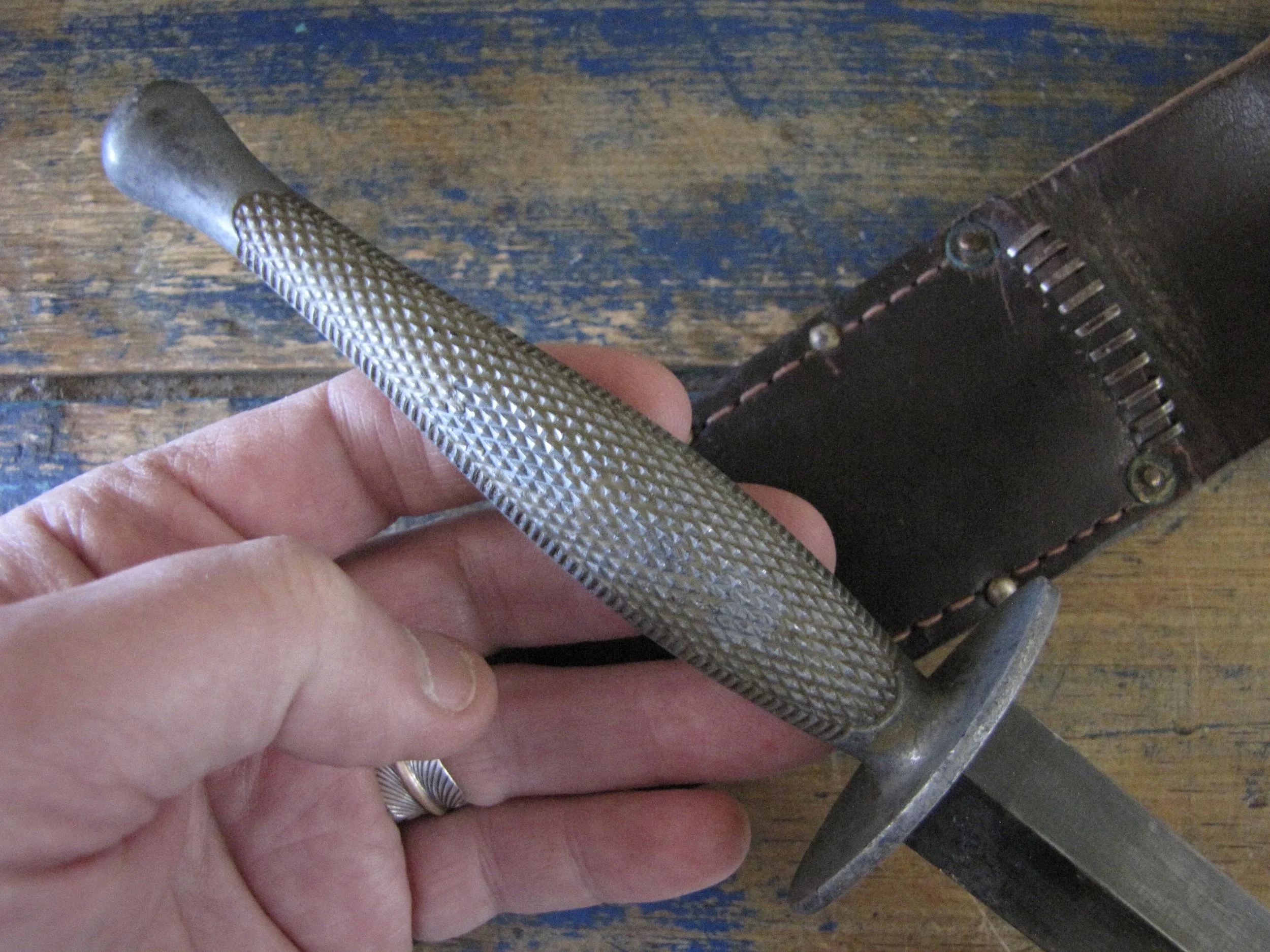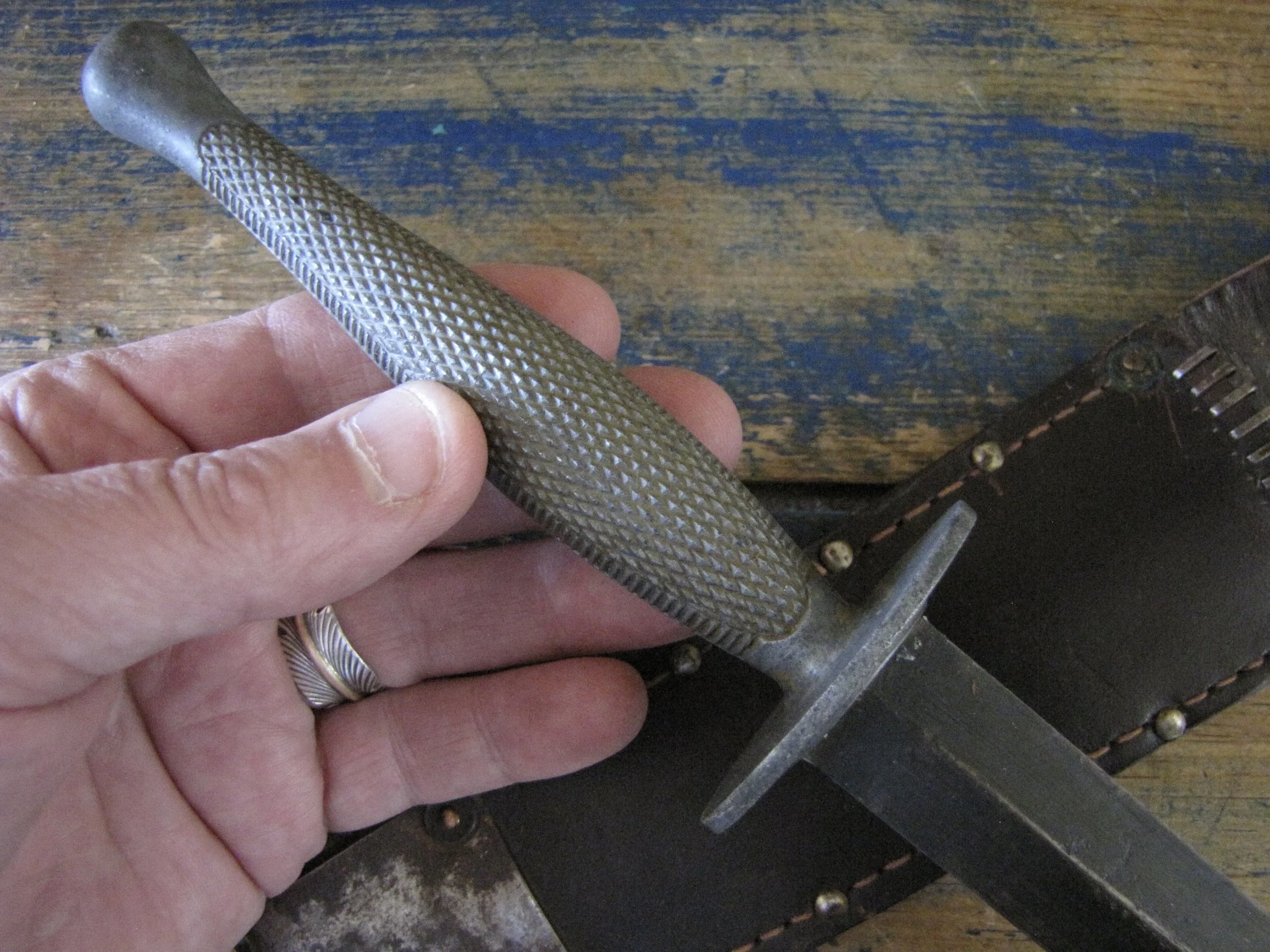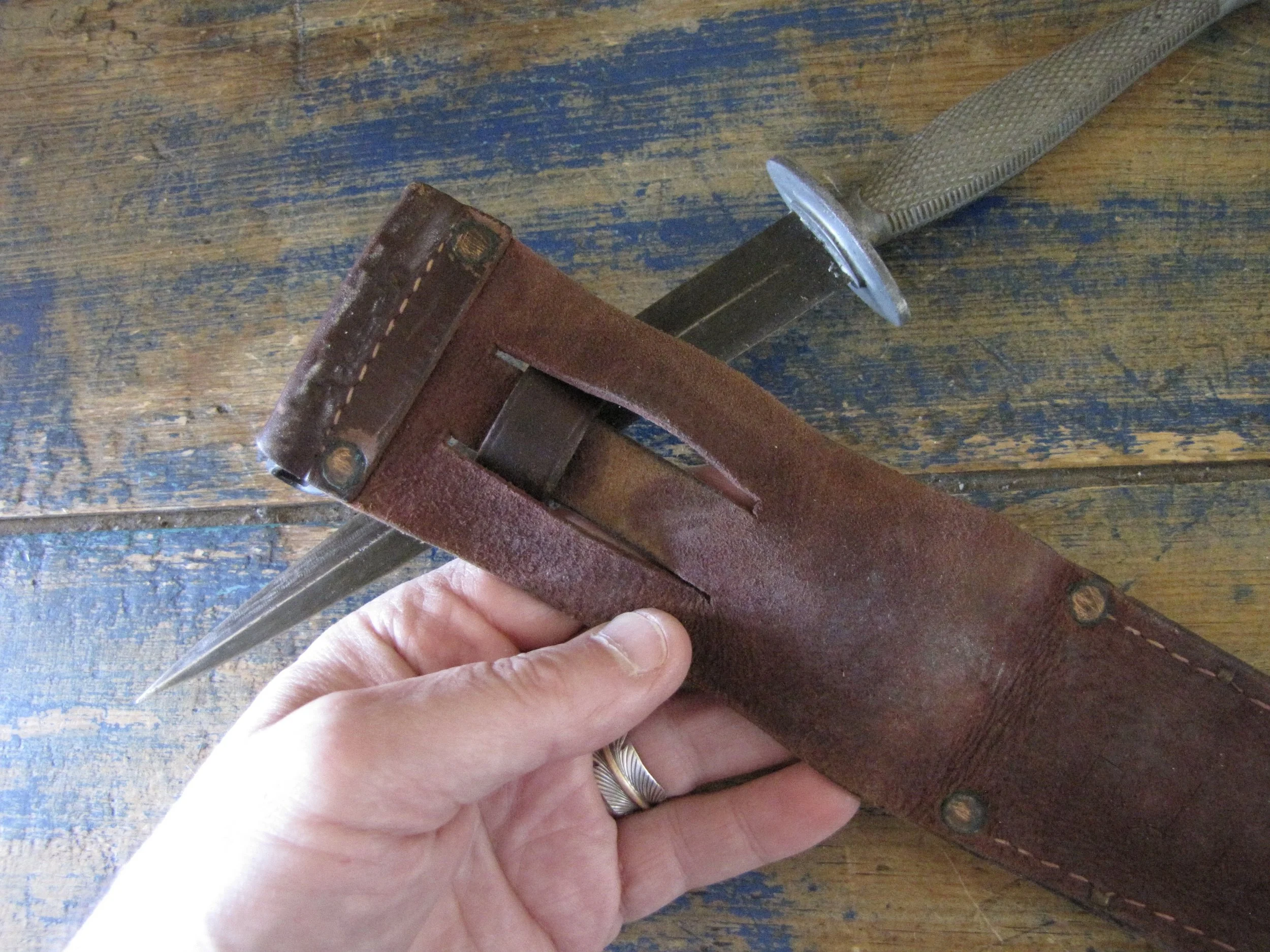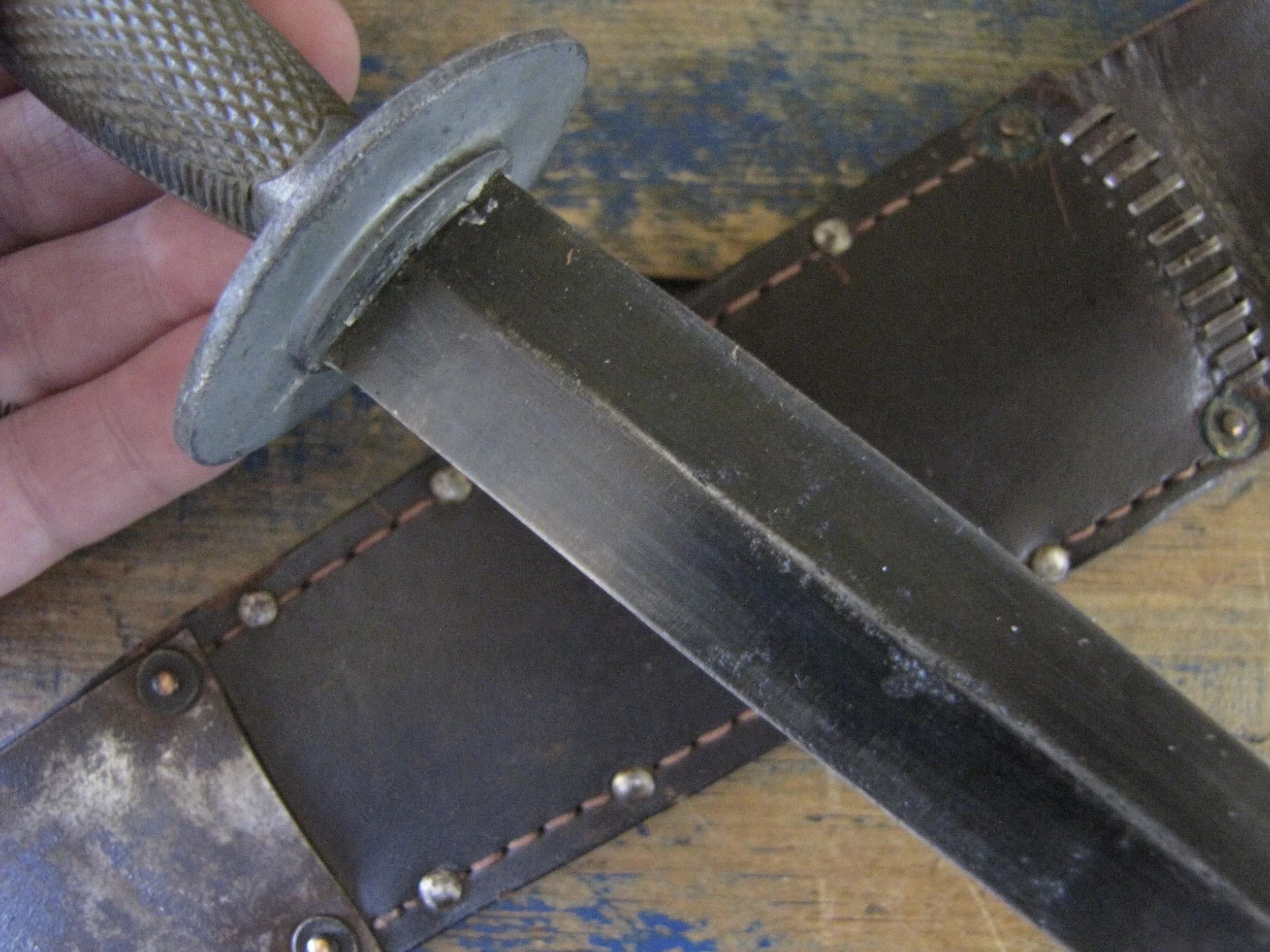 Without doubt one of true rarities within F-S variant collecting specifically and WWII fighting knife collecting in general. Made by the US company Camillus and to the same design as the famed U.S. Marine Raider Stiletto, a small batch was supplied to he Canadian 1st Parachute Battalion, the design differed slightly, in that there were no etchings applied to the blade and an overall black finish was applied. This wonderful example, has clearly seen use but remains in fabulous condition. The blade appears full length at 7 1/8”, showing some small areas of old corrosion but retaining much of the blades dark finish. The hilt has little to no original dark finish remaining but importantly has no noticeable cracks or issues that so often plague these case grips, so solid and strong. Complete with its original and correct sheath. For the US military knife collector as well as the F-S collector, it’s hard to think of many examples that are this hard to find. Don’t miss out on addition this beauty to your collection, who knows when you will see another example.
