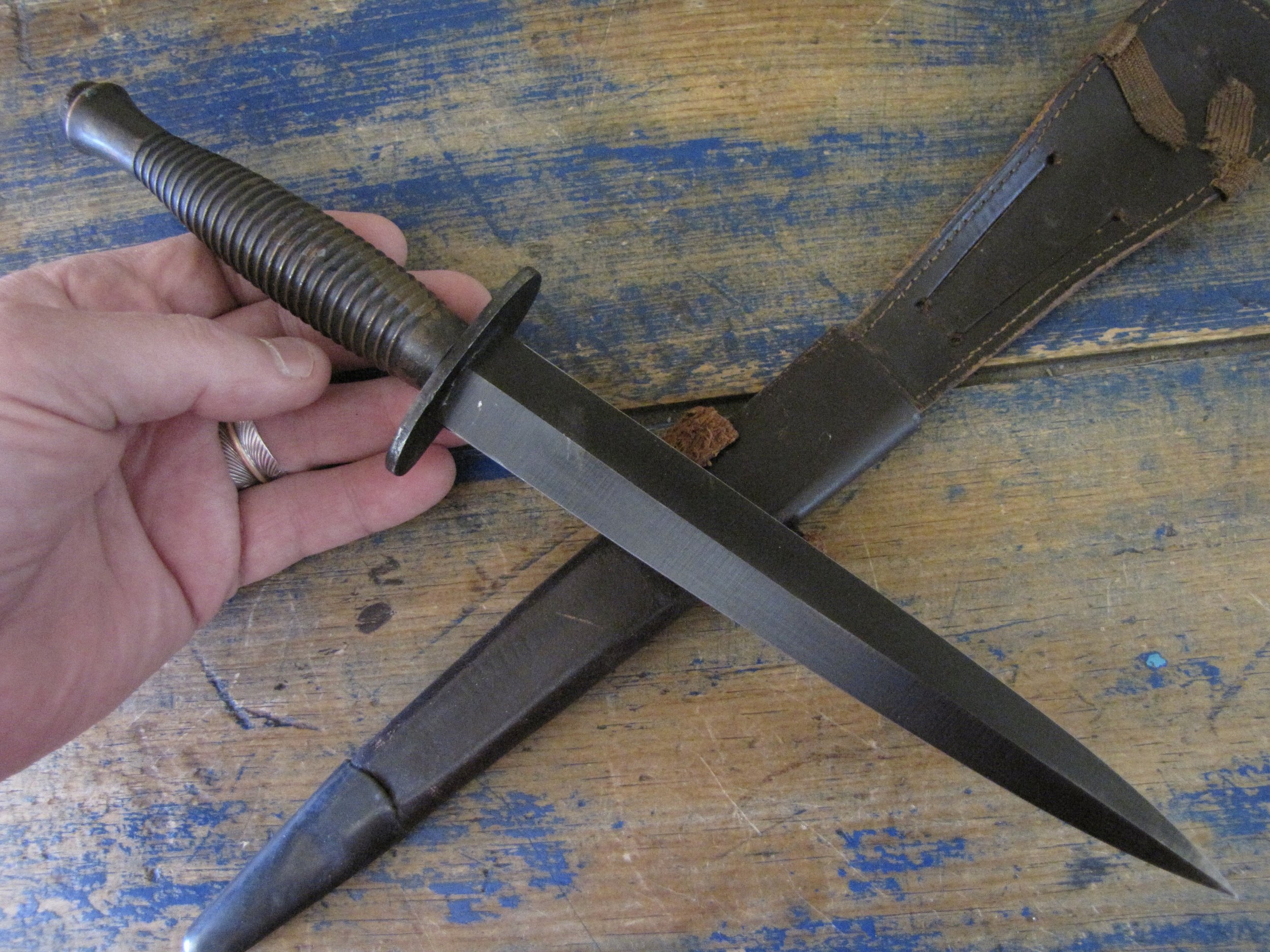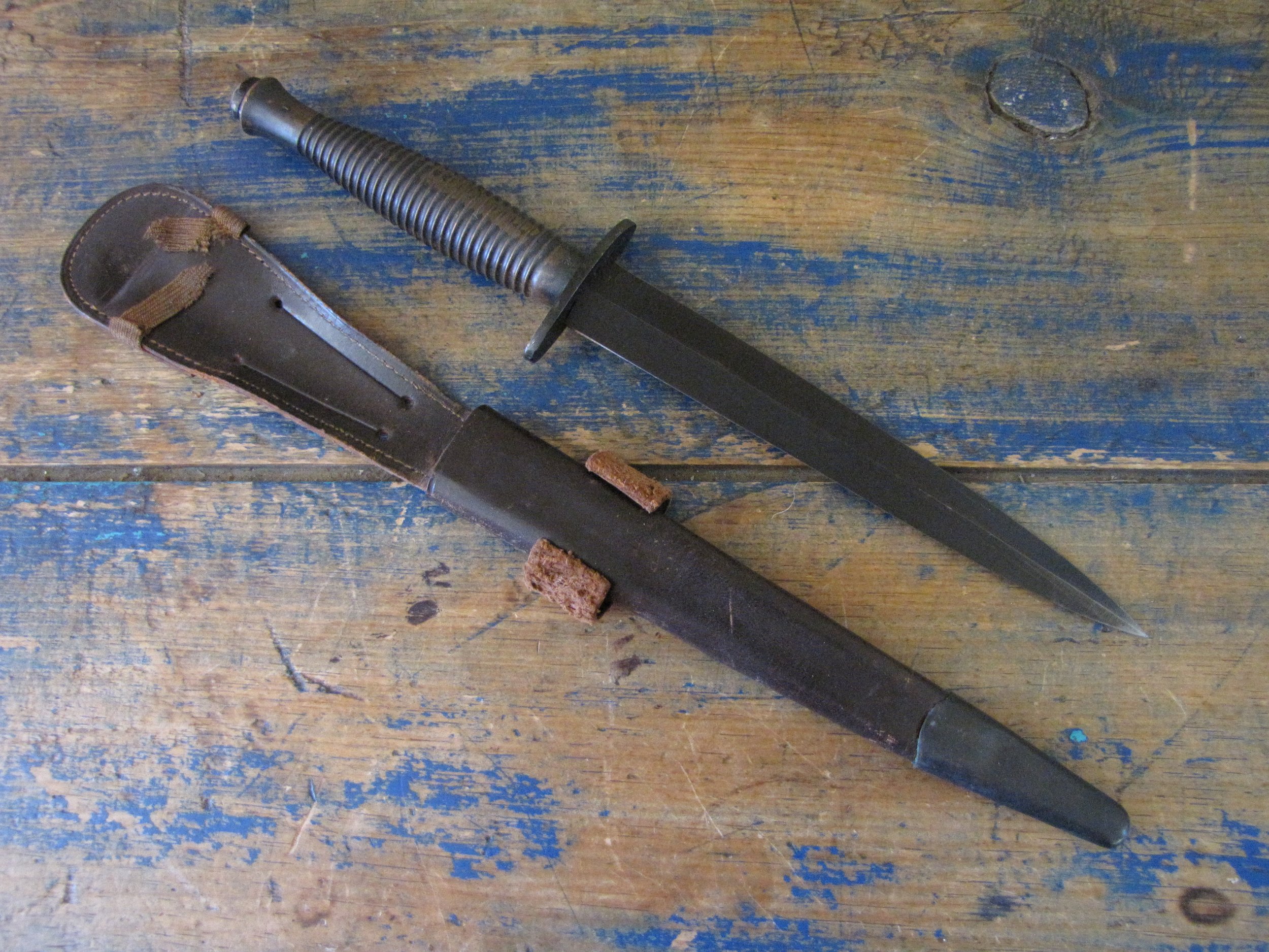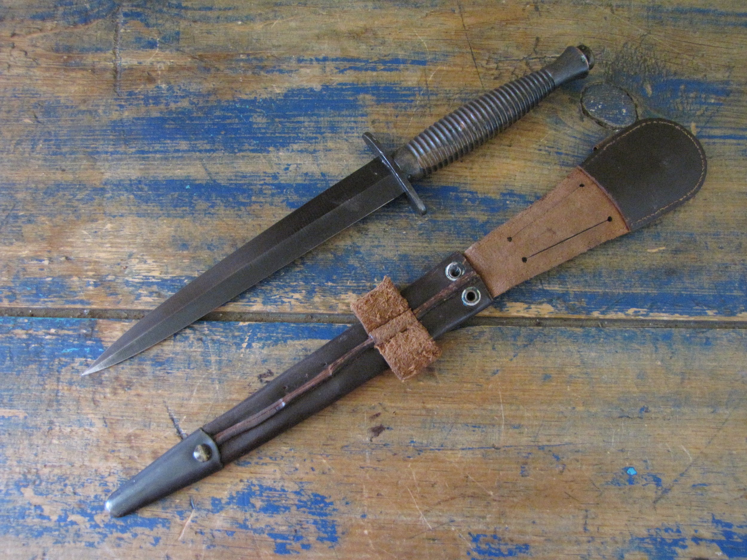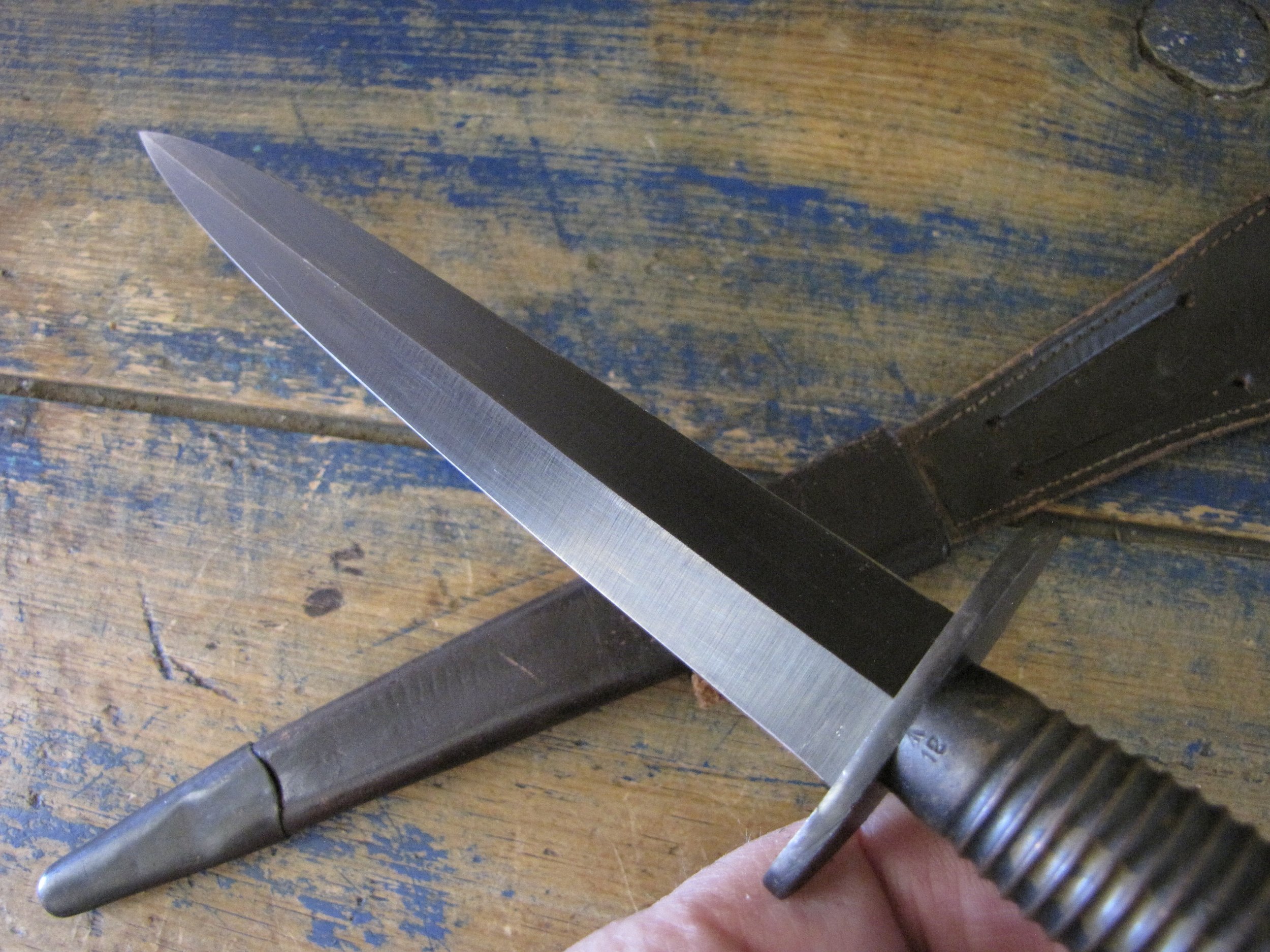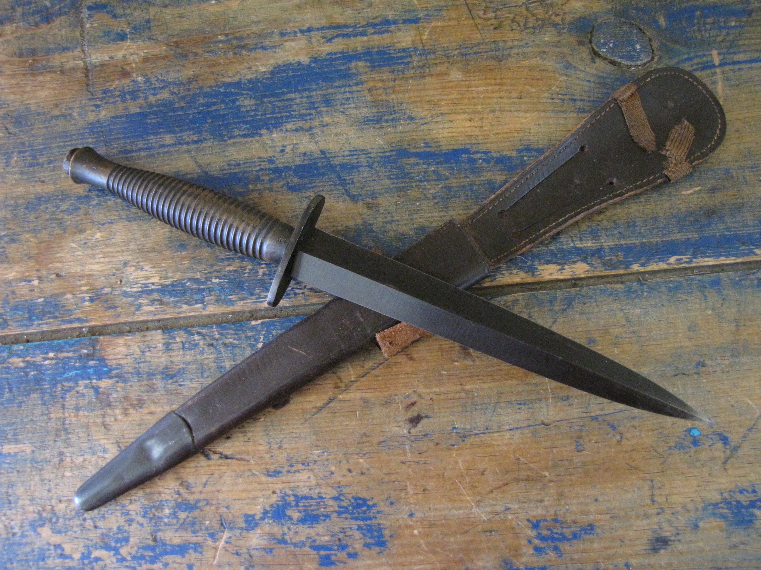 A really excellent example of the WWII production Third Pattern F-S complete with its original and correct scabbard. Retaining most of its original dark finish overall. The blade appears to be full length at 6 7/8”. The pommel nut is original and untouched. The grips cast mould number is ‘1’. The ferrule area of the grip is stamped with the seldom seen Ministry of Supply inspection/ownership code of ⩚12. Both the knife and scabbard are stamped England. The original and correct scabbard is in solid condition, one set of ‘wings’ is missing and the elastic is at fault. Overall a really fine example of this pattern, dating from 1944/5.