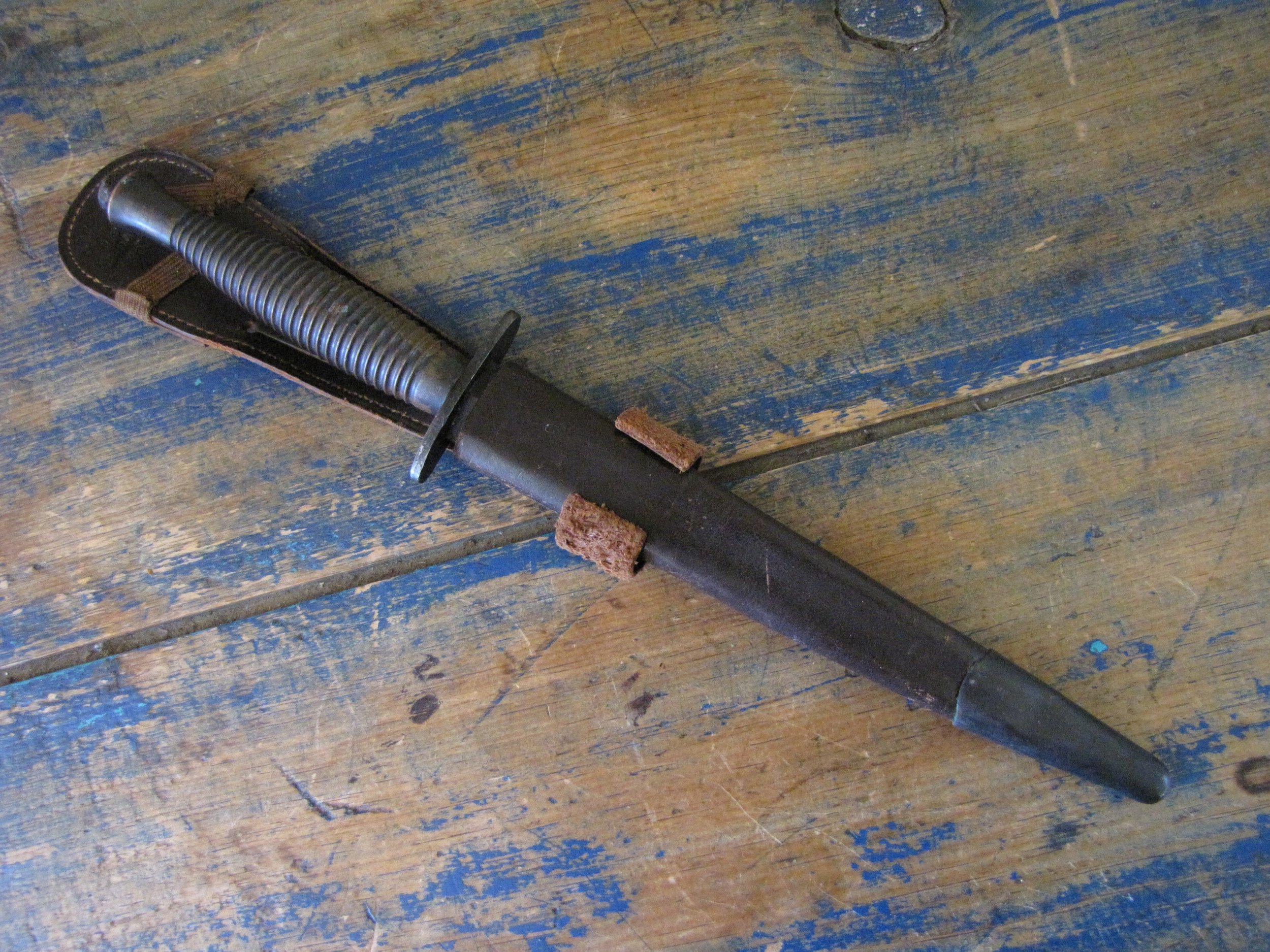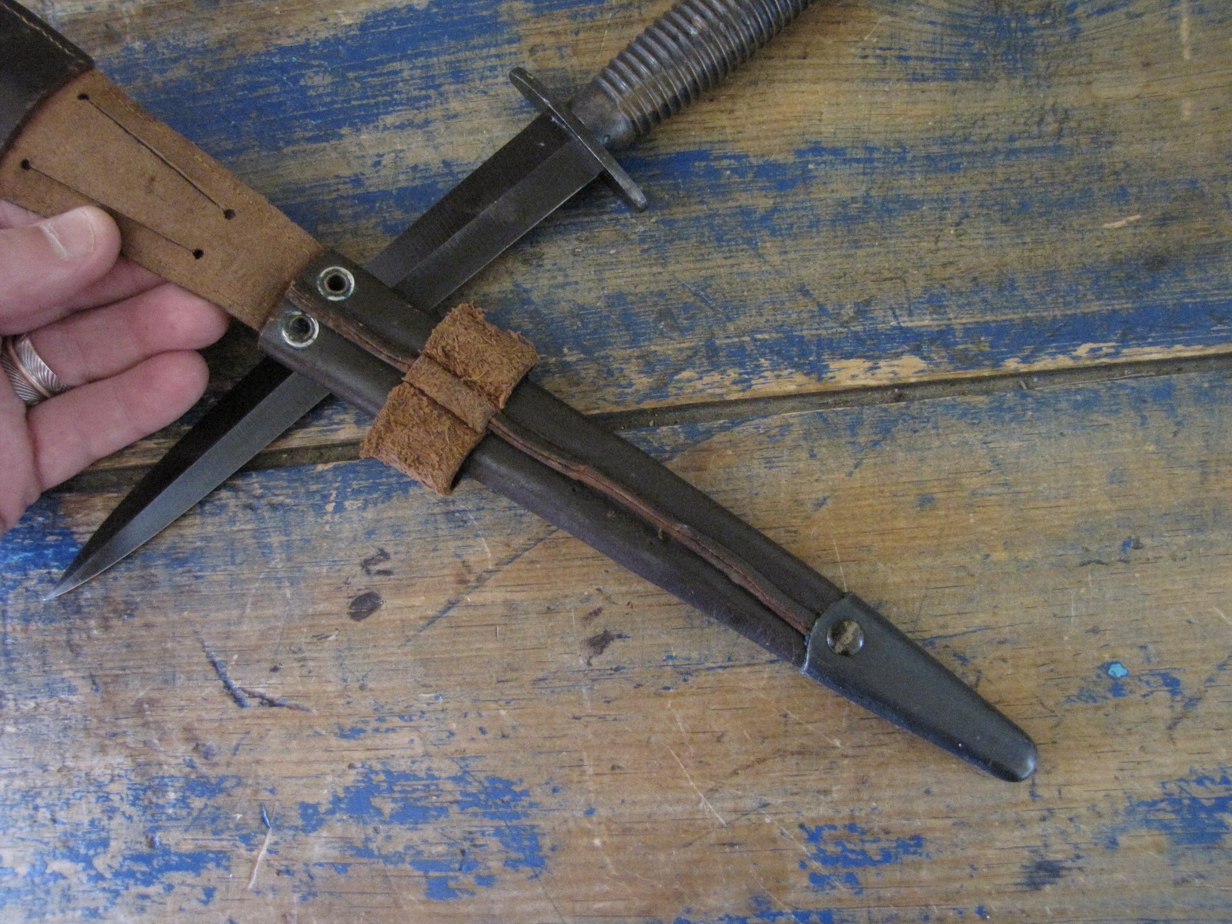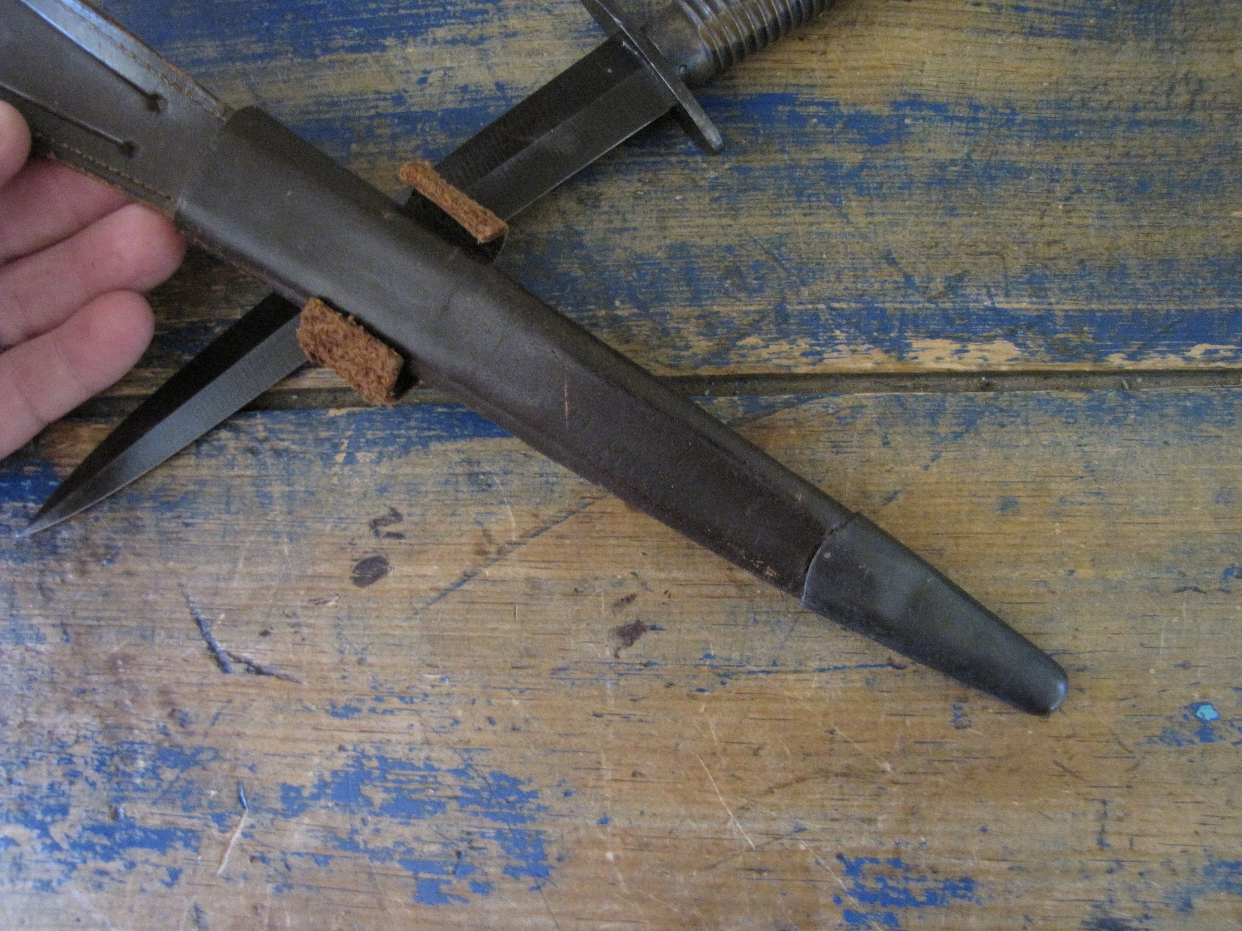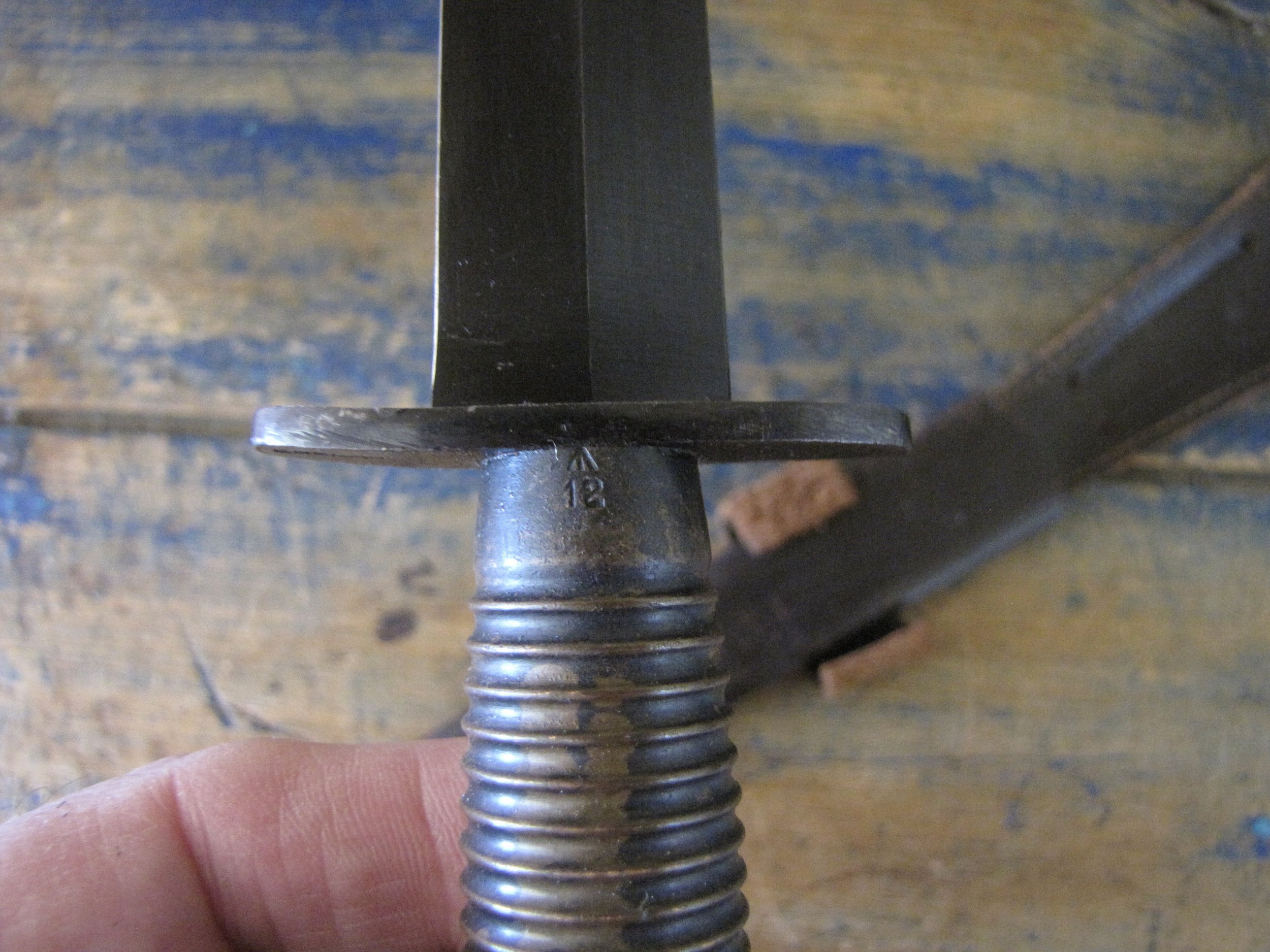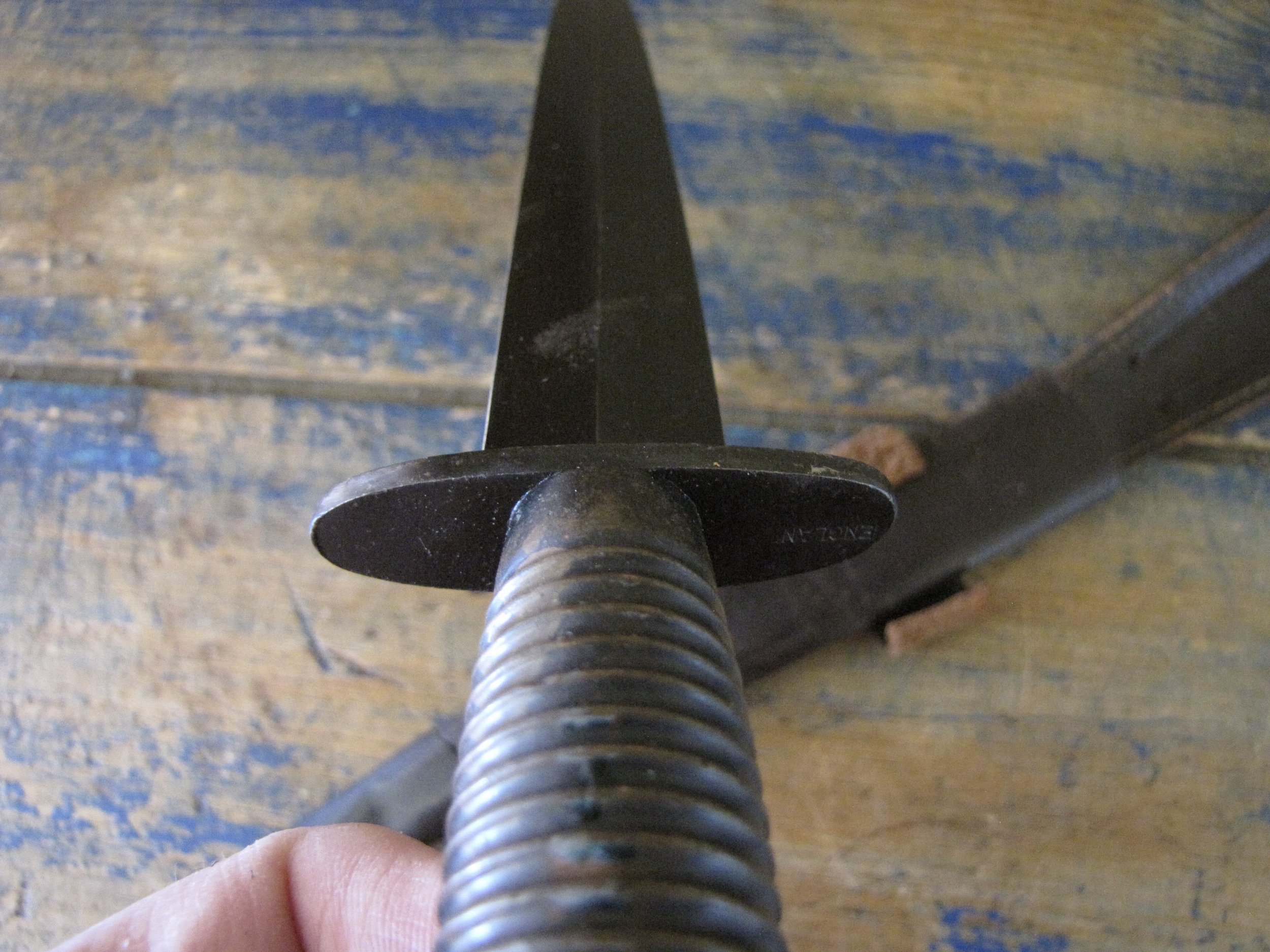 A really excellent example of the WWII production Third Pattern F-S complete with its original and correct scabbard. Retaining most of its original dark finish overall. The blade appears to be full length at 6 7/8”. The pommel nut is original and untouched. The grips cast mould number is ‘1’. The ferrule area of the grip is stamped with the seldom seen Ministry of Supply inspection/ownership code of ⩚12. Both the knife and scabbard are stamped England. The original and correct scabbard is in solid condition, one set of ‘wings’ is missing and the elastic is at fault. Overall a really fine example of this pattern, dating from 1944/5.