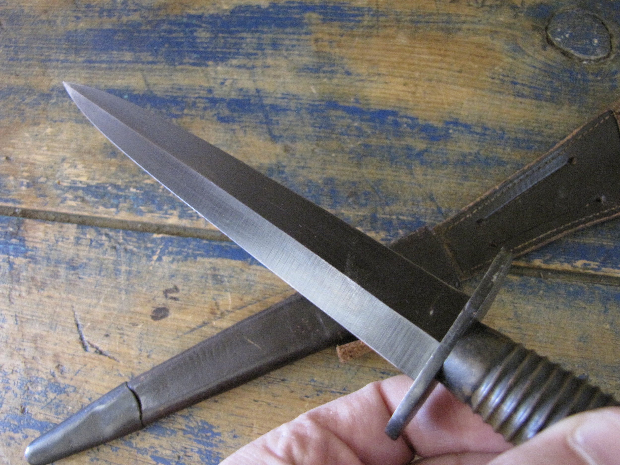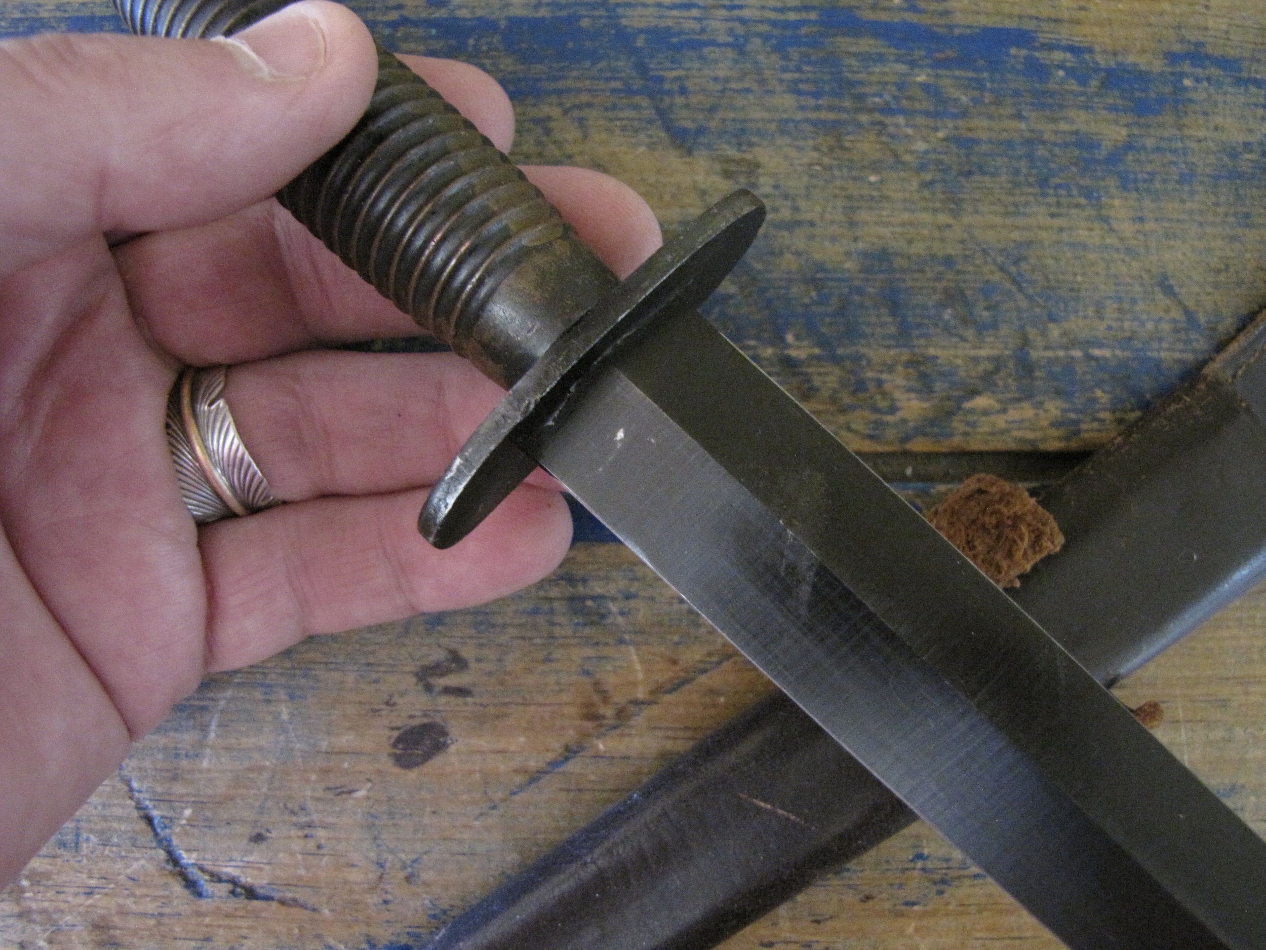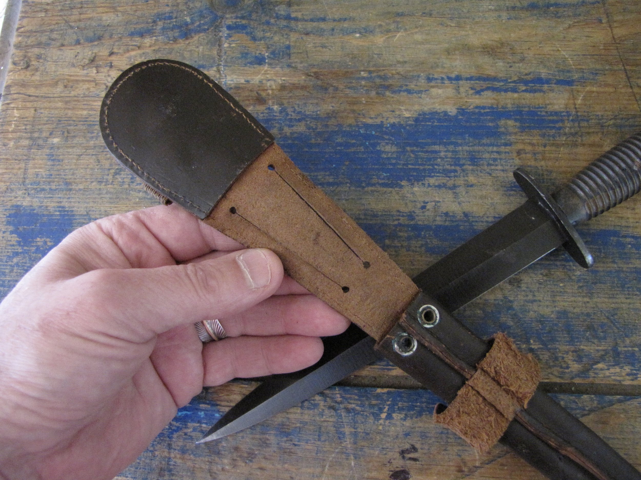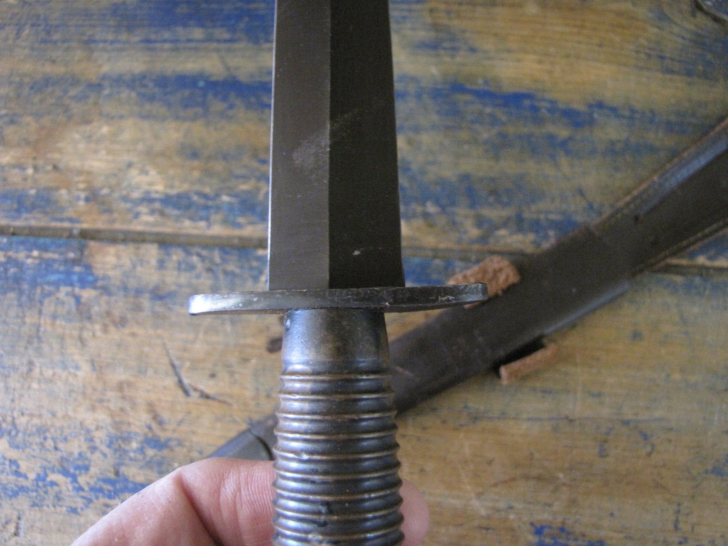 A really excellent example of the WWII production Third Pattern F-S complete with its original and correct scabbard. Retaining most of its original dark finish overall. The blade appears to be full length at 6 7/8”. The pommel nut is original and untouched. The grips cast mould number is ‘1’. The ferrule area of the grip is stamped with the seldom seen Ministry of Supply inspection/ownership code of ⩚12. Both the knife and scabbard are stamped England. The original and correct scabbard is in solid condition, one set of ‘wings’ is missing and the elastic is at fault. Overall a really fine example of this pattern, dating from 1944/5.