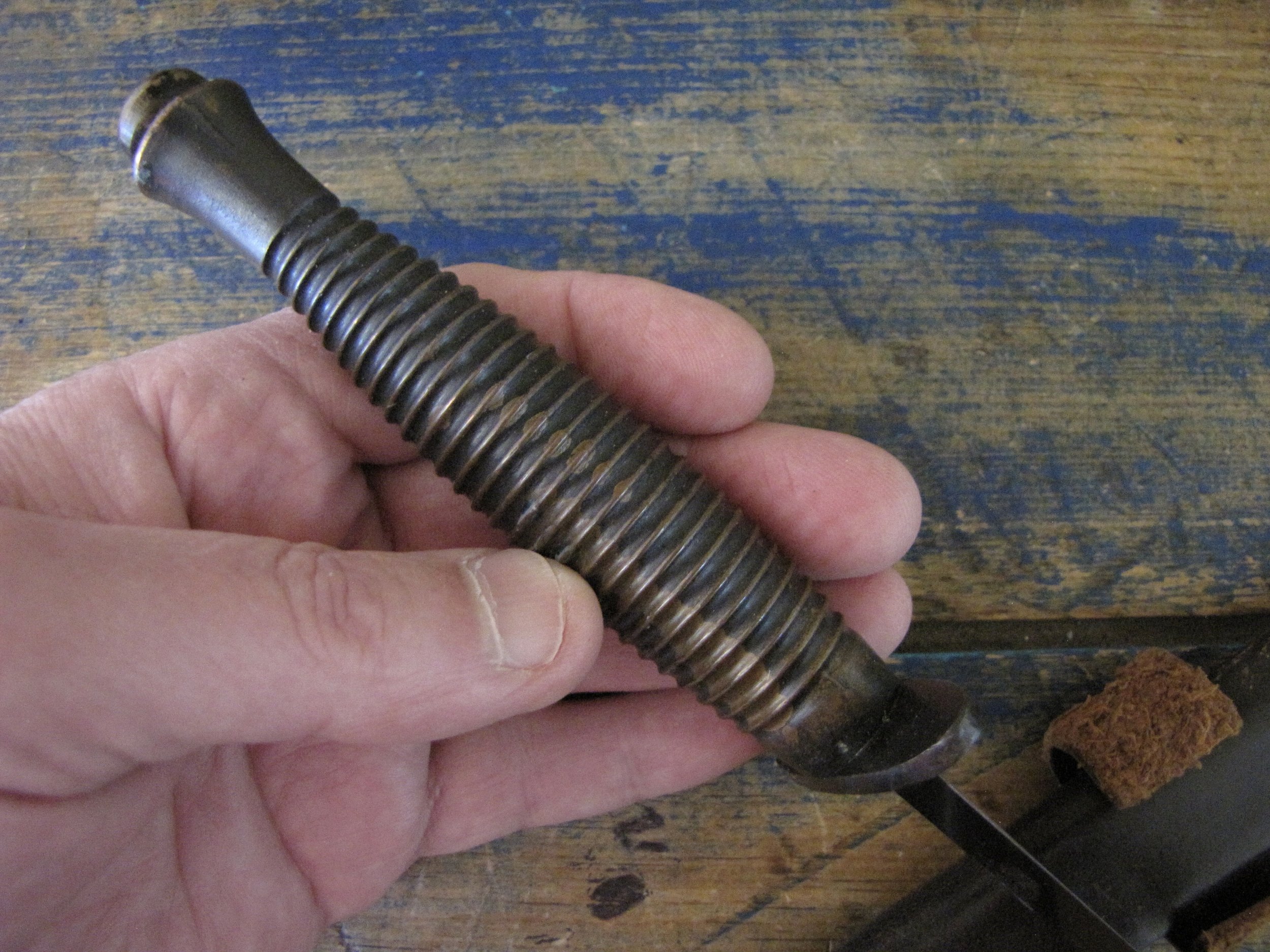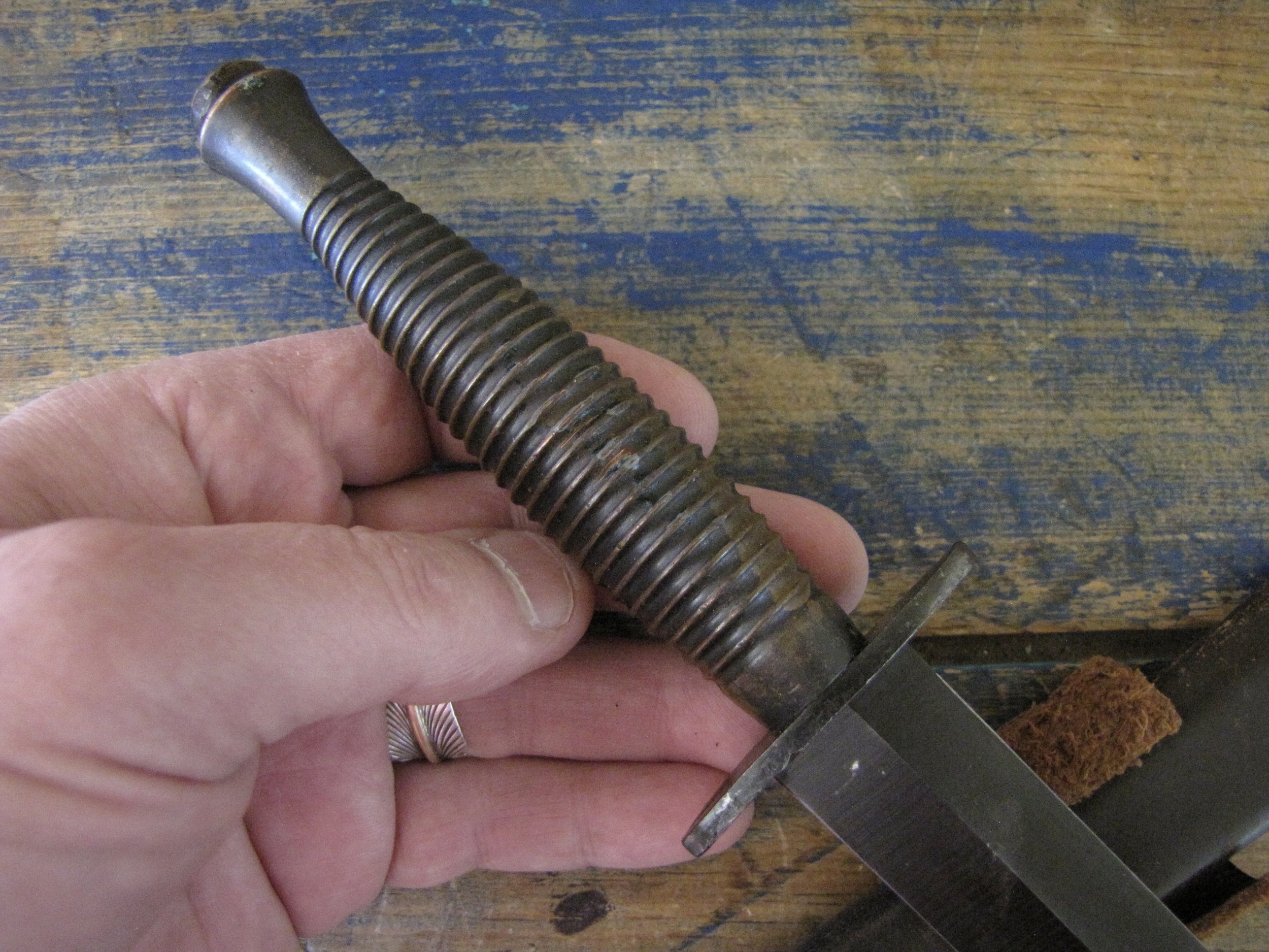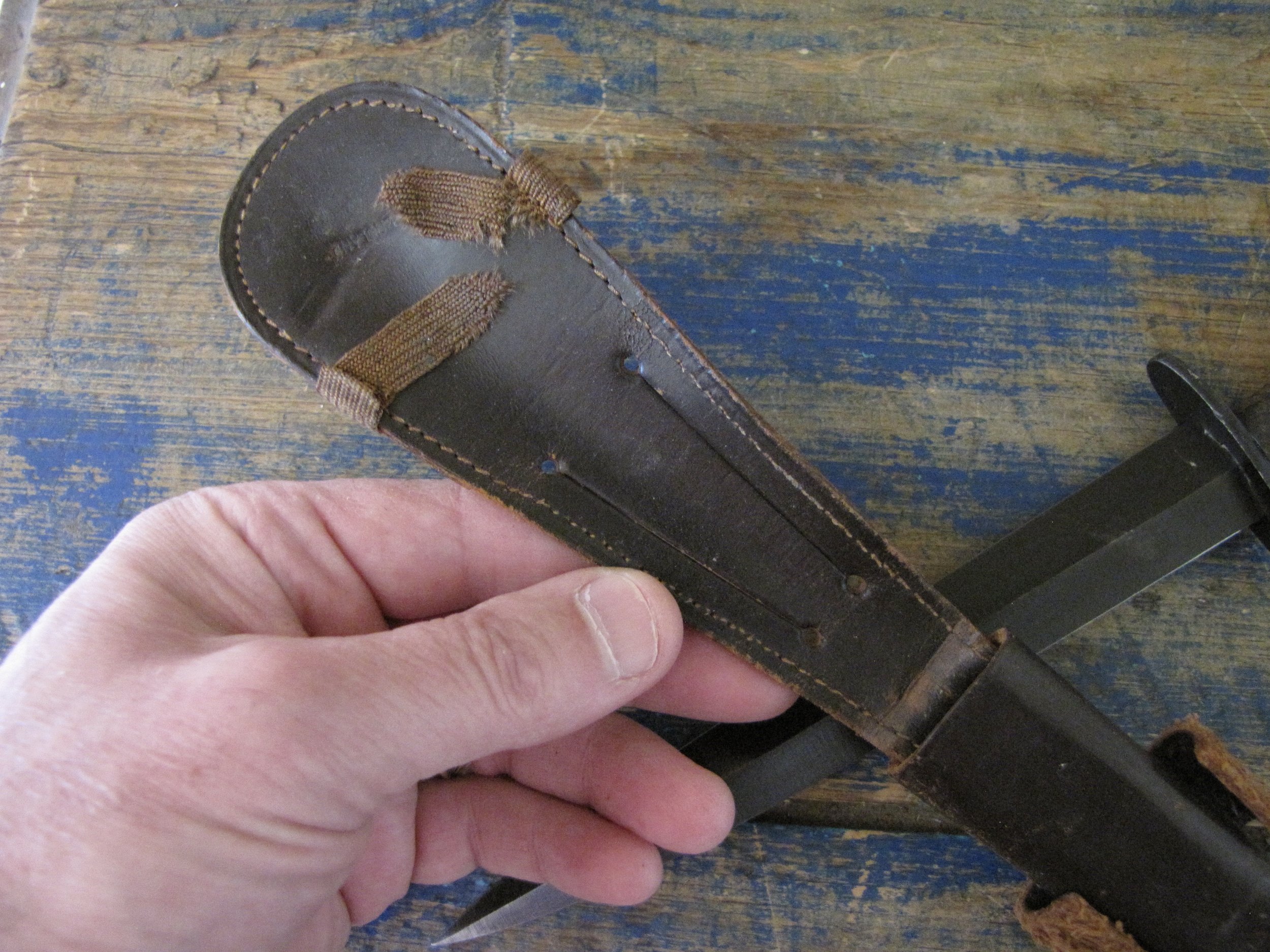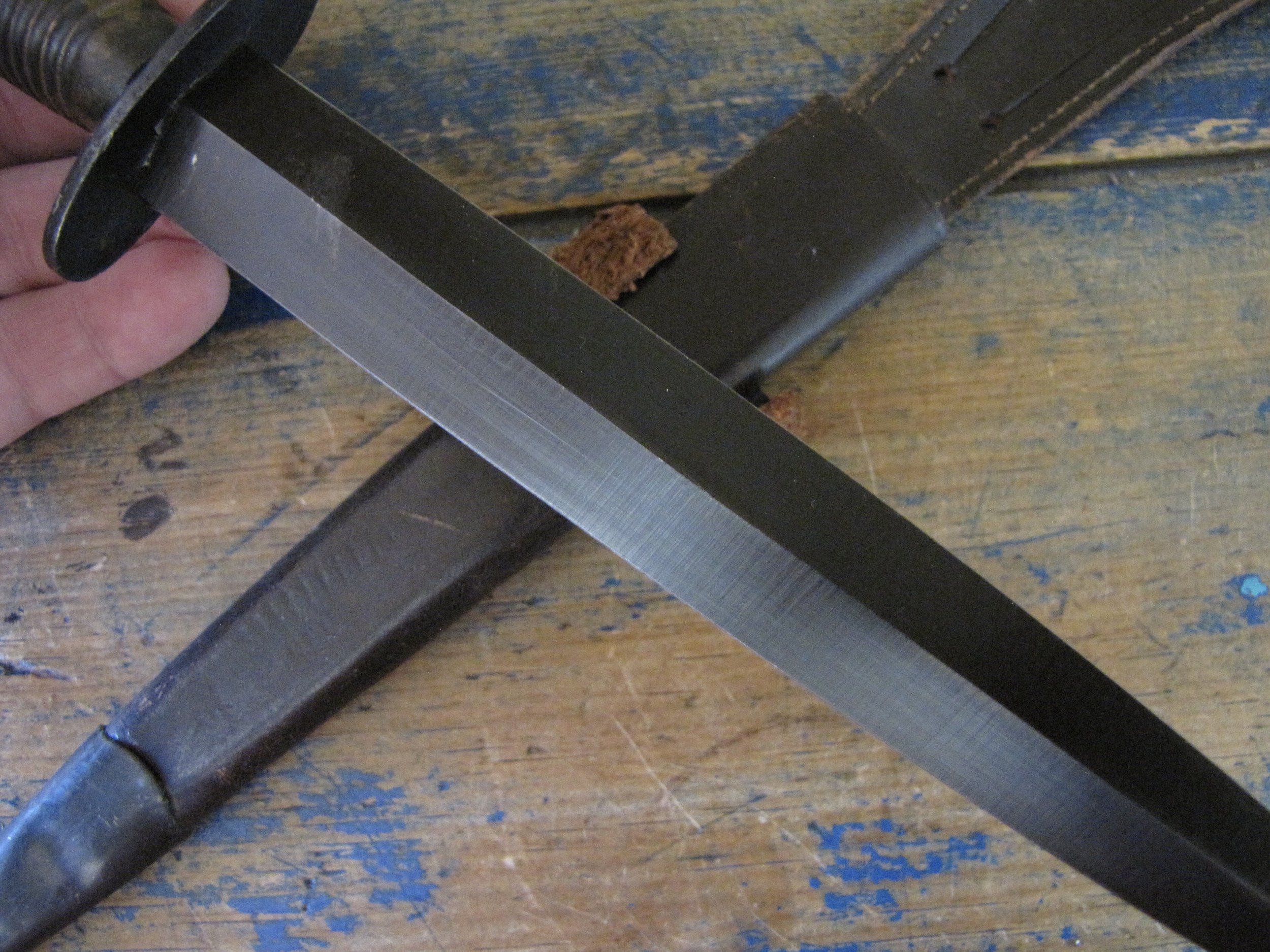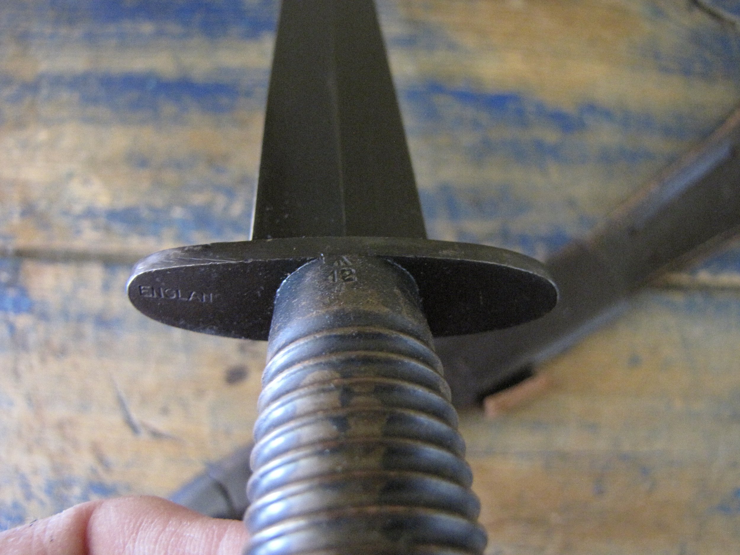 A really excellent example of the WWII production Third Pattern F-S complete with its original and correct scabbard. Retaining most of its original dark finish overall. The blade appears to be full length at 6 7/8”. The pommel nut is original and untouched. The grips cast mould number is ‘1’. The ferrule area of the grip is stamped with the seldom seen Ministry of Supply inspection/ownership code of ⩚12. Both the knife and scabbard are stamped England. The original and correct scabbard is in solid condition, one set of ‘wings’ is missing and the elastic is at fault. Overall a really fine example of this pattern, dating from 1944/5.