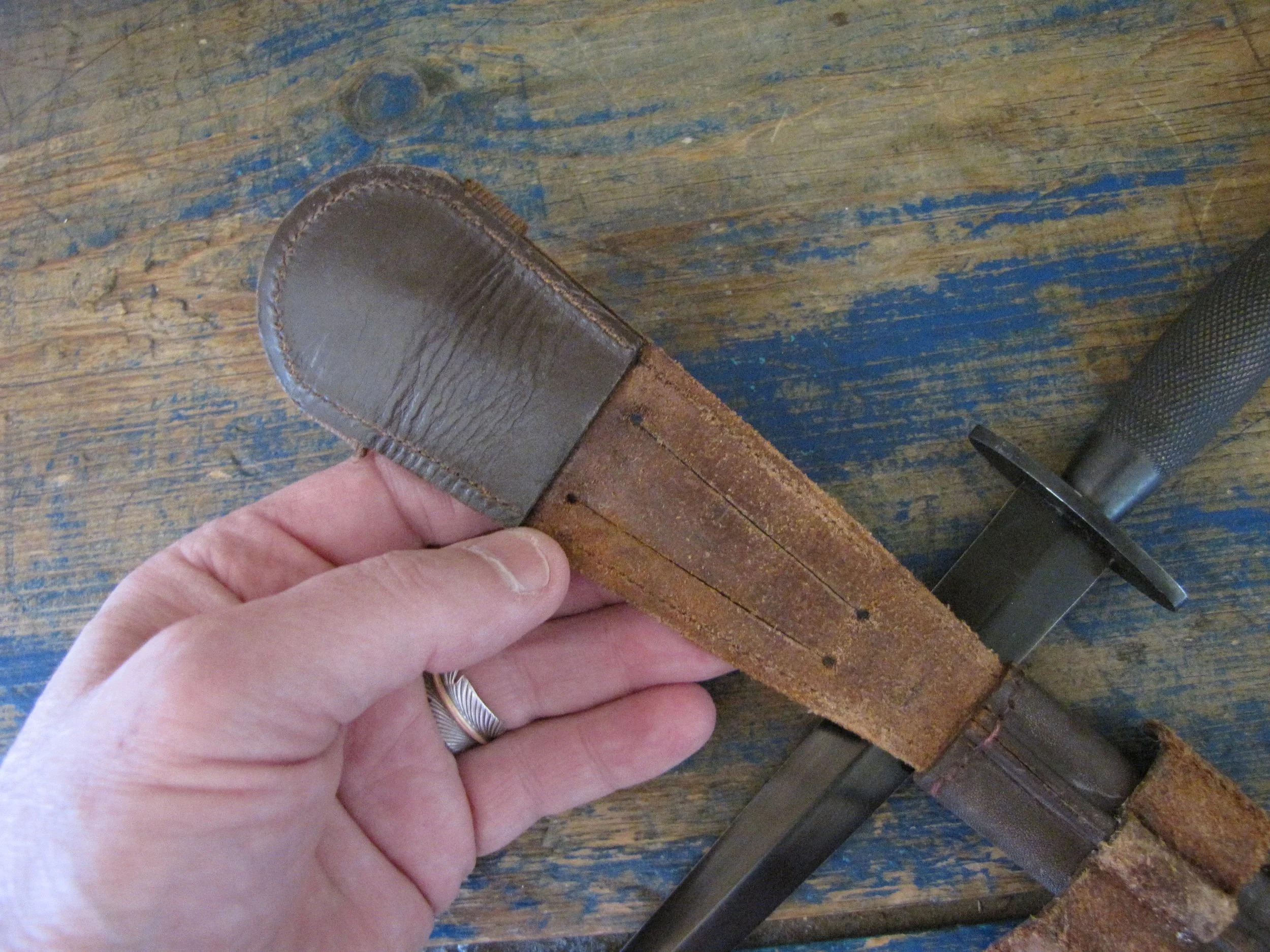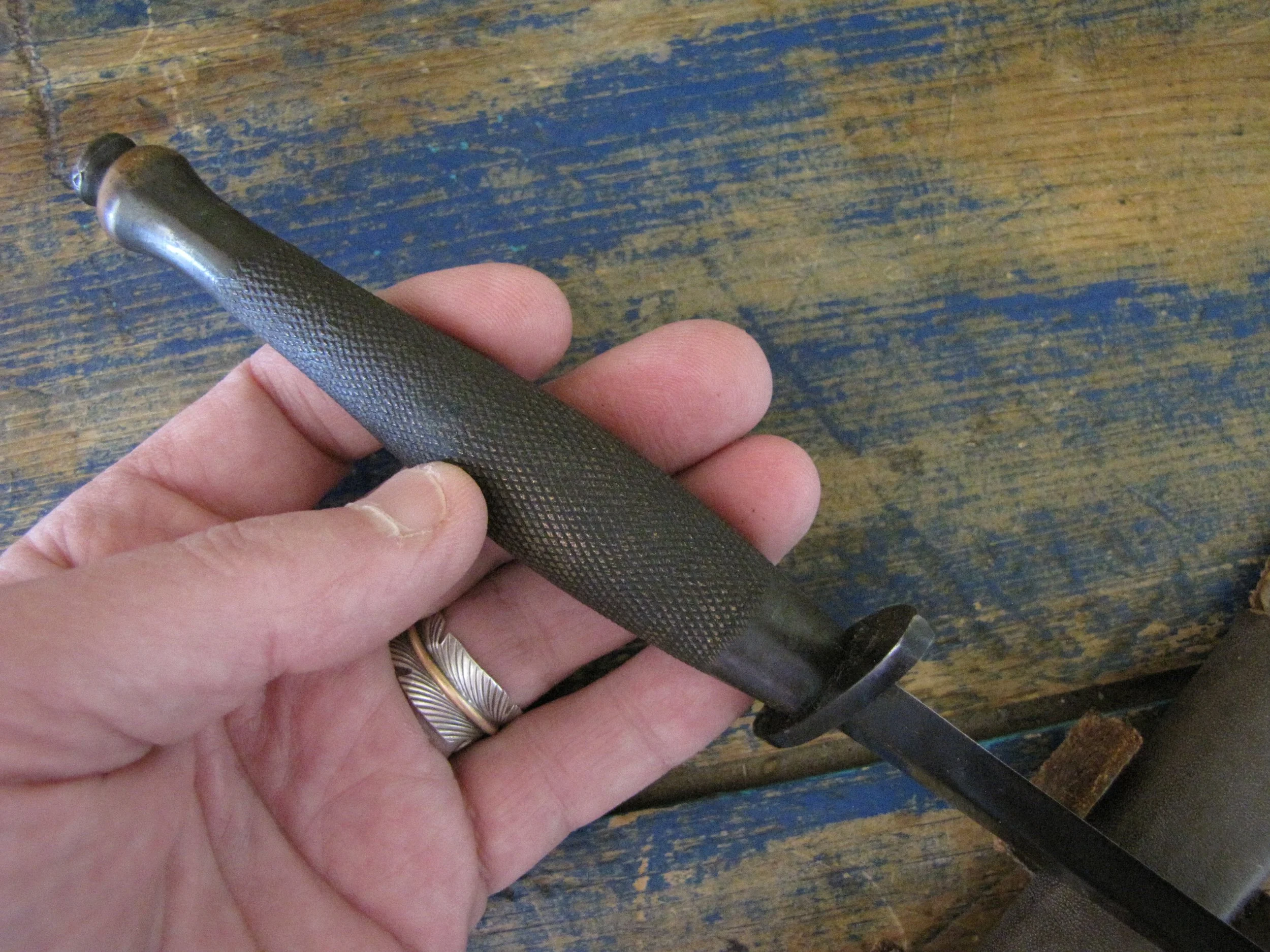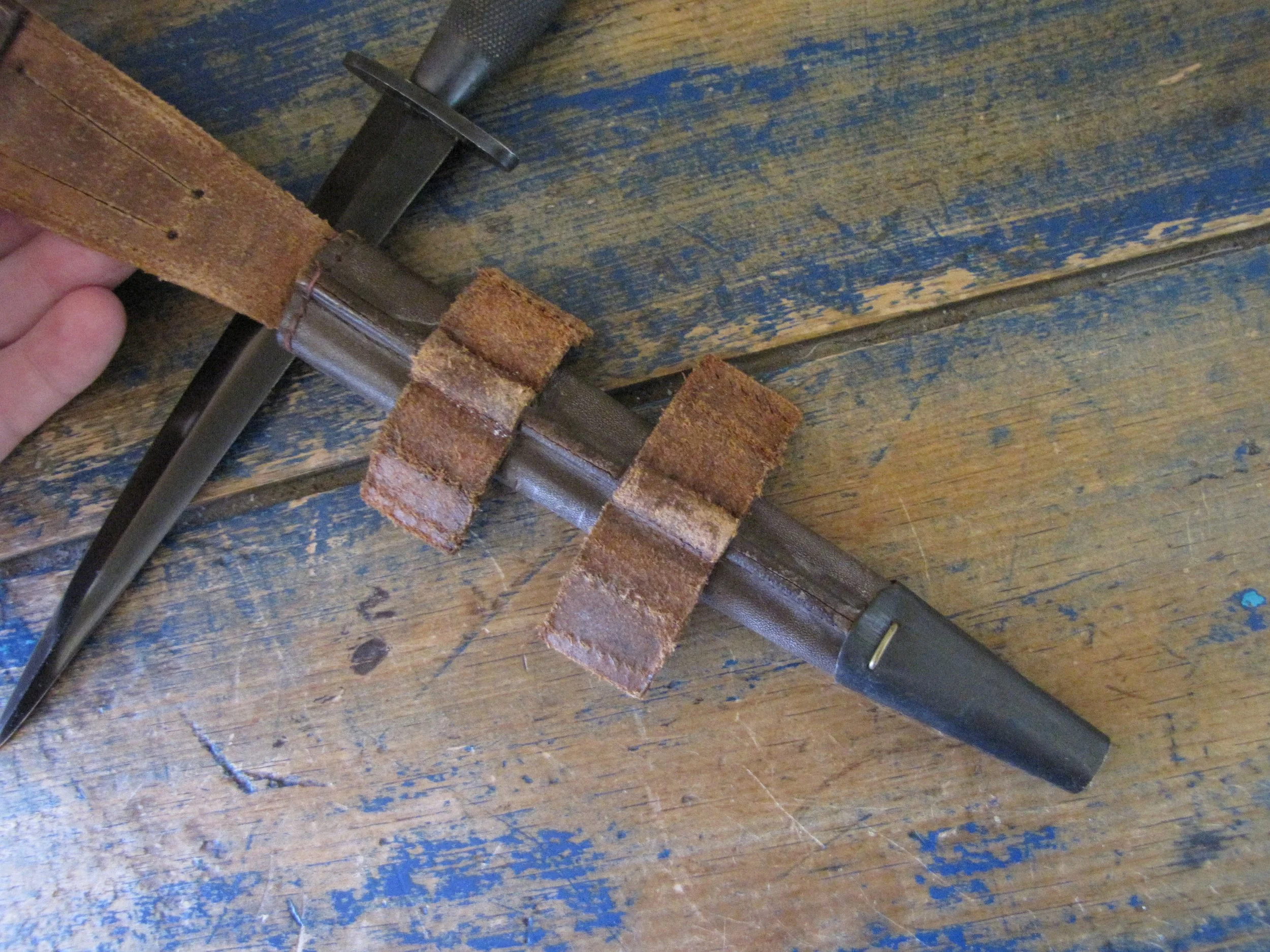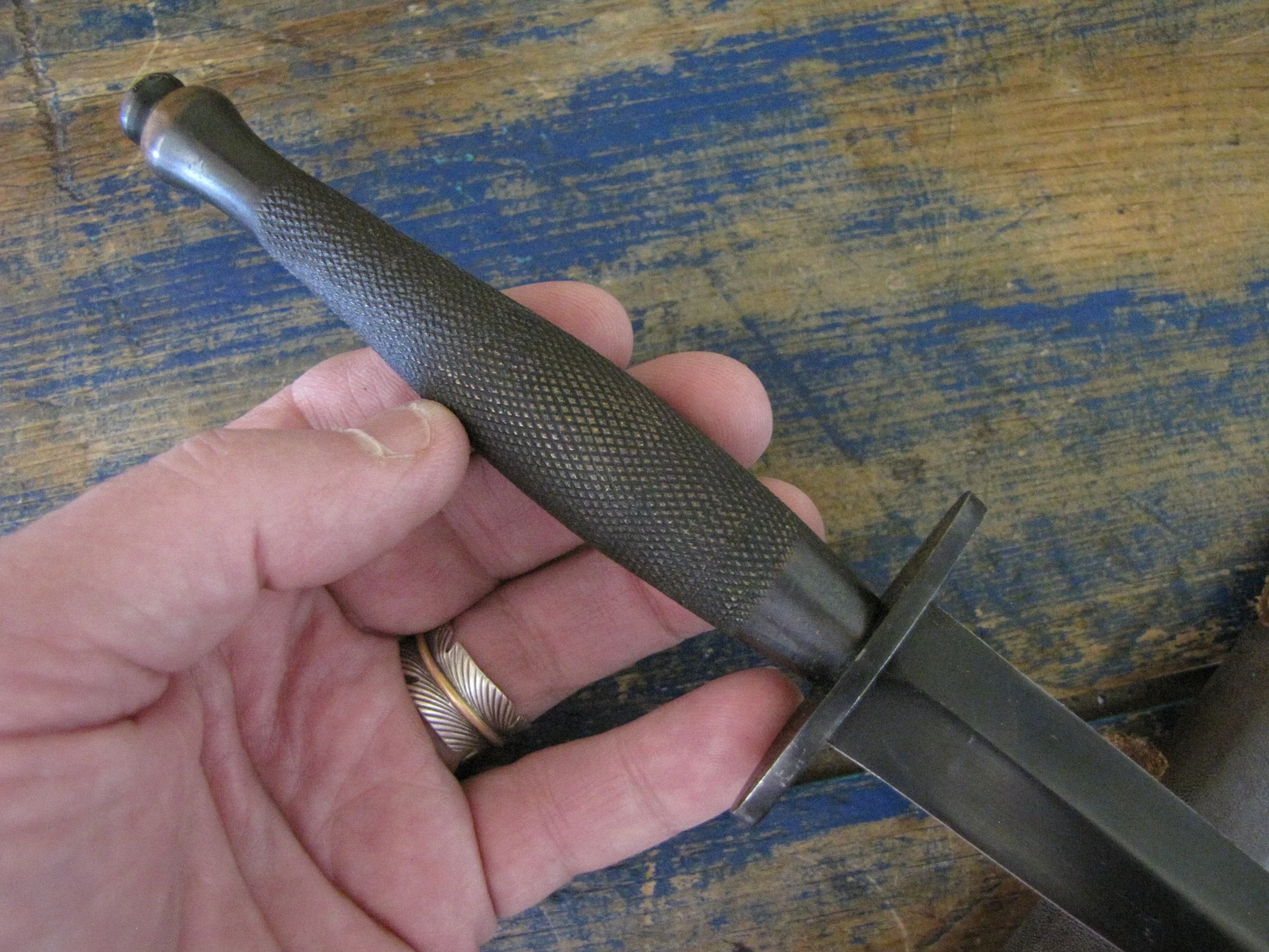 An excellent example of the Wilkinson MoS contract Second Pattern F-S. Both knife and scabbard are marked with the ‘England’ import stamp, so an un-issued knife. The crossguard is stamped with the Ministry of Supply inspection/ownership stamp of ⩚B2, the last digit not visible due to an inaccurate stamping, common on these knives. The hand-ground blade appears full length at 6 5/8” and retains almost all of its original high luster dark finish. The pommel nut is original and untouched. Overall a really clean, solid and honest example, showing what appears to be just handling and/or storage wear only. This knife comes with its original and correct Wilkinson scabbard and is complete with both wings and the elastic retaining strap, a little stretched but still present.