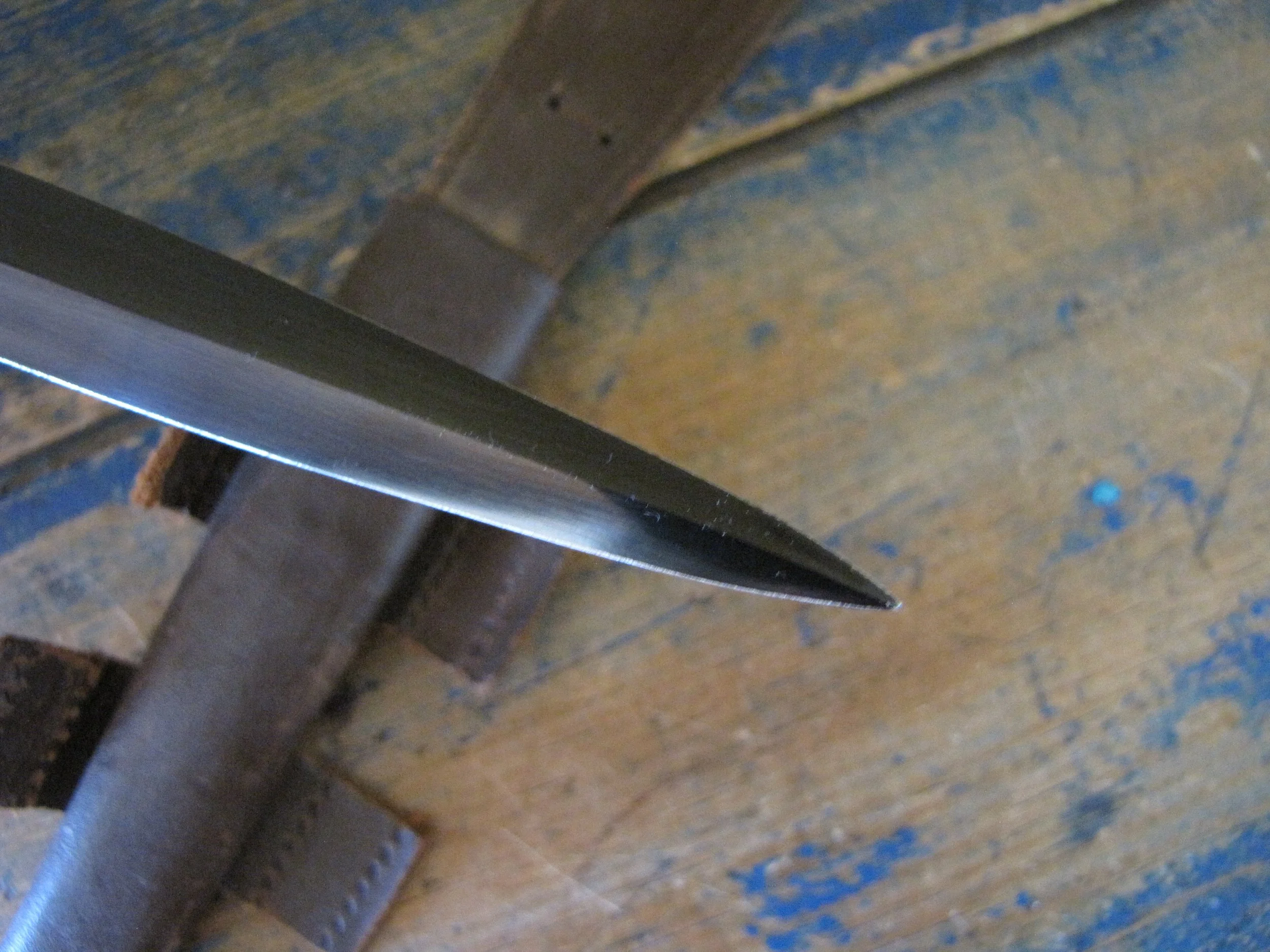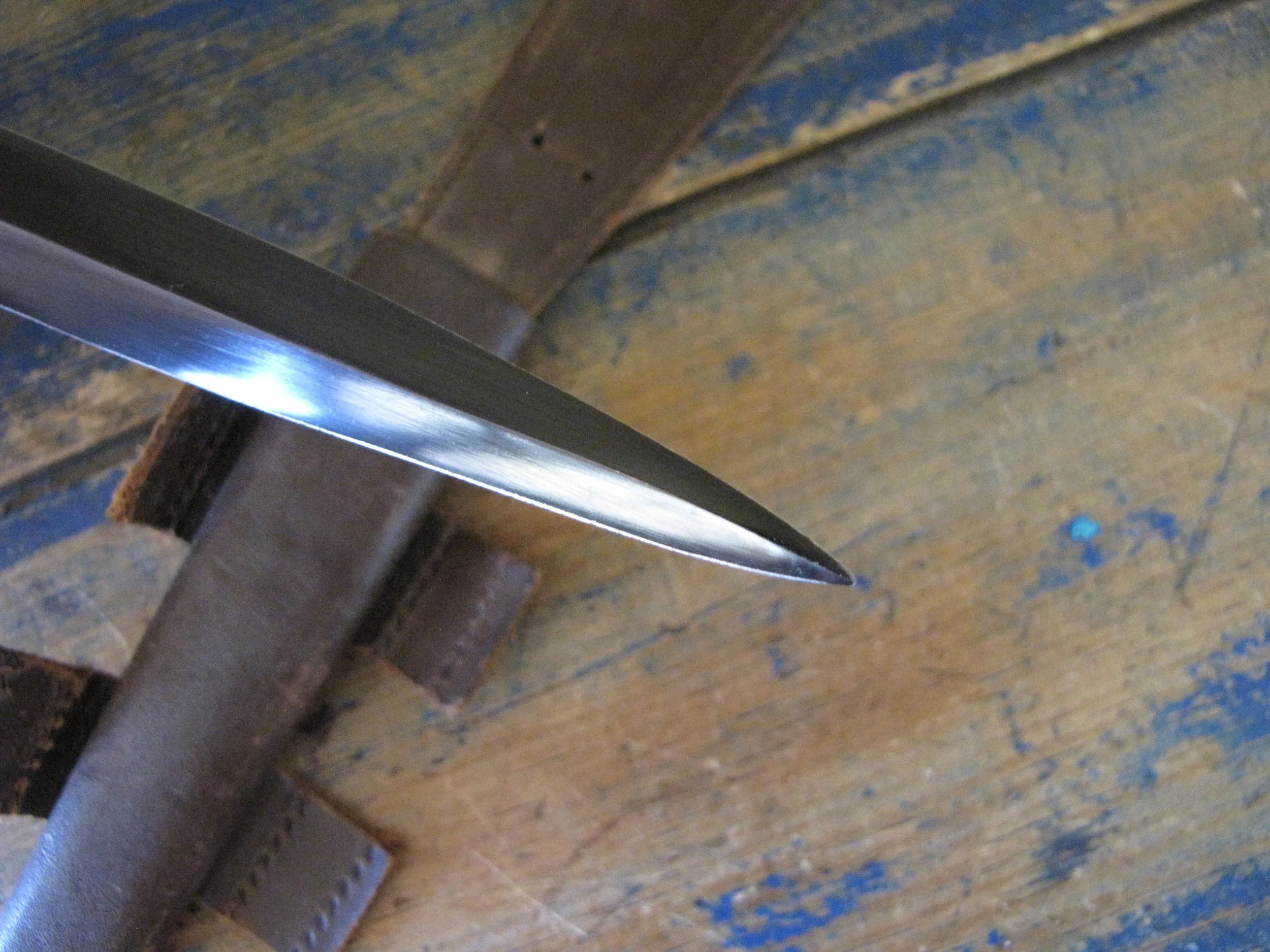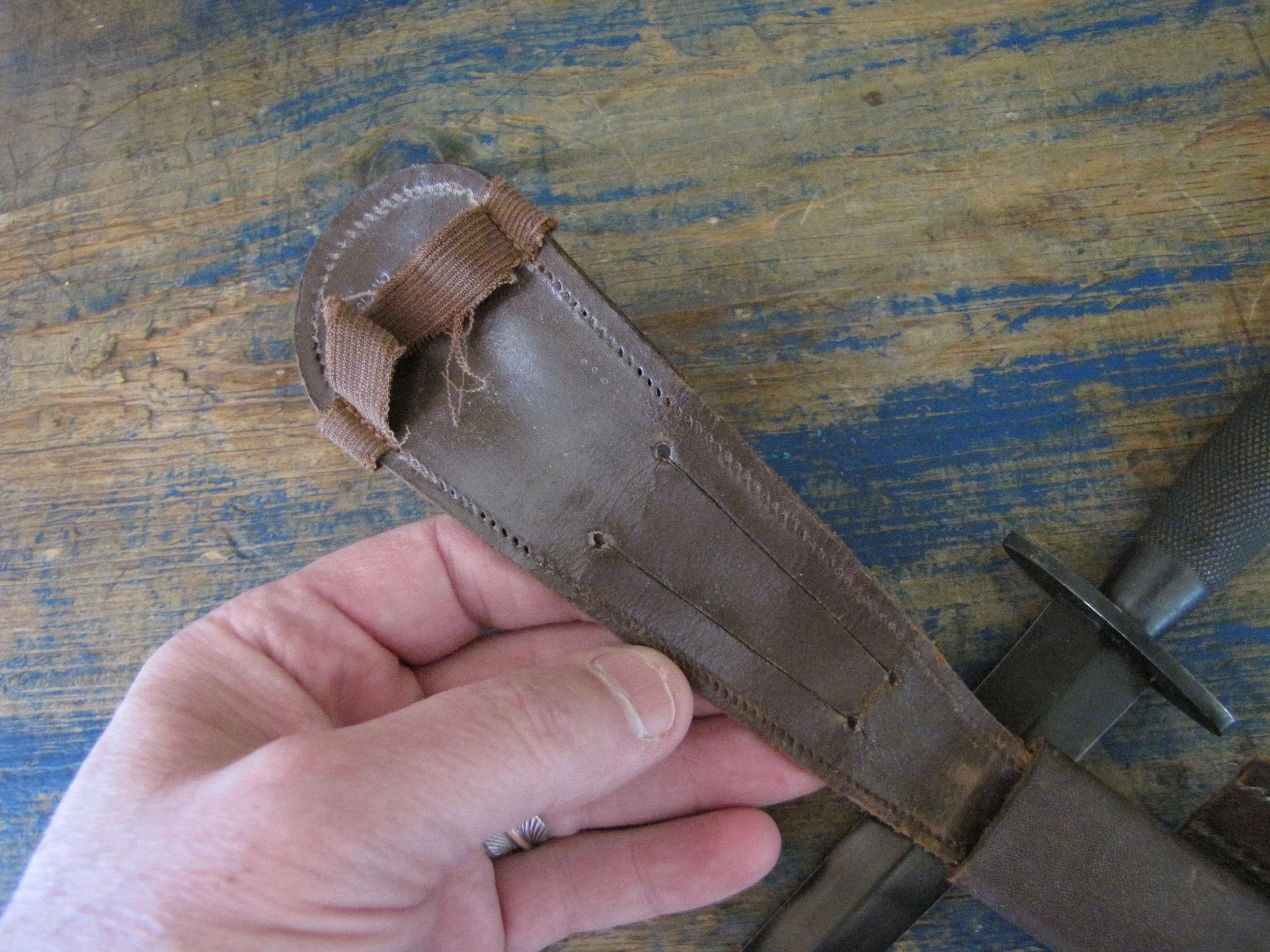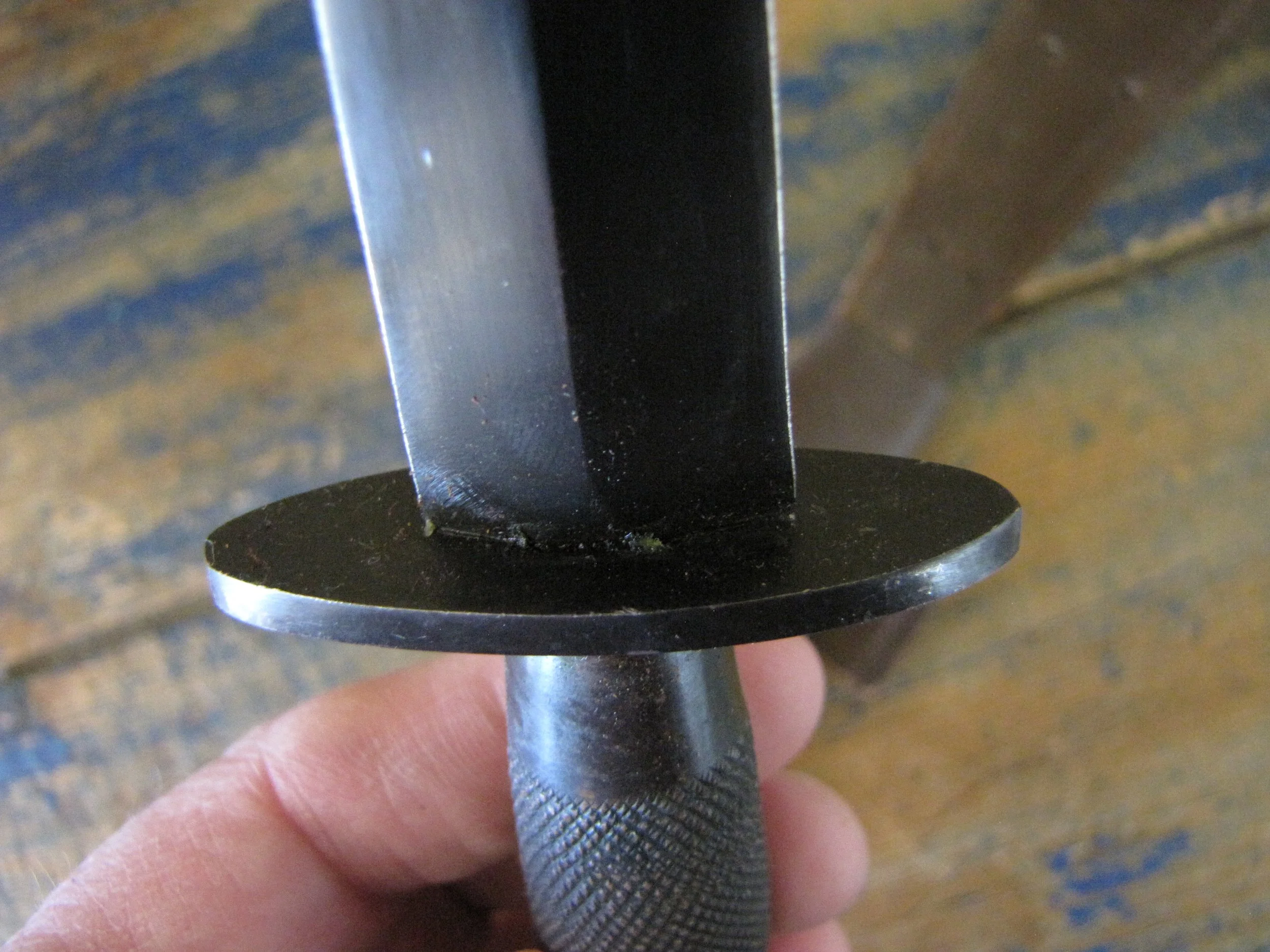 An excellent example of the Wilkinson MoS contract Second Pattern F-S. Both knife and scabbard are marked with the ‘England’ import stamp, so an un-issued knife. The crossguard is stamped with the Ministry of Supply inspection/ownership stamp of ⩚B2, the last digit not visible due to an inaccurate stamping, common on these knives. The hand-ground blade appears full length at 6 5/8” and retains almost all of its original high luster dark finish. The pommel nut is original and untouched. Overall a really clean, solid and honest example, showing what appears to be just handling and/or storage wear only. This knife comes with its original and correct Wilkinson scabbard and is complete with both wings and the elastic retaining strap, a little stretched but still present.