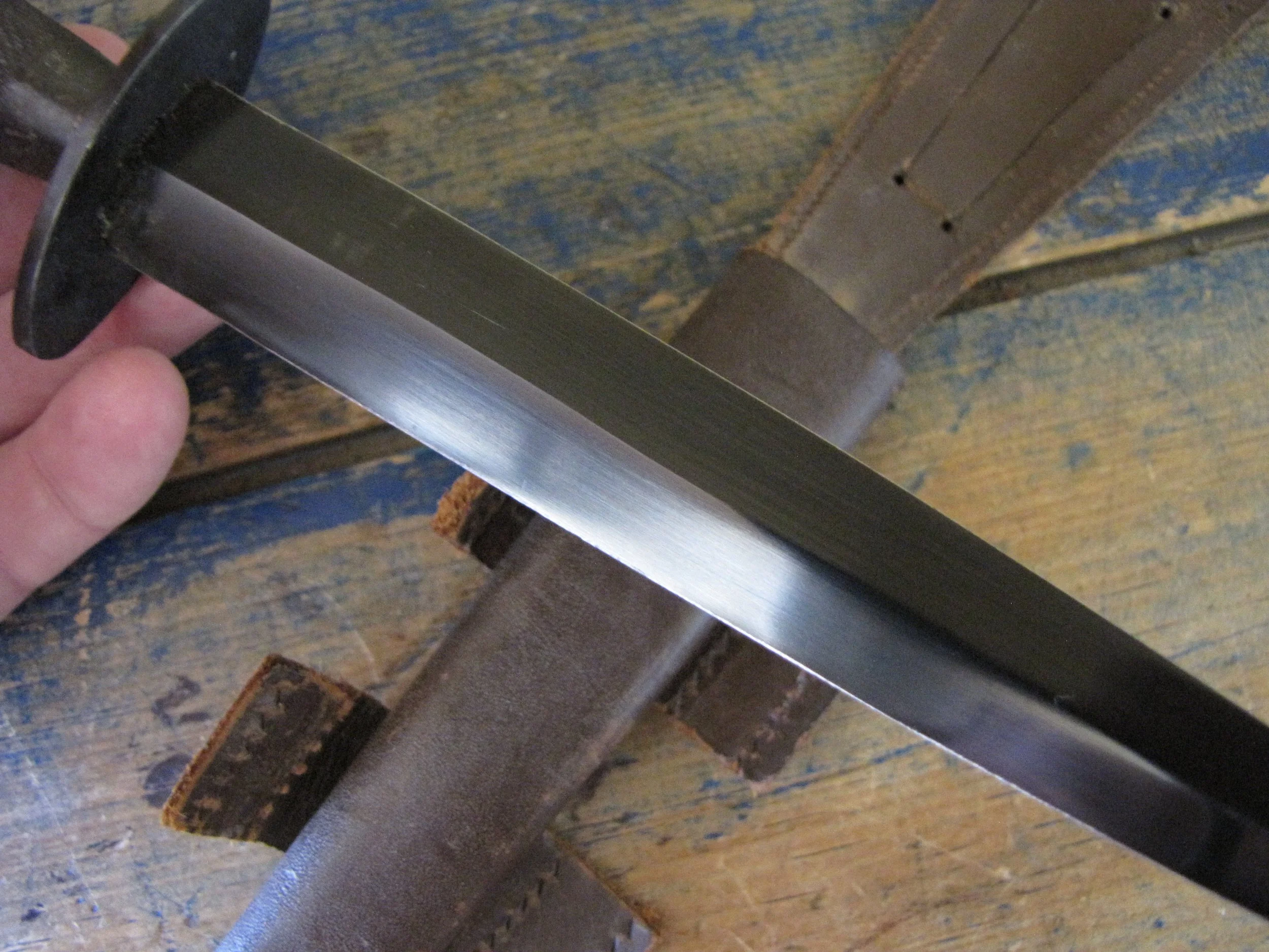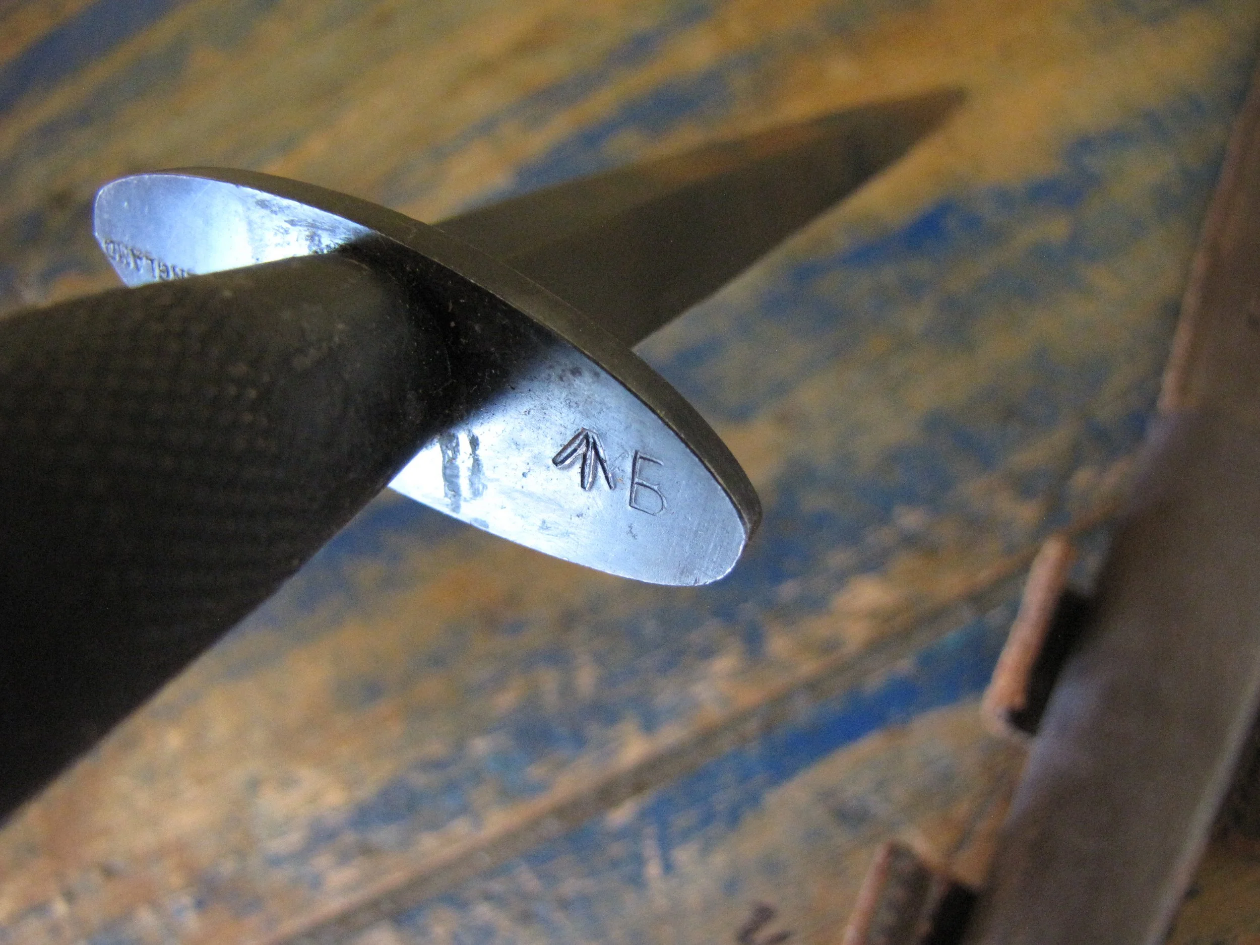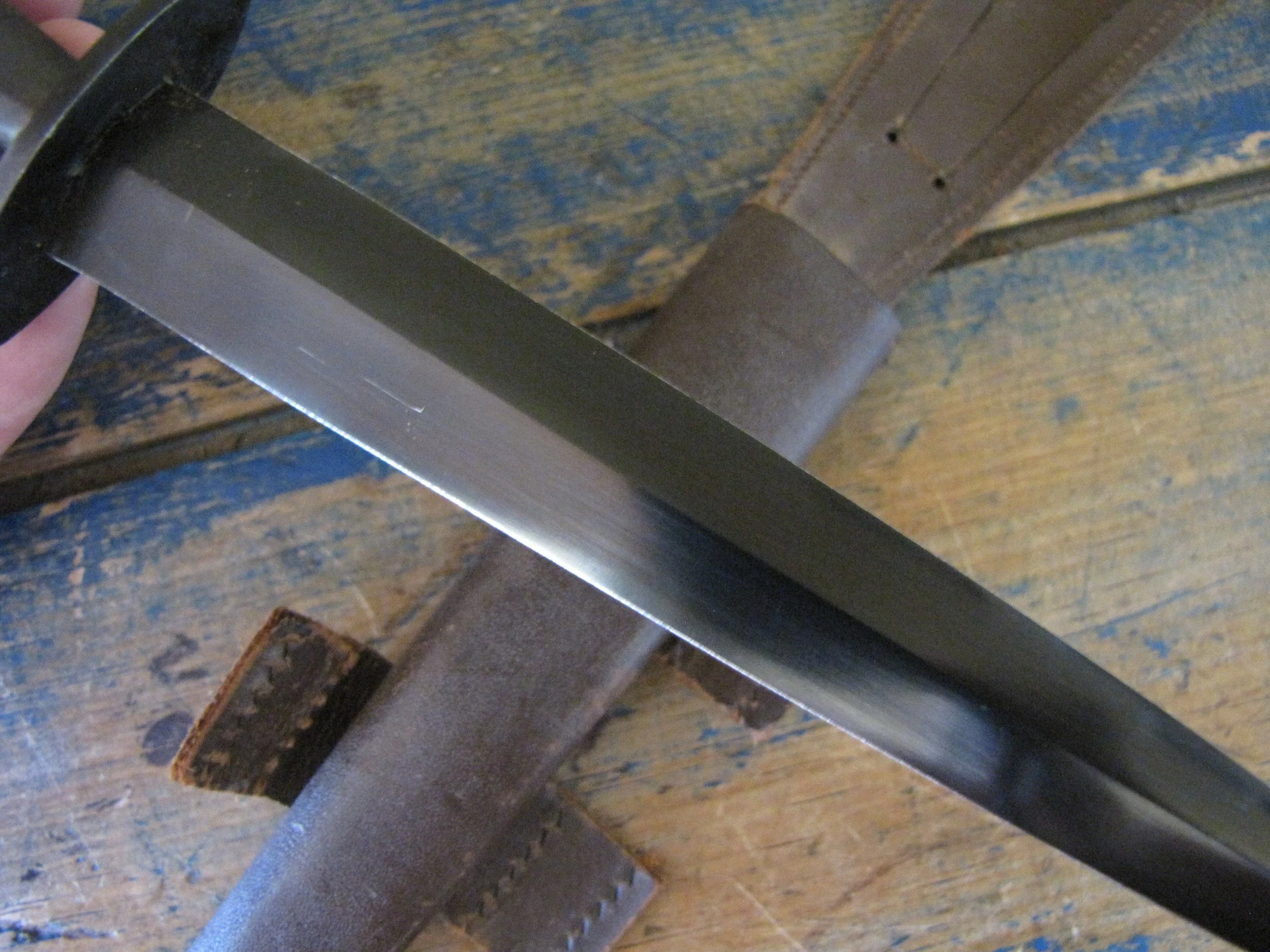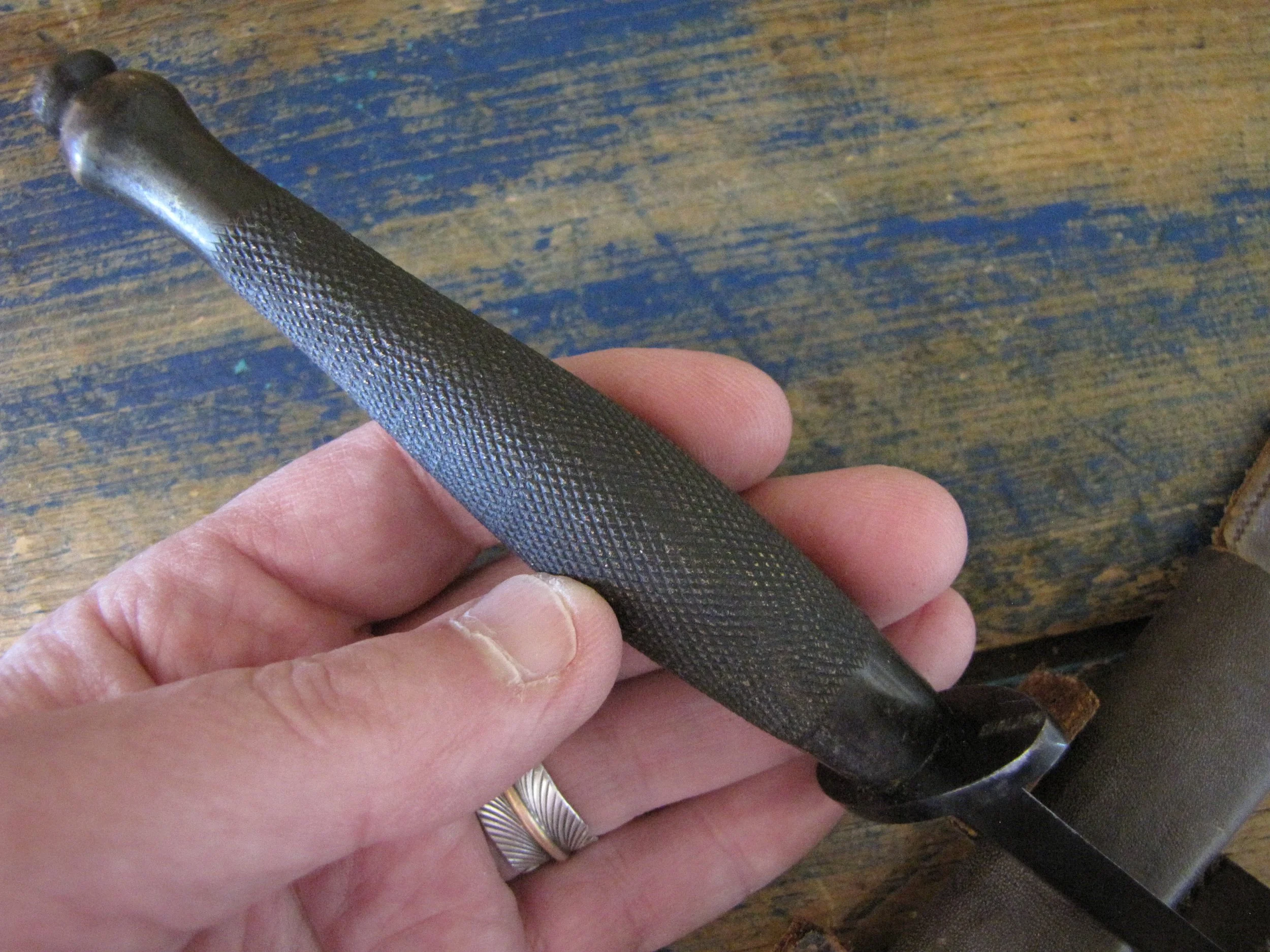 An excellent example of the Wilkinson MoS contract Second Pattern F-S. Both knife and scabbard are marked with the ‘England’ import stamp, so an un-issued knife. The crossguard is stamped with the Ministry of Supply inspection/ownership stamp of ⩚B2, the last digit not visible due to an inaccurate stamping, common on these knives. The hand-ground blade appears full length at 6 5/8” and retains almost all of its original high luster dark finish. The pommel nut is original and untouched. Overall a really clean, solid and honest example, showing what appears to be just handling and/or storage wear only. This knife comes with its original and correct Wilkinson scabbard and is complete with both wings and the elastic retaining strap, a little stretched but still present.