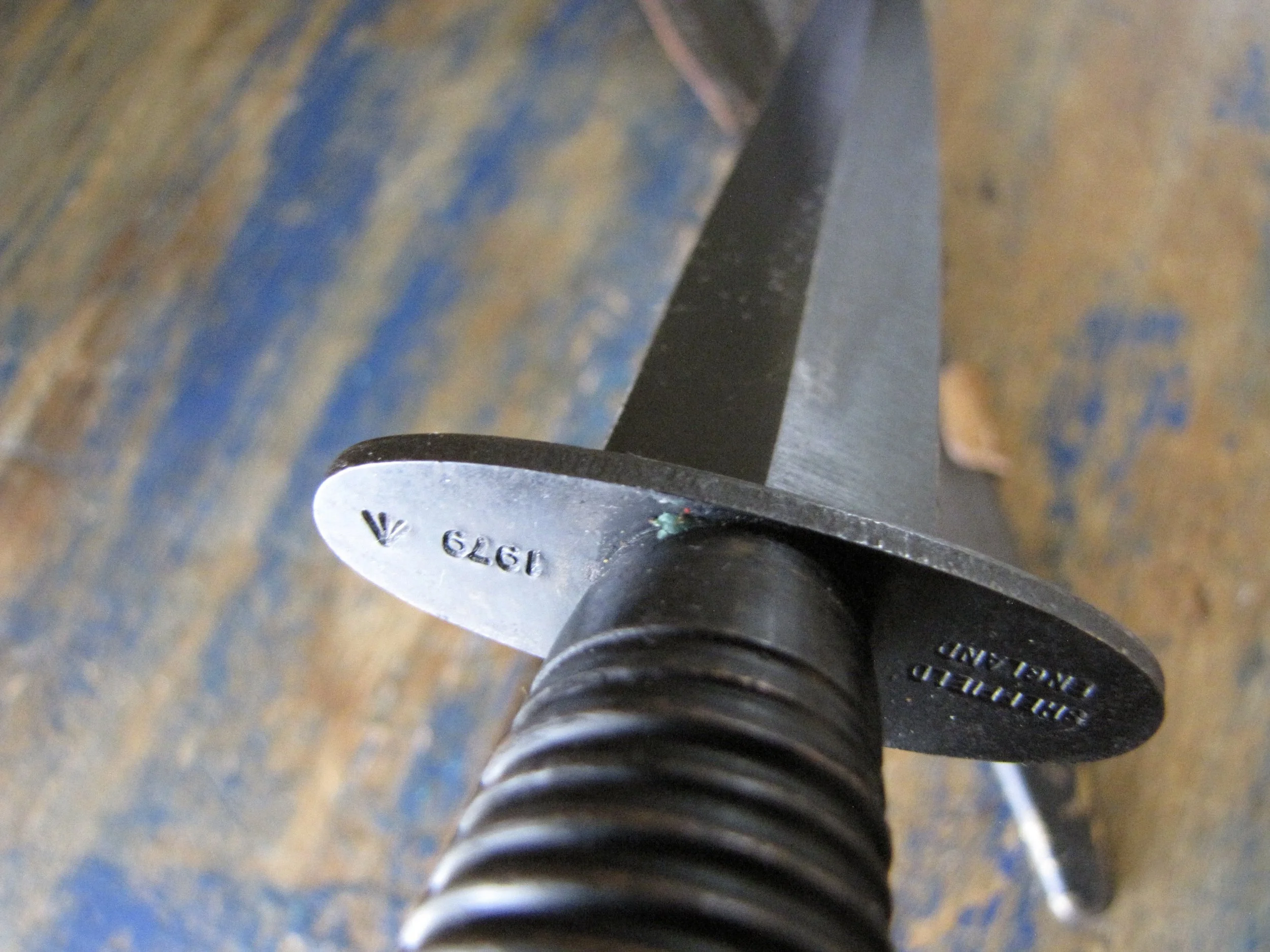 An interesting Sheffield made Third Pattern F-S, the crossguard stamped ‘⩚1979’ and ‘Sheffield England’. Complete with scabbard. The knife appears to be in unused condition and with a blade length of 6 7/8”.